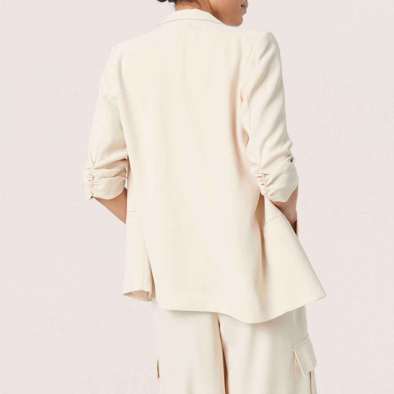 - Notched lapels, open-front, ruched three-quarter-length sleeves