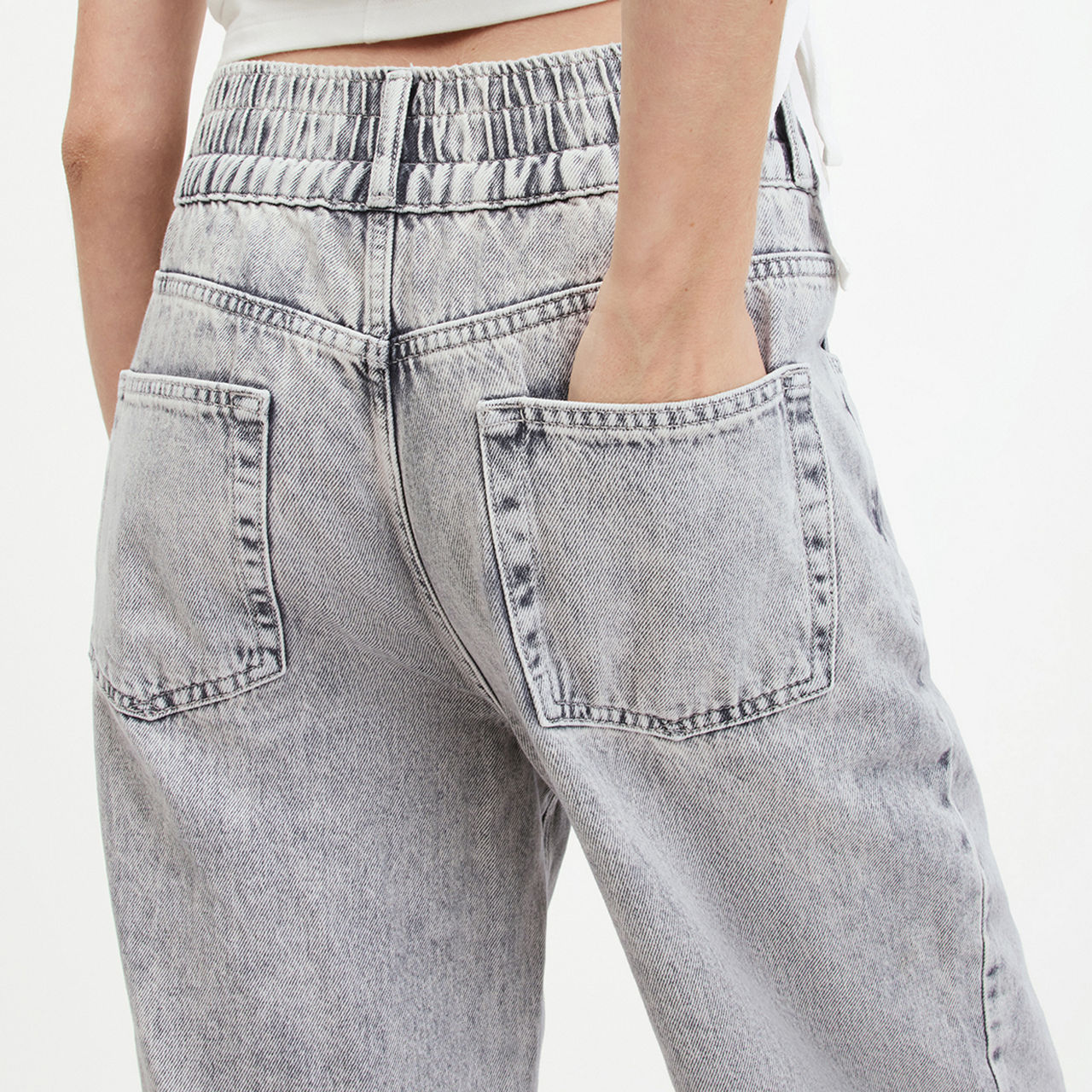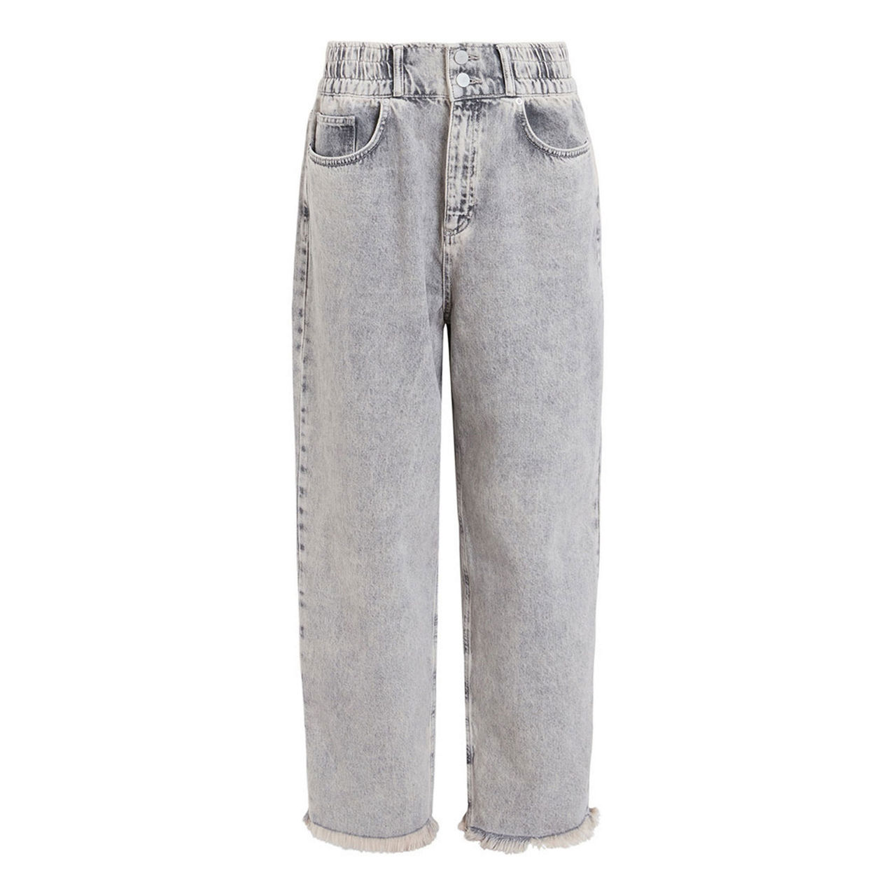 - High-rise, straight-leg, cropped length, elasticated waistband, belt loops, concealed button fastening, five-pocket styling, frayed-edge hems, washed finish