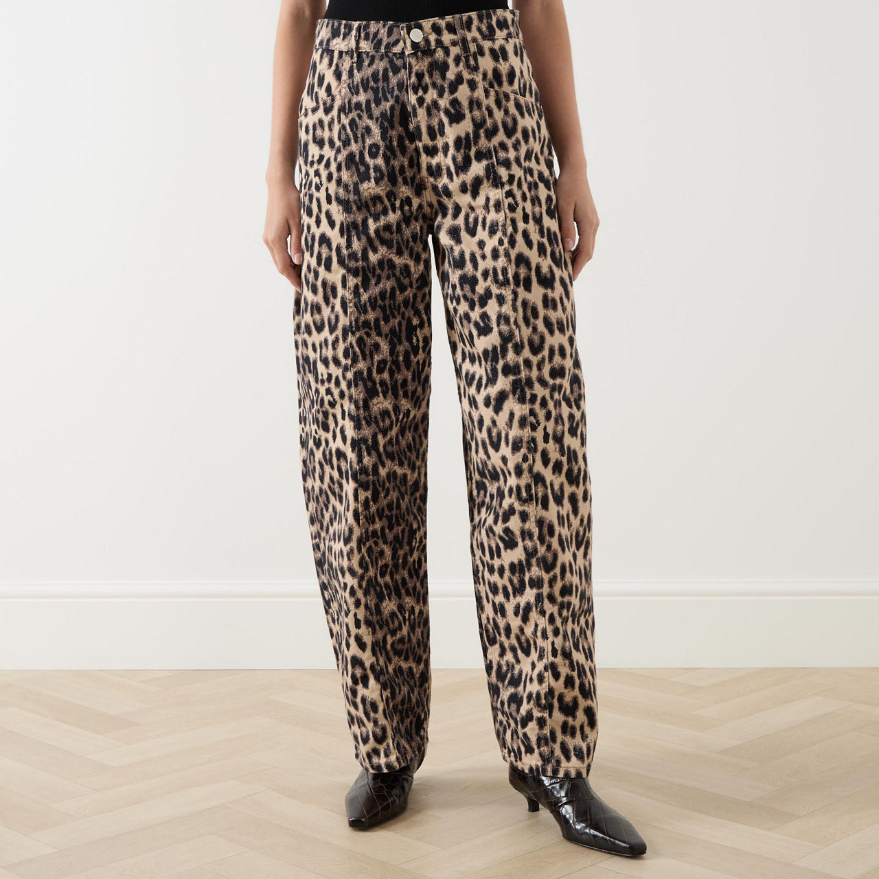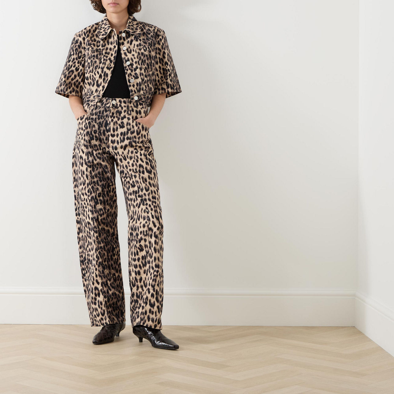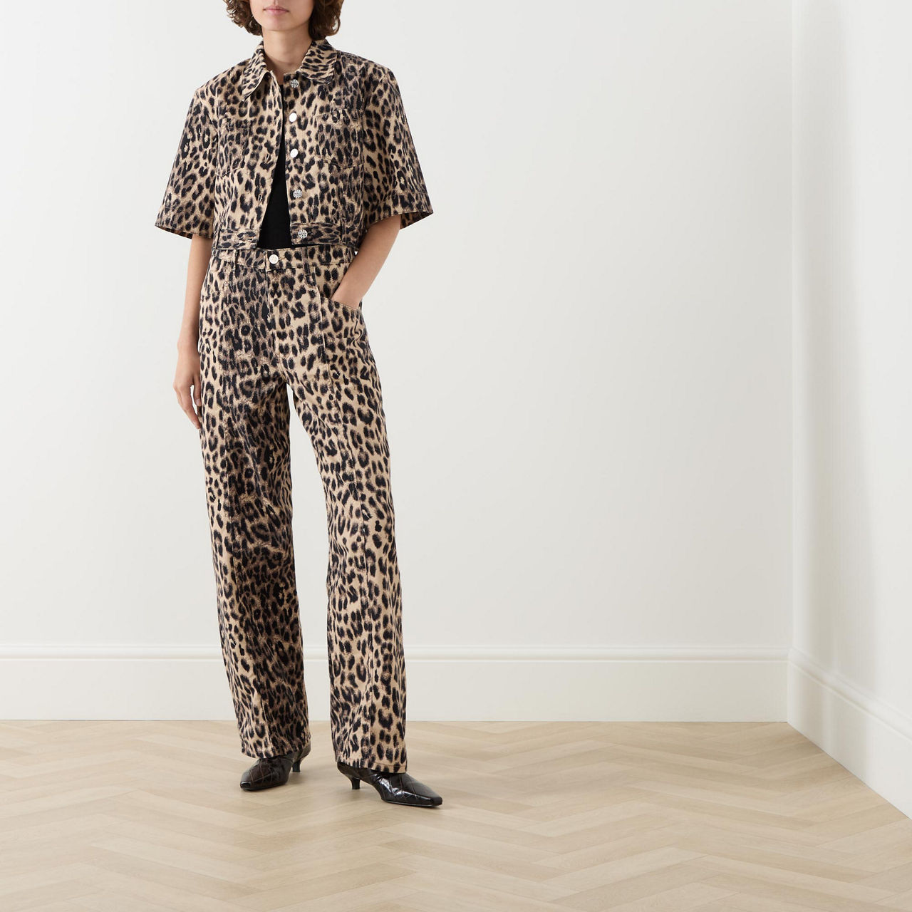 - Low-rise, straight-leg, belt loops, concealed fly with button fastening, two front pockets, two rear patch pockets, clean hems, all-over leopard print pattern