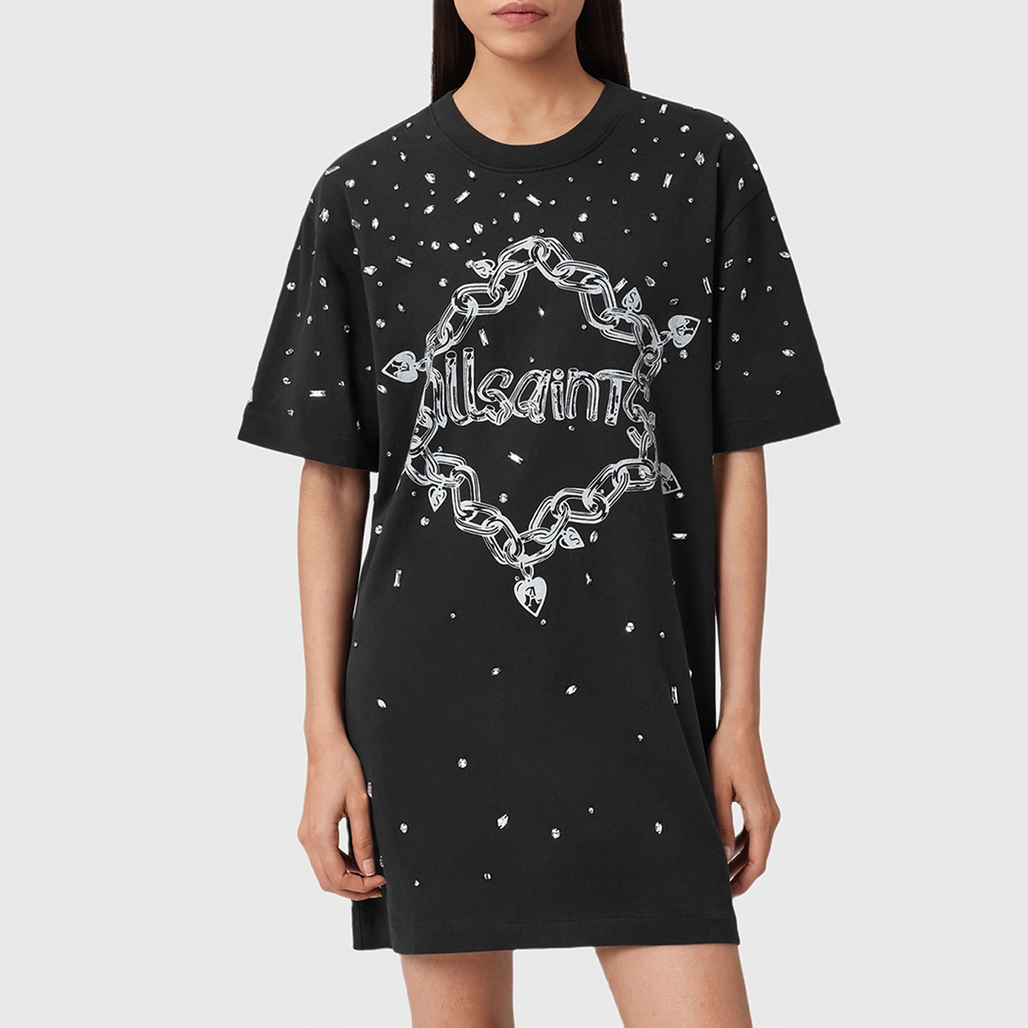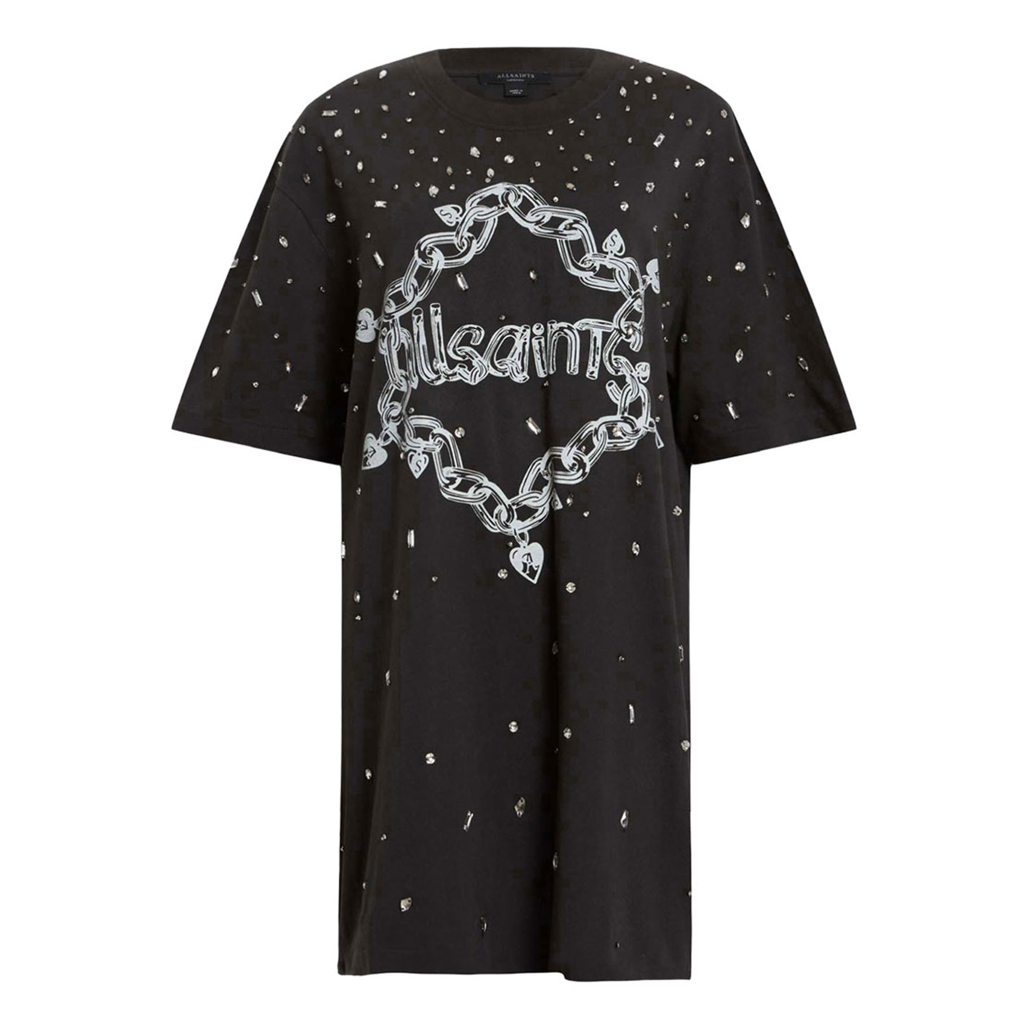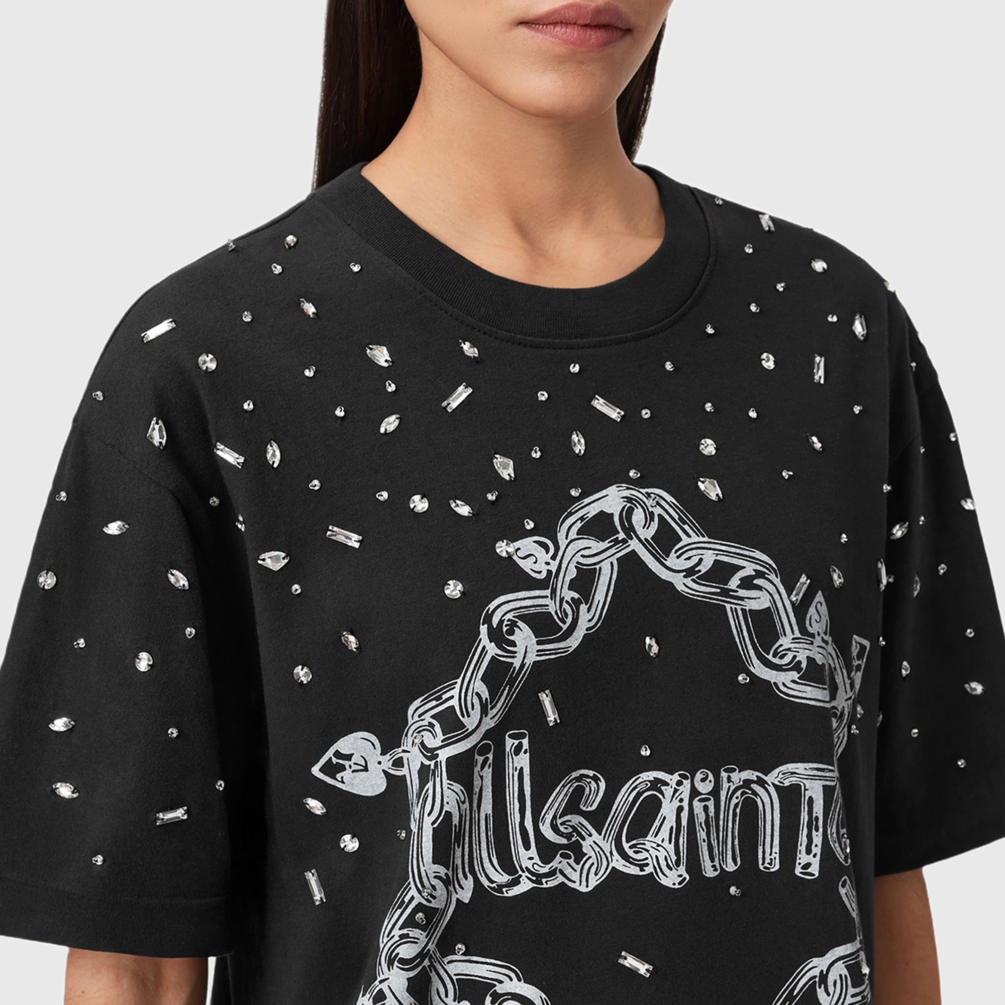 - Crew neck, dropped shoulders, short sleeves, straight hem, drip chain graphic with AllSaints branding, scattered embellishments throughout, tonal stitching, mini length