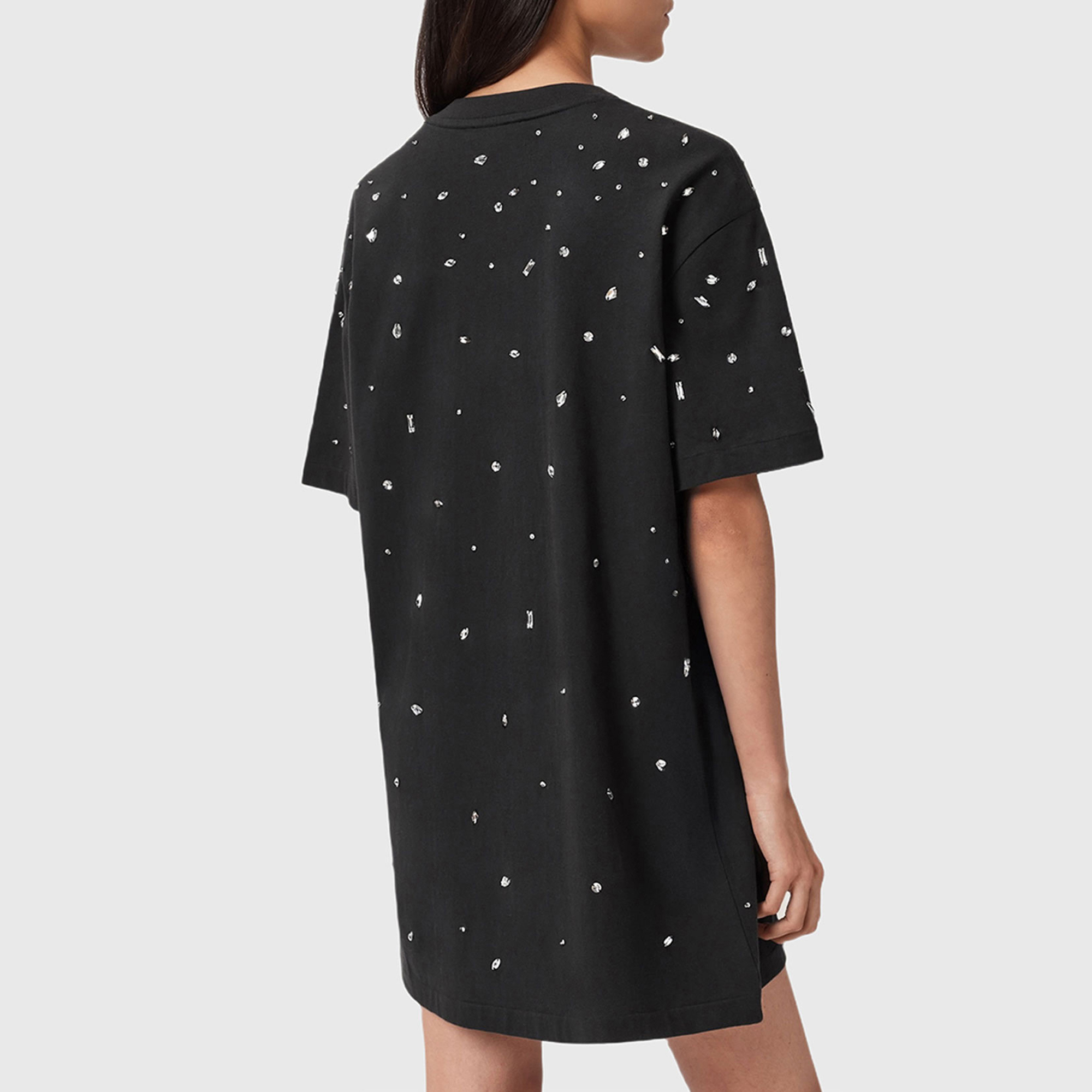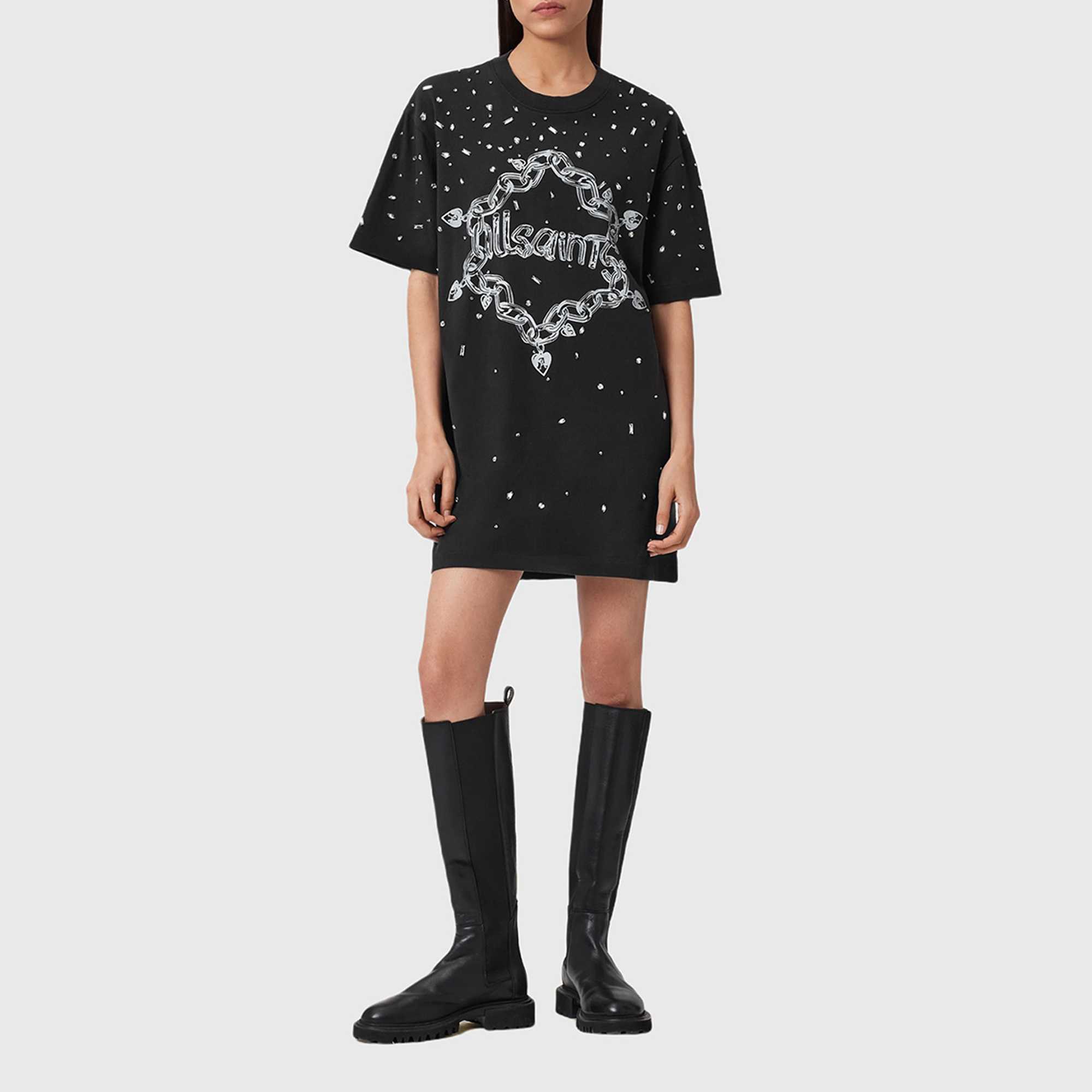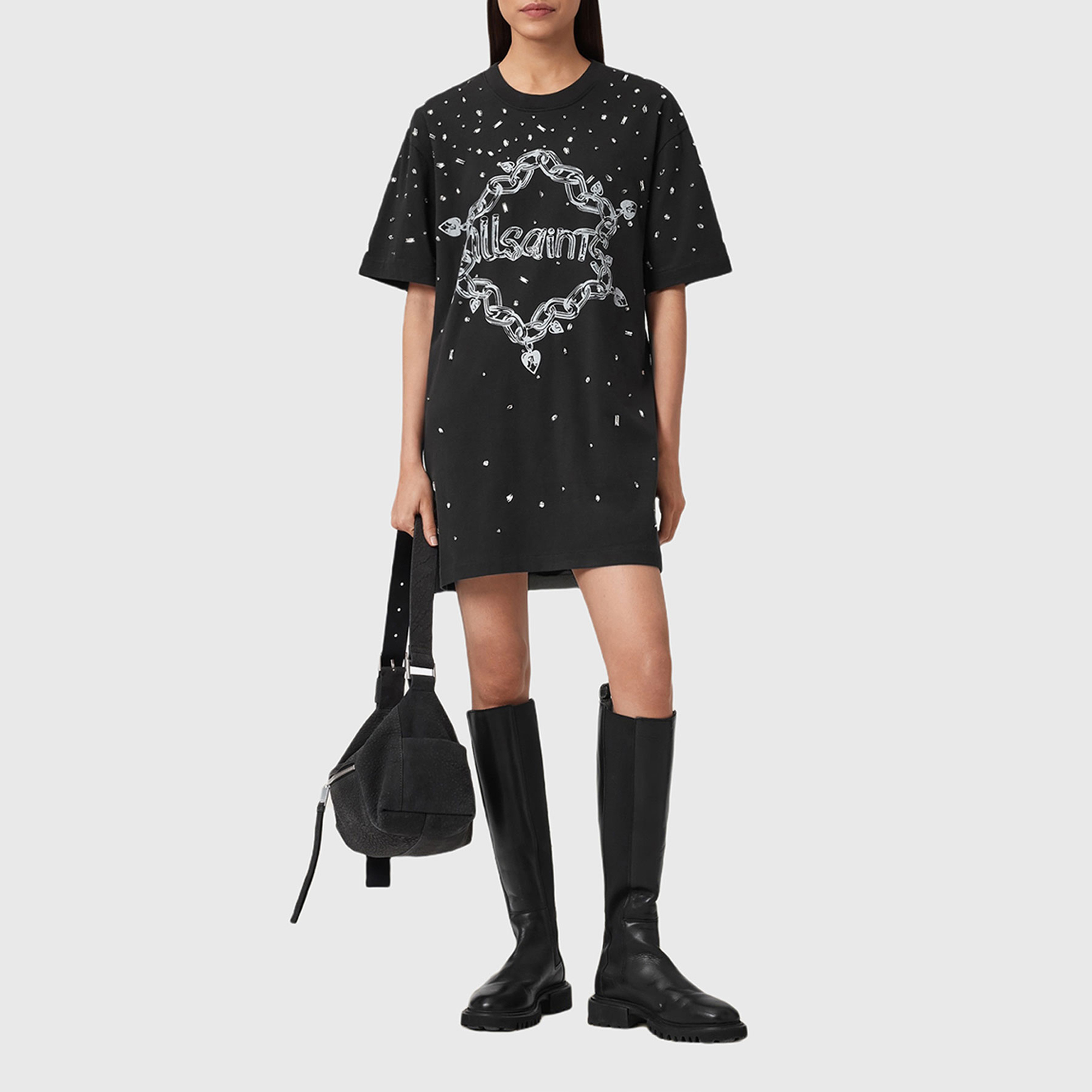 - Crew neck, dropped shoulders, short sleeves, straight hem, drip chain graphic with AllSaints branding, scattered embellishments throughout, tonal stitching, mini length