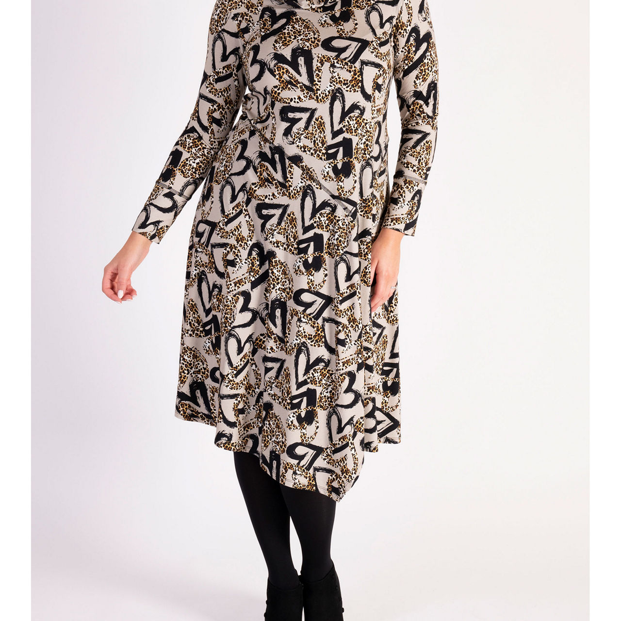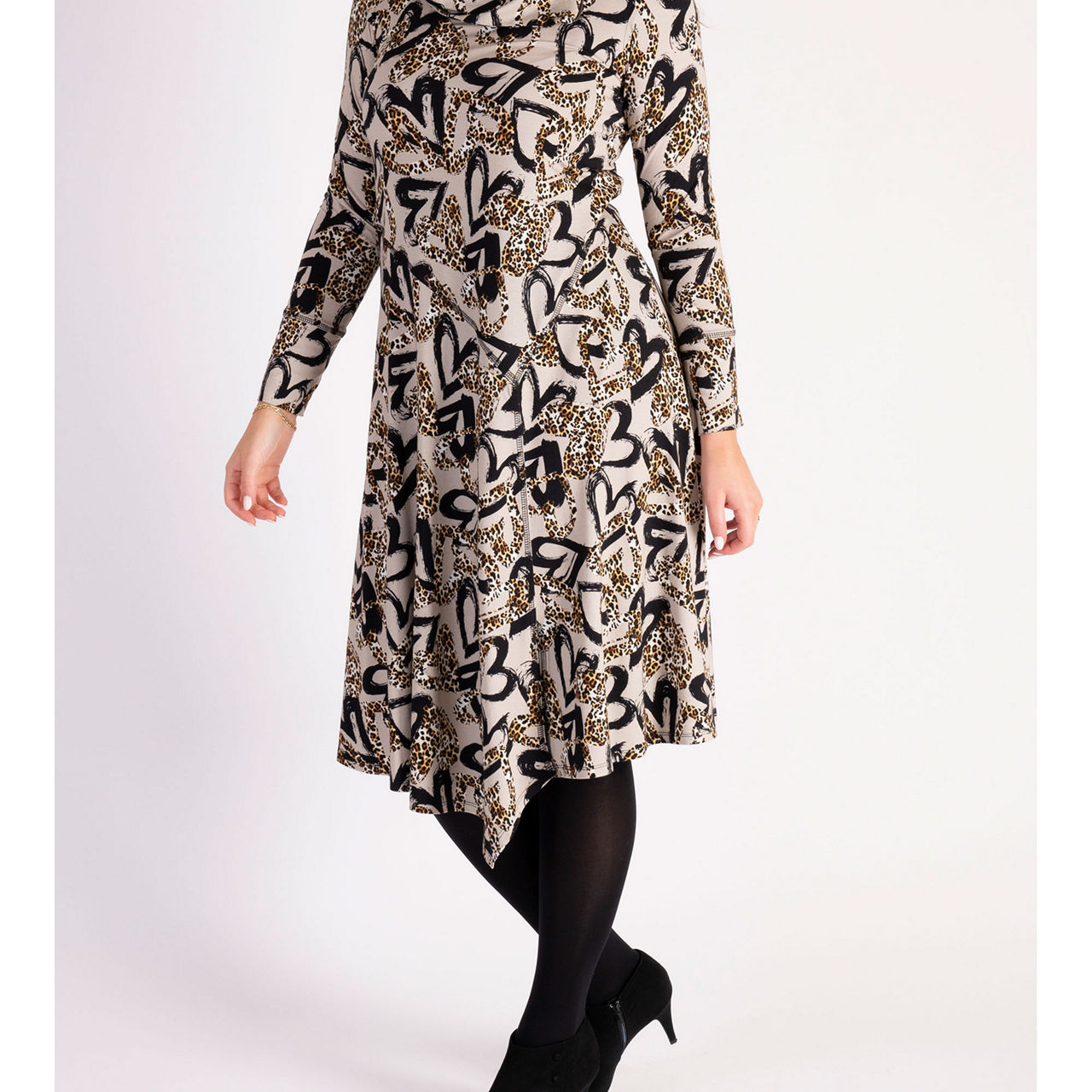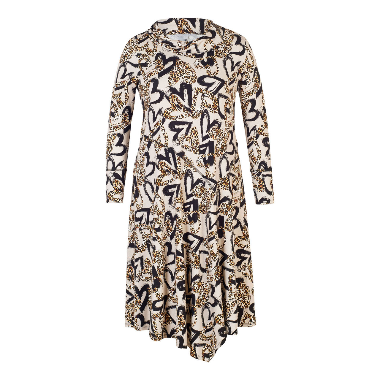 - Long sleeves, jersey fabric, seam detailing, leopard hearts print, cowl neck, metal zip fastening on the shoulder, asymmetrical hemline