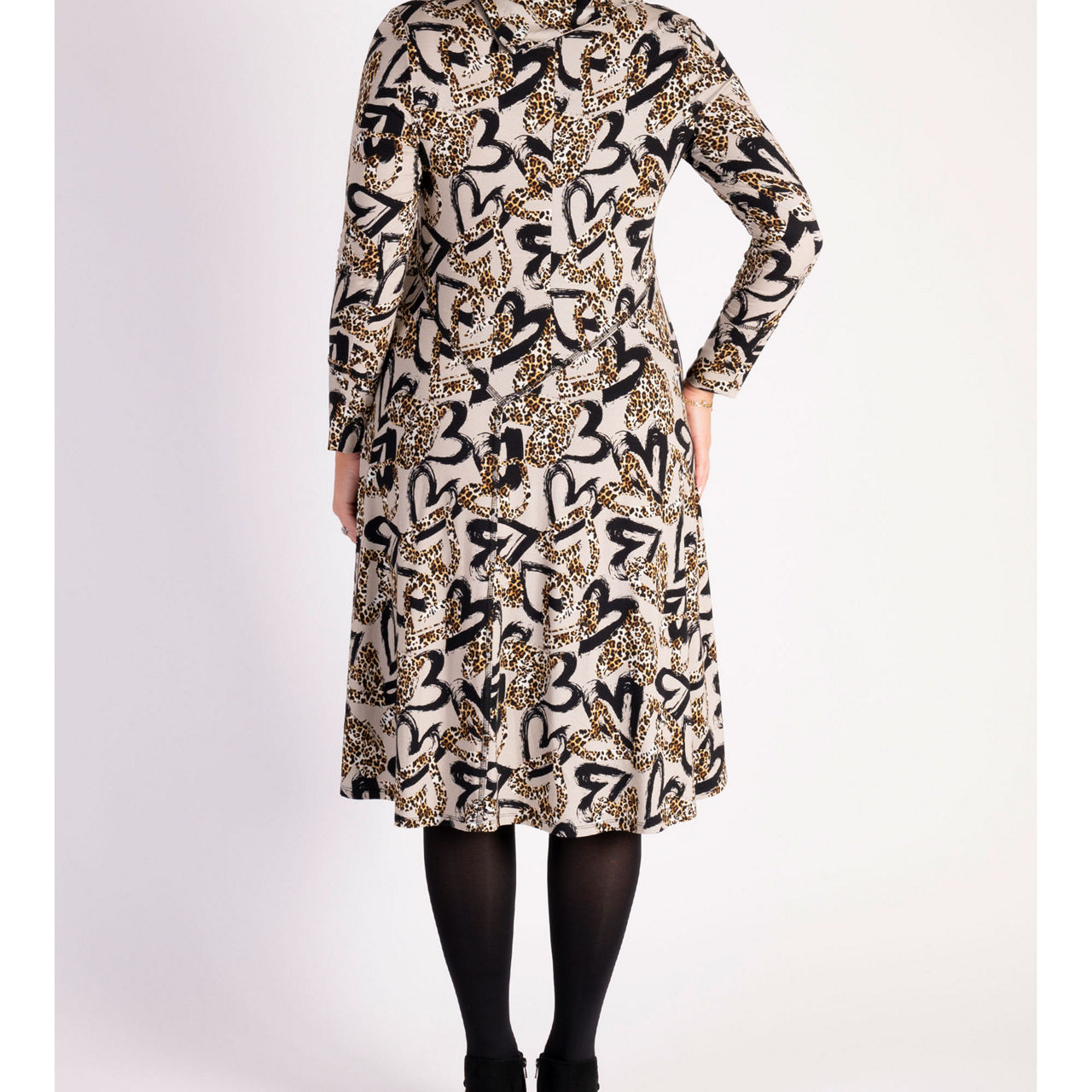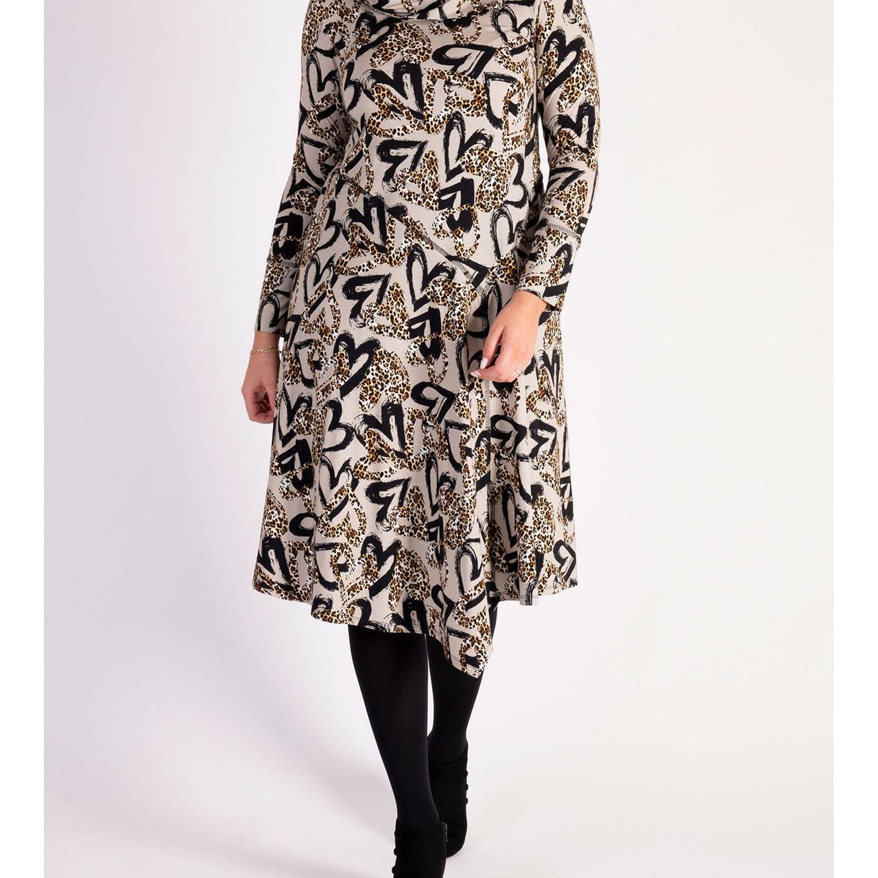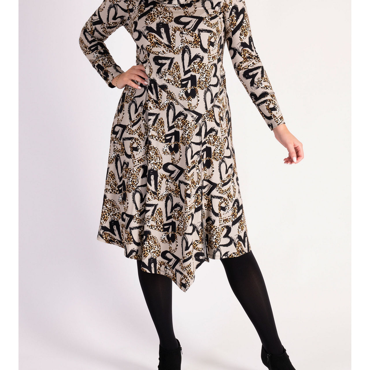 - Long sleeves, jersey fabric, seam detailing, leopard hearts print, cowl neck, metal zip fastening on the shoulder, asymmetrical hemline