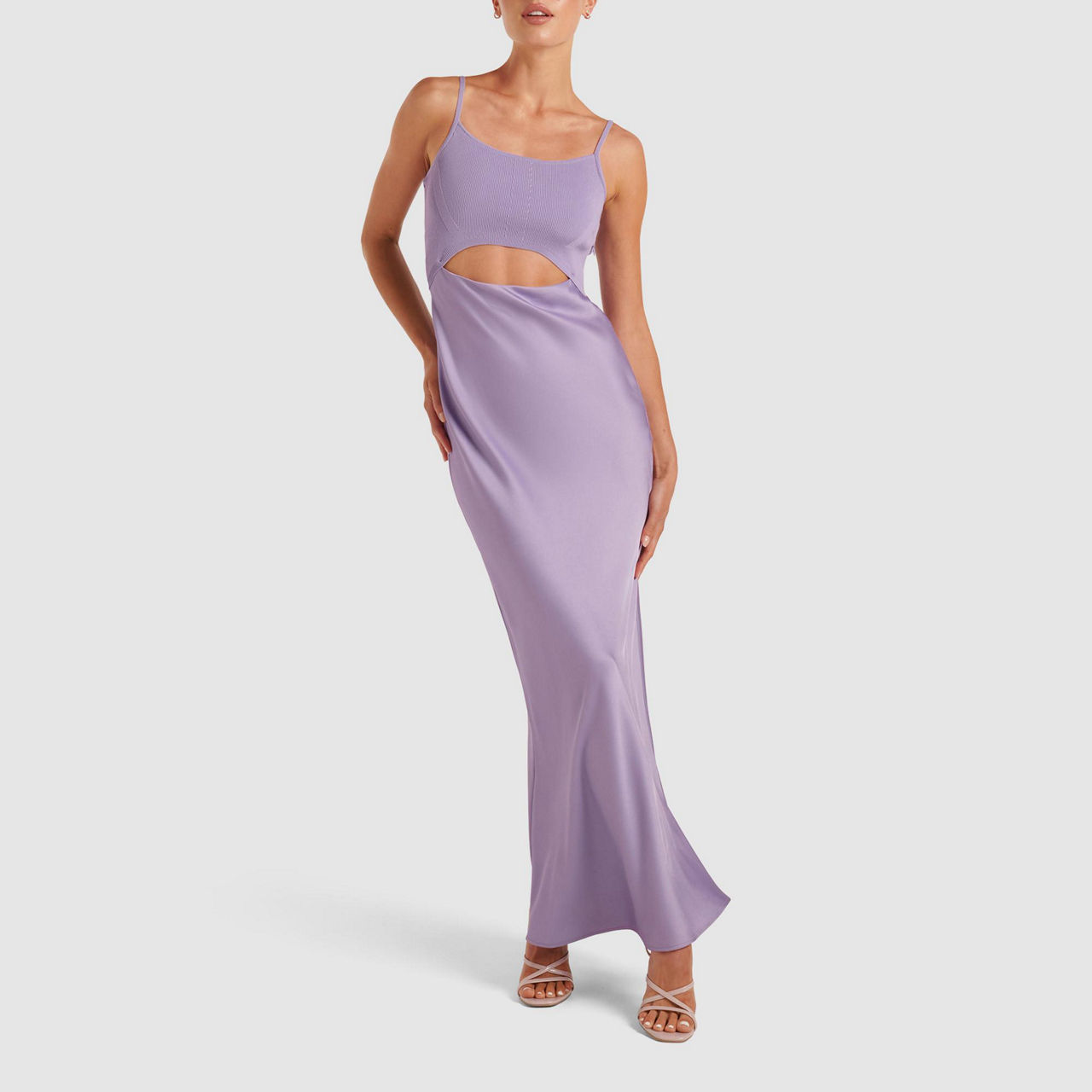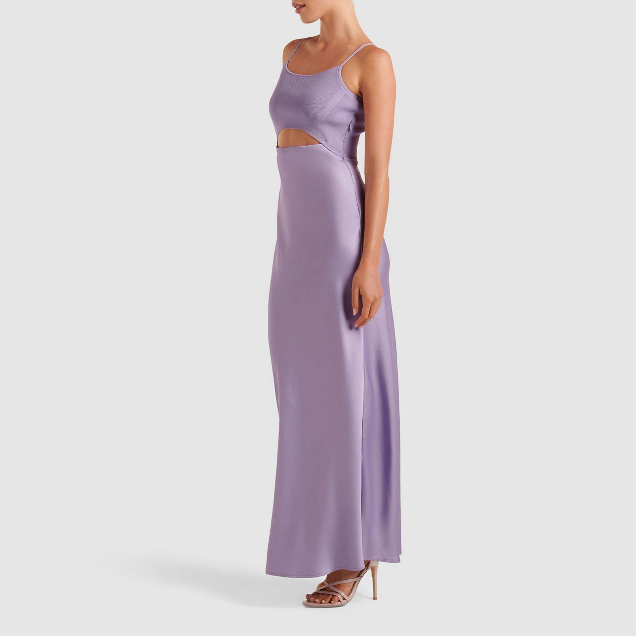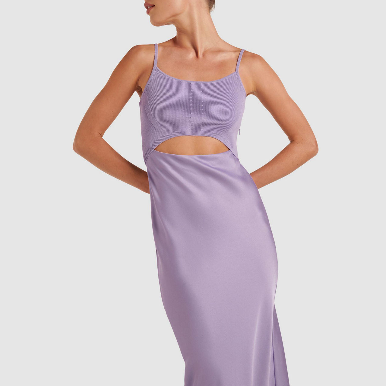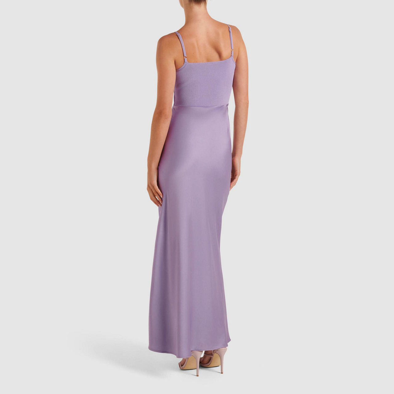 - Midi, adjustable thin straps, square neckline, cut-out detail, concealed zip fastening, knit bodice
