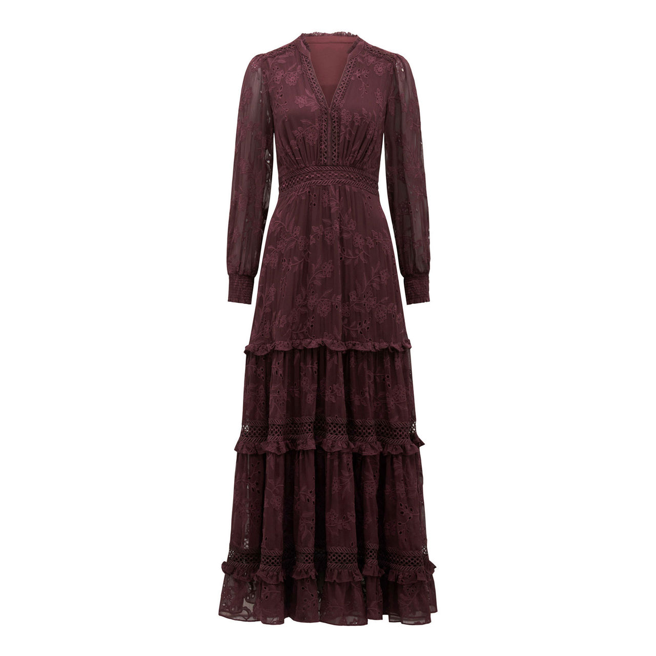 - V-neckline, stand collar with a ruffle trim, embroidery detail, long sleeves, midi length, concealed side zip, lined