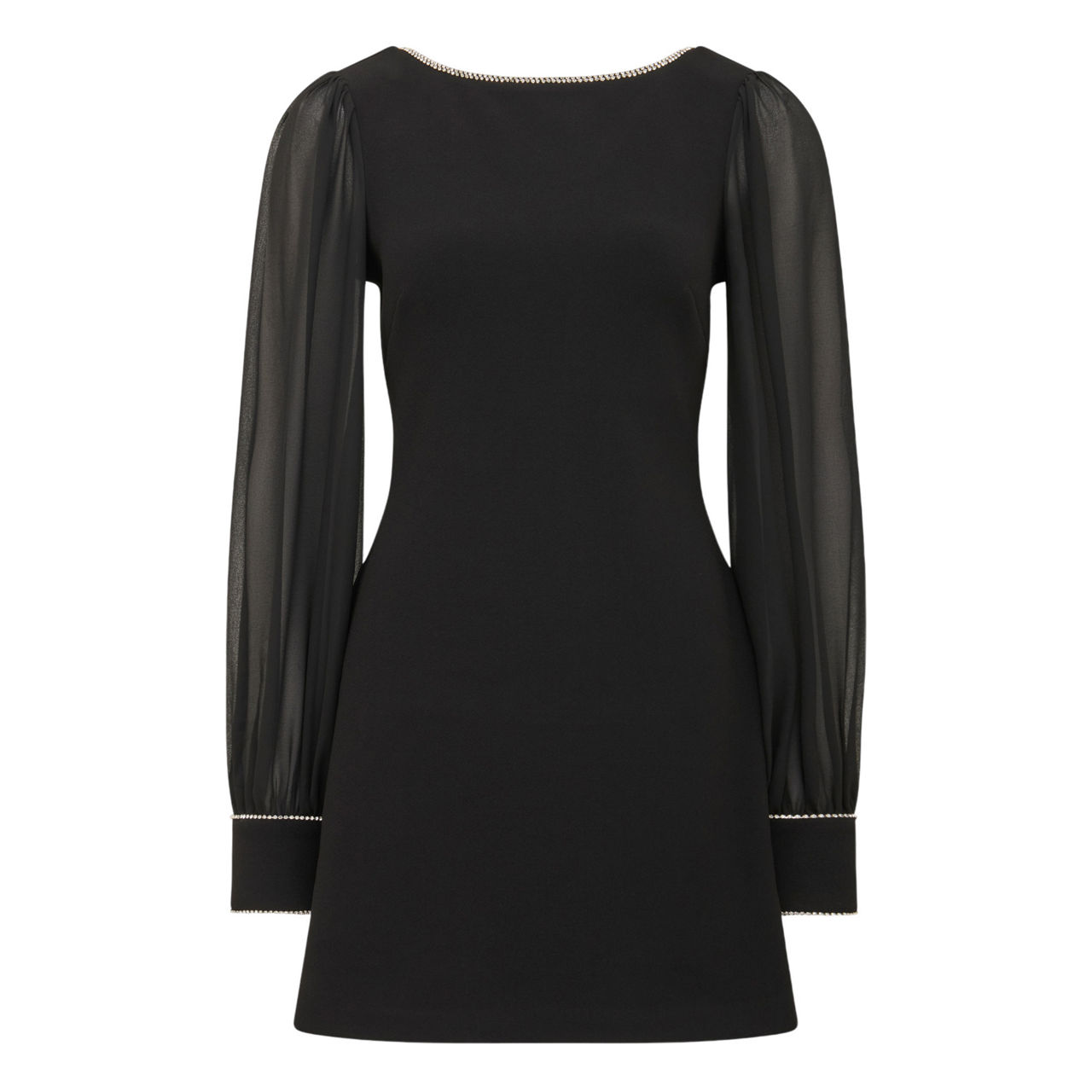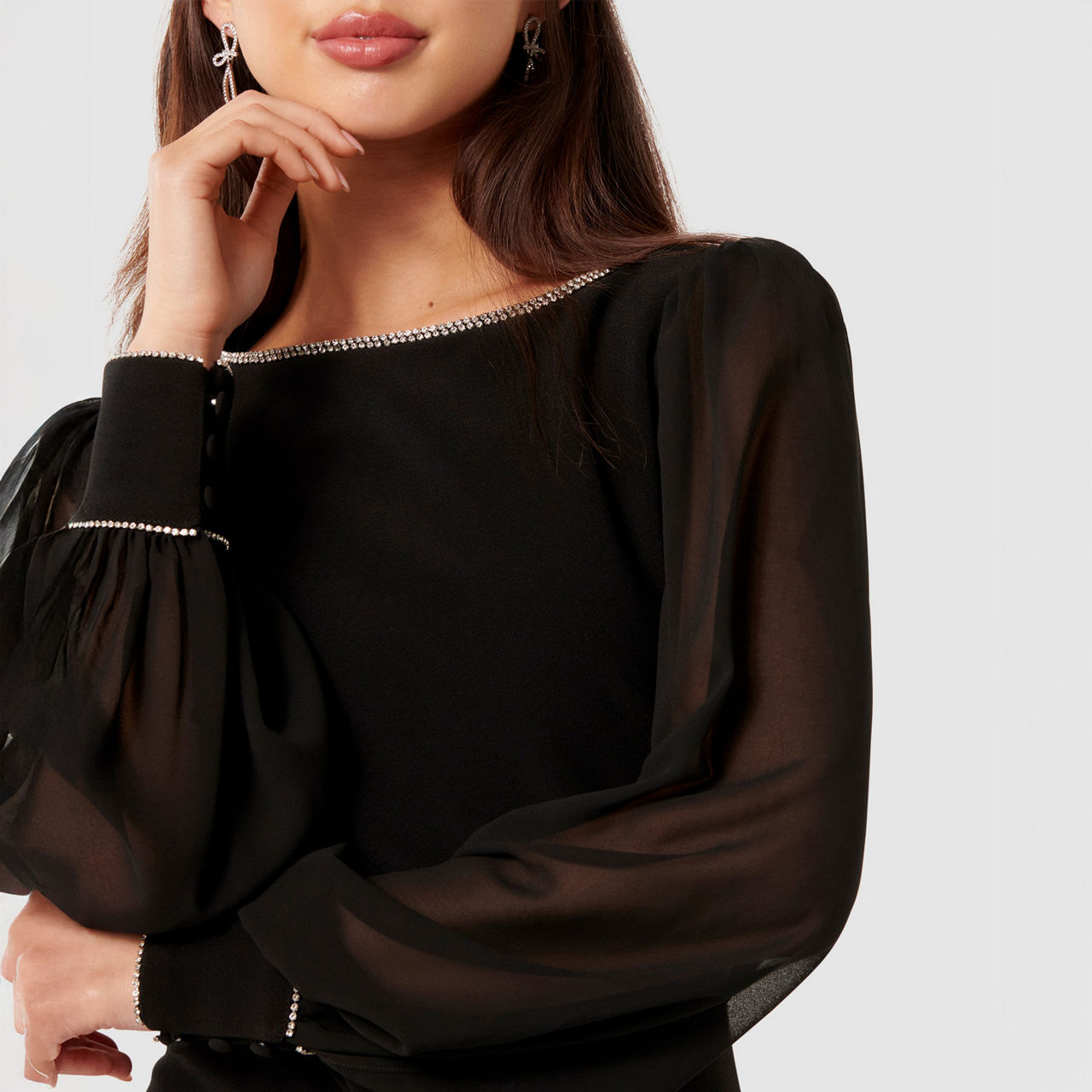 - Diamanté embellishment, scooped neckline, long semi-sheer sleeves, A-line shape