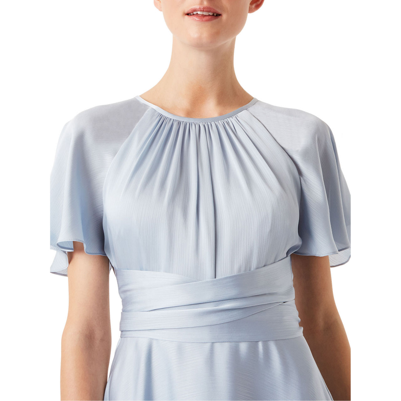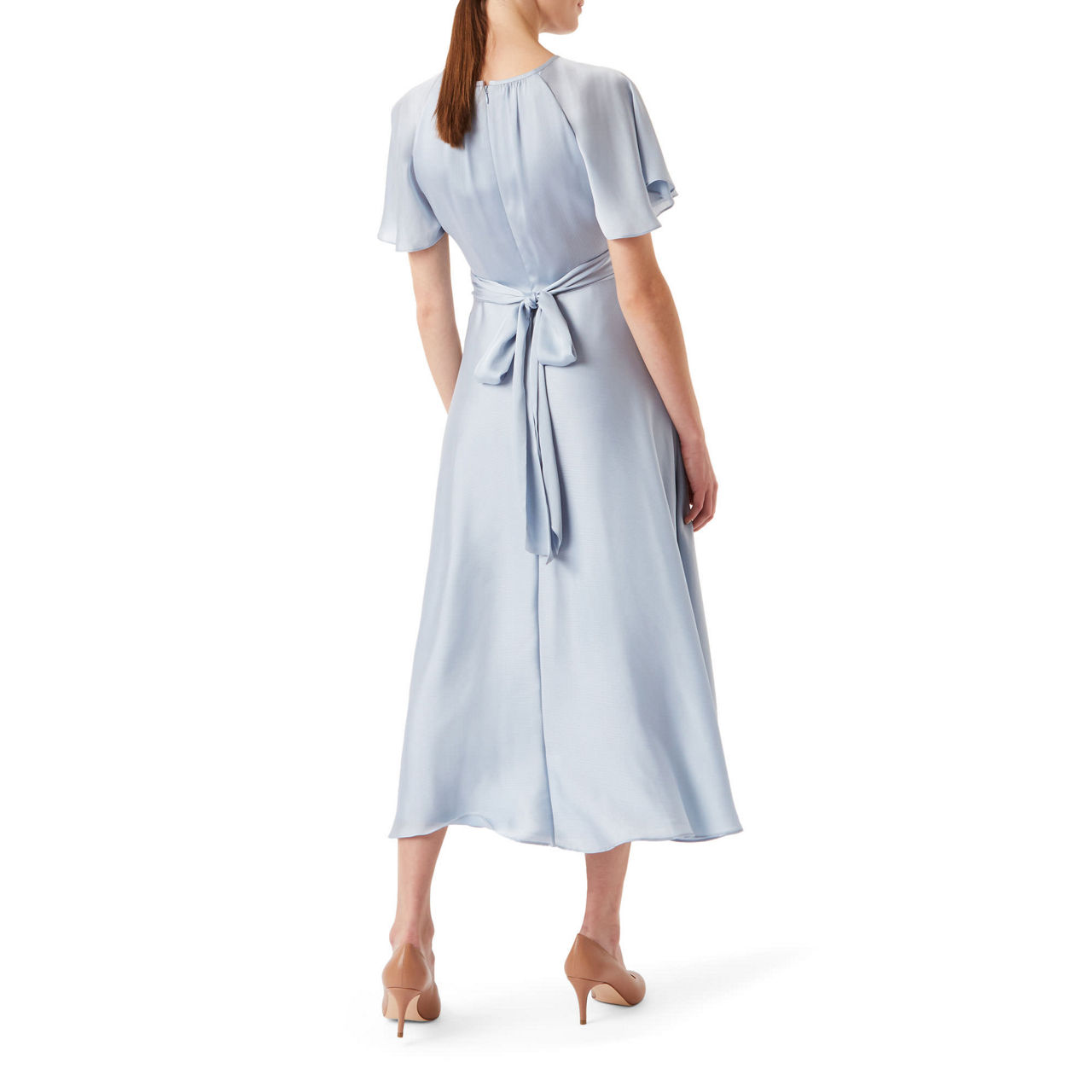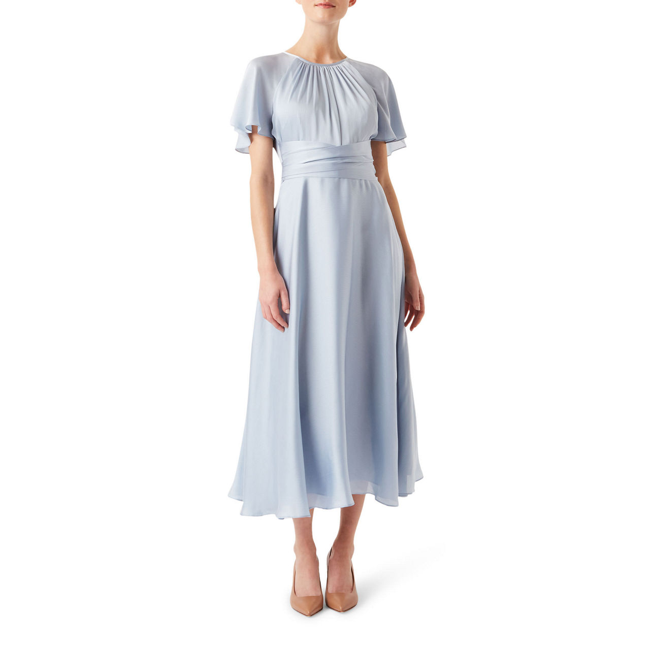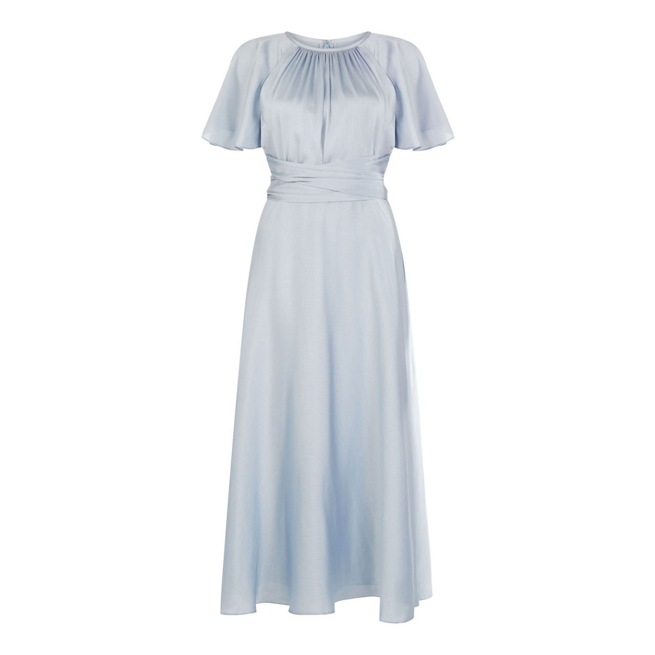 From weddings to garden parties, the Mira dress is an ethereal choice. In a beautiful pale blue hue, it's cut to a feminine fit and flare shape that falls to a long midi length. Crafted from lustrous textured satin, pleat detailing and frill sleeves add a subtle final flourish. Fully lined. Concealed zip back fastening with keyhole detail.