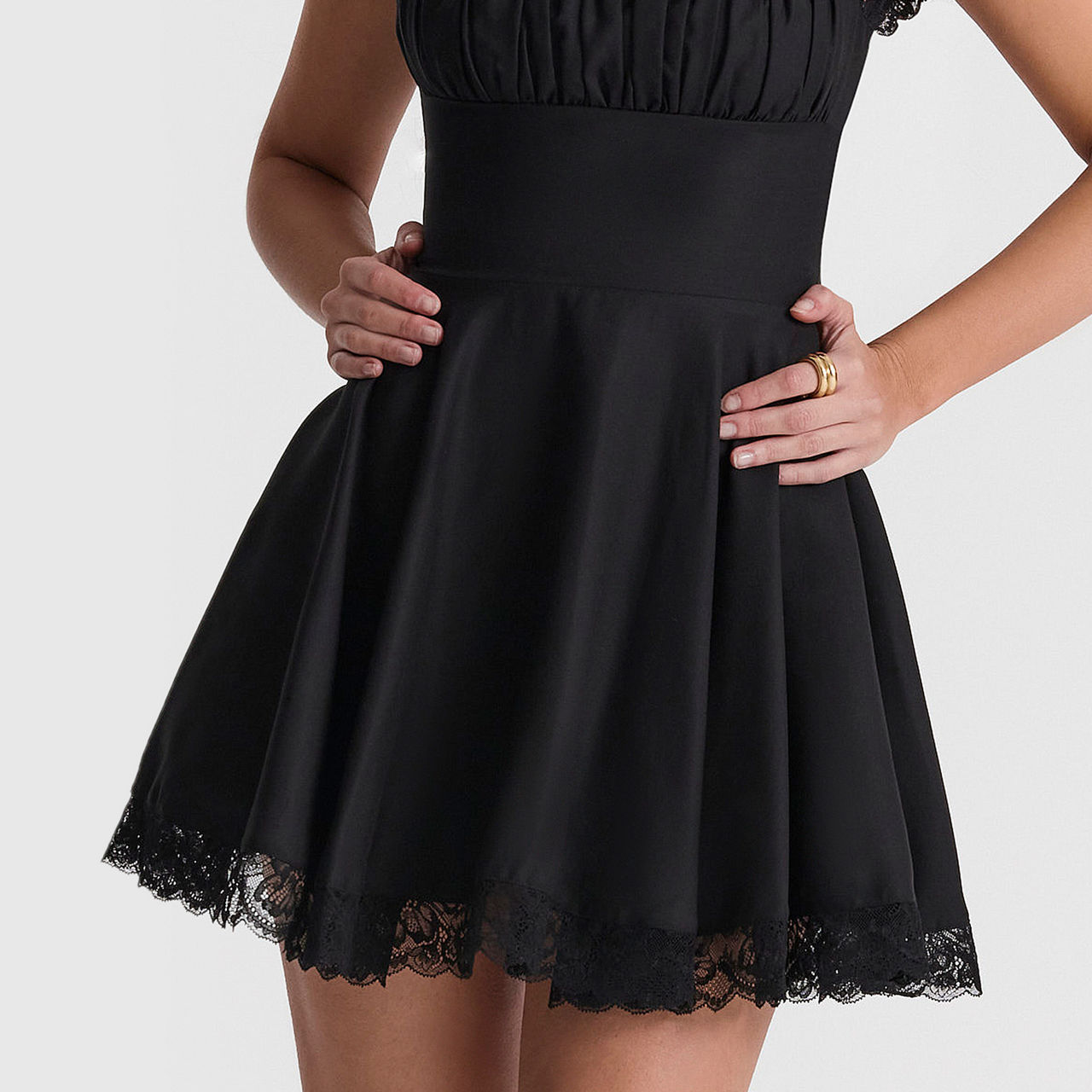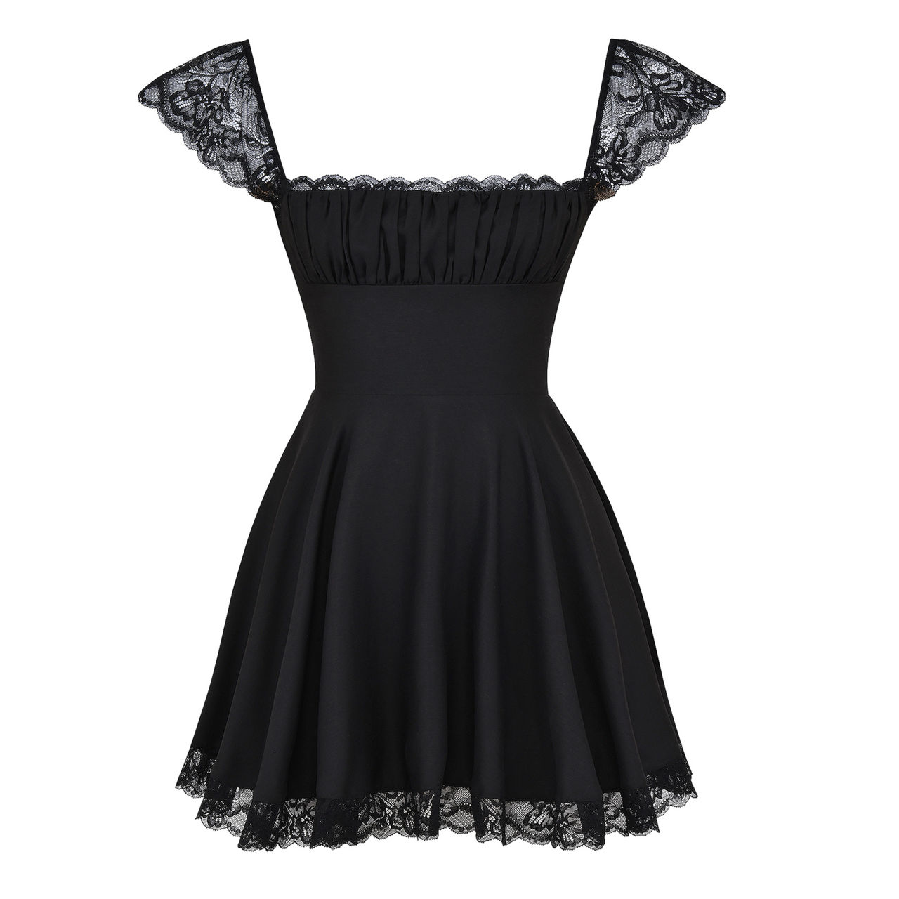 - Squared neckline, cap sleeves, mini length, side boning, lace details, zip fastening at back