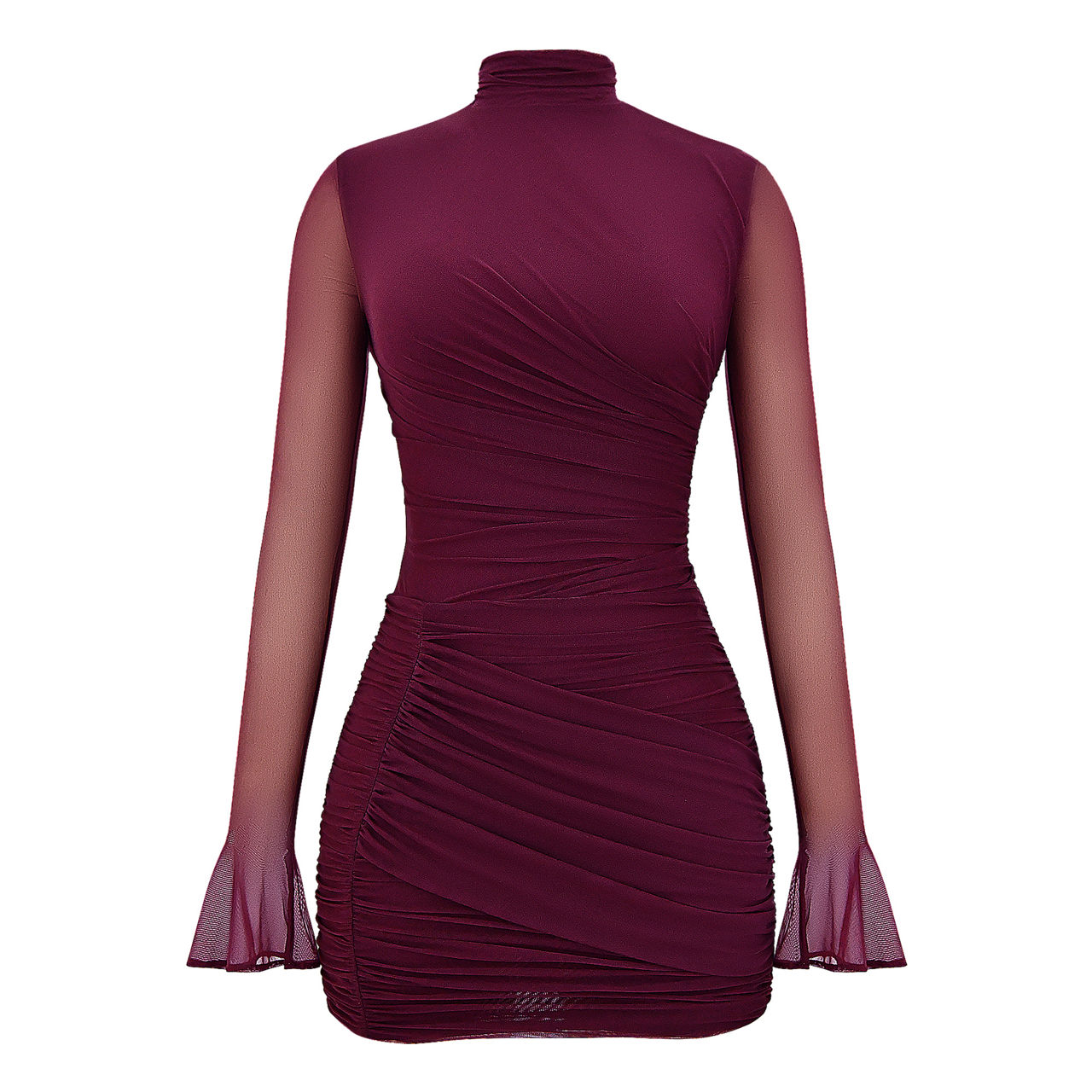- Long mesh sleeves, high funnel neckline, gathered bodice, fluted cuffs, mini length