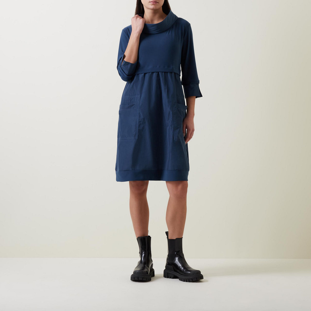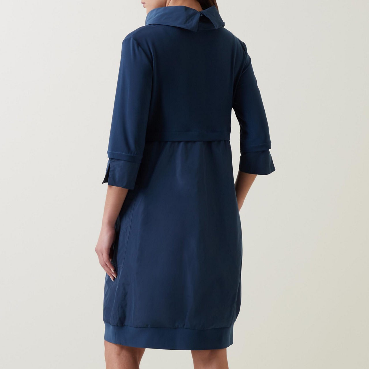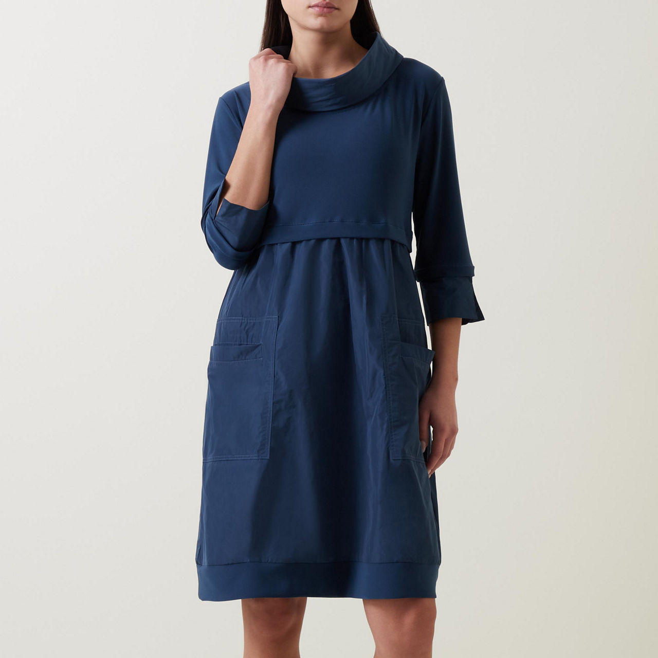 - Mock neckline, three-quarter-length sleeves, pockets