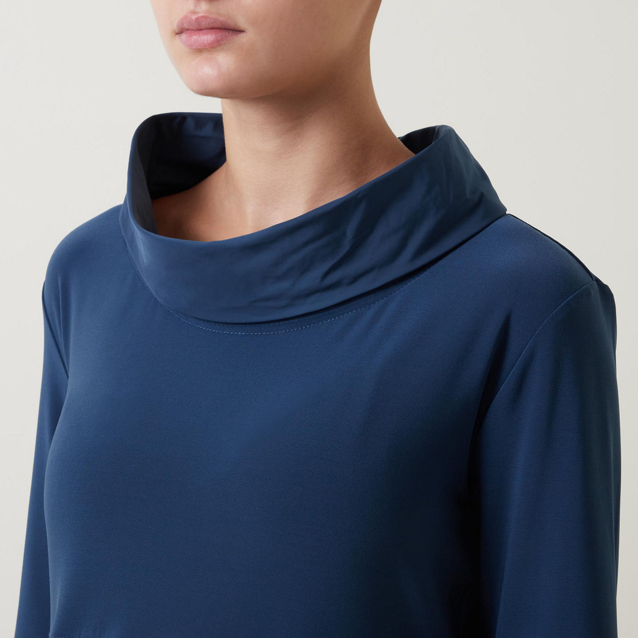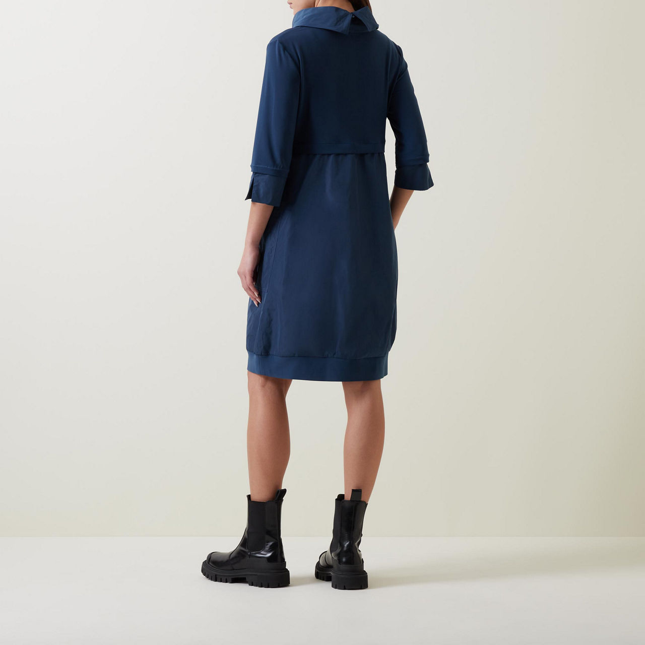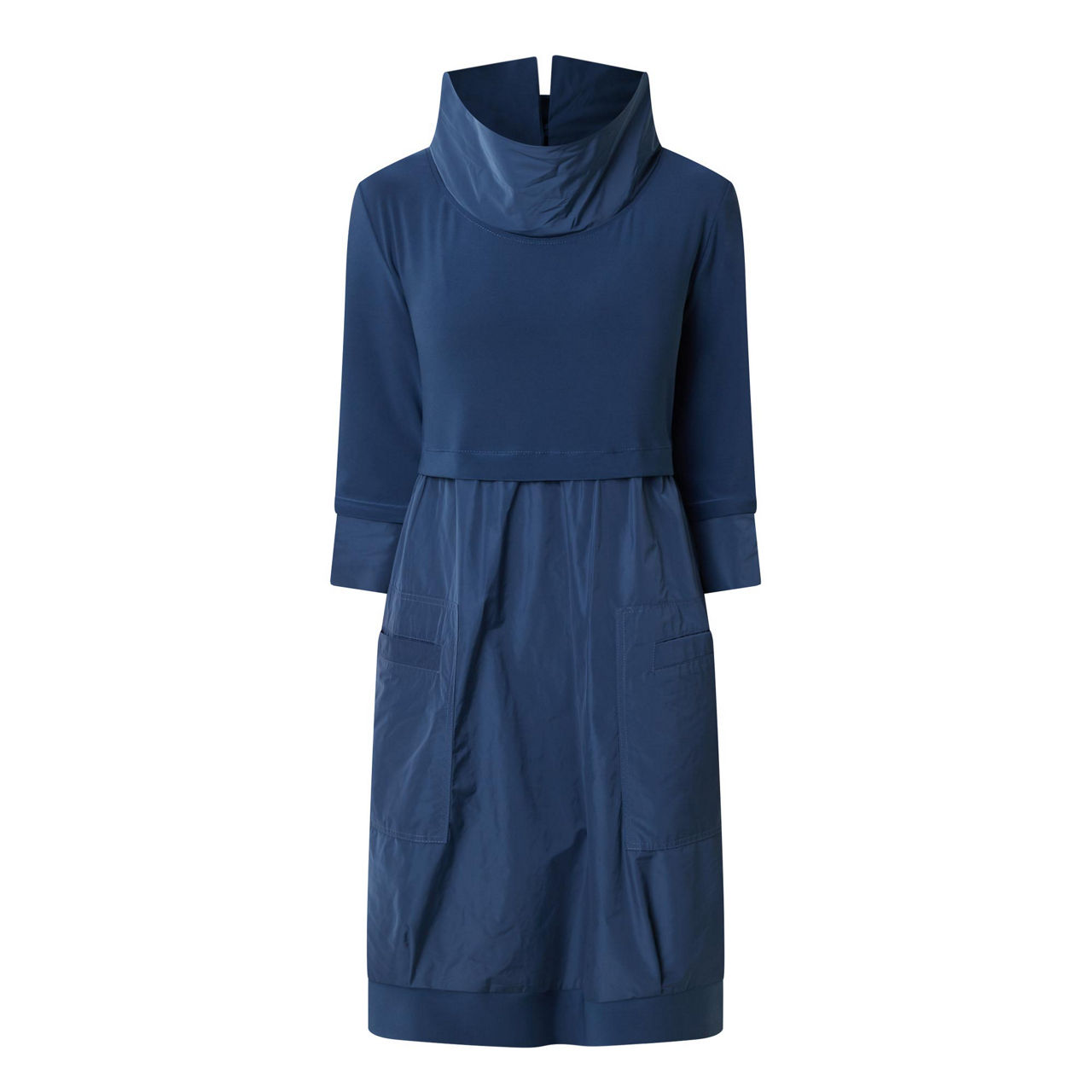 - Mock neckline, three-quarter-length sleeves, pockets