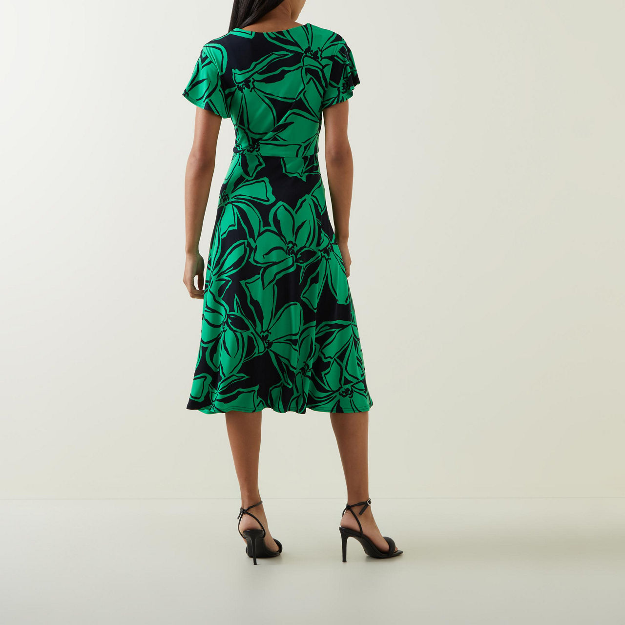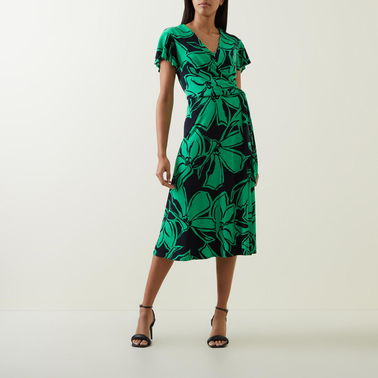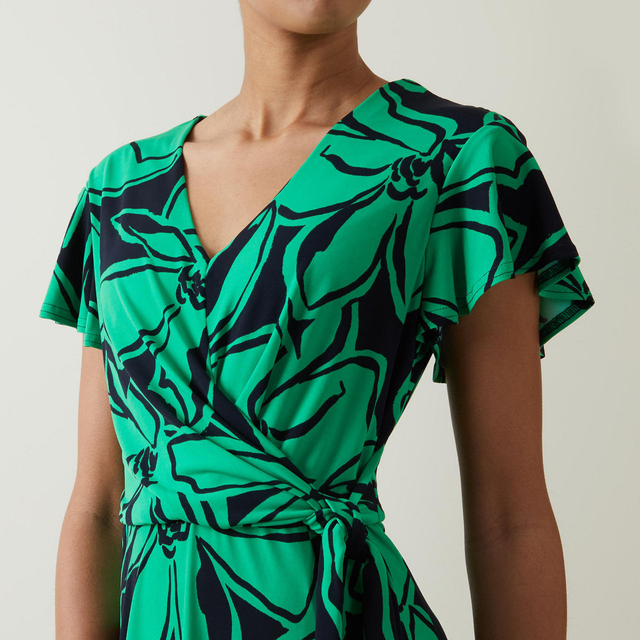 - Mid-length sleeves, V-neckline, self-fabric belt, wrap style, floral-leaf pattern, smooth fabric