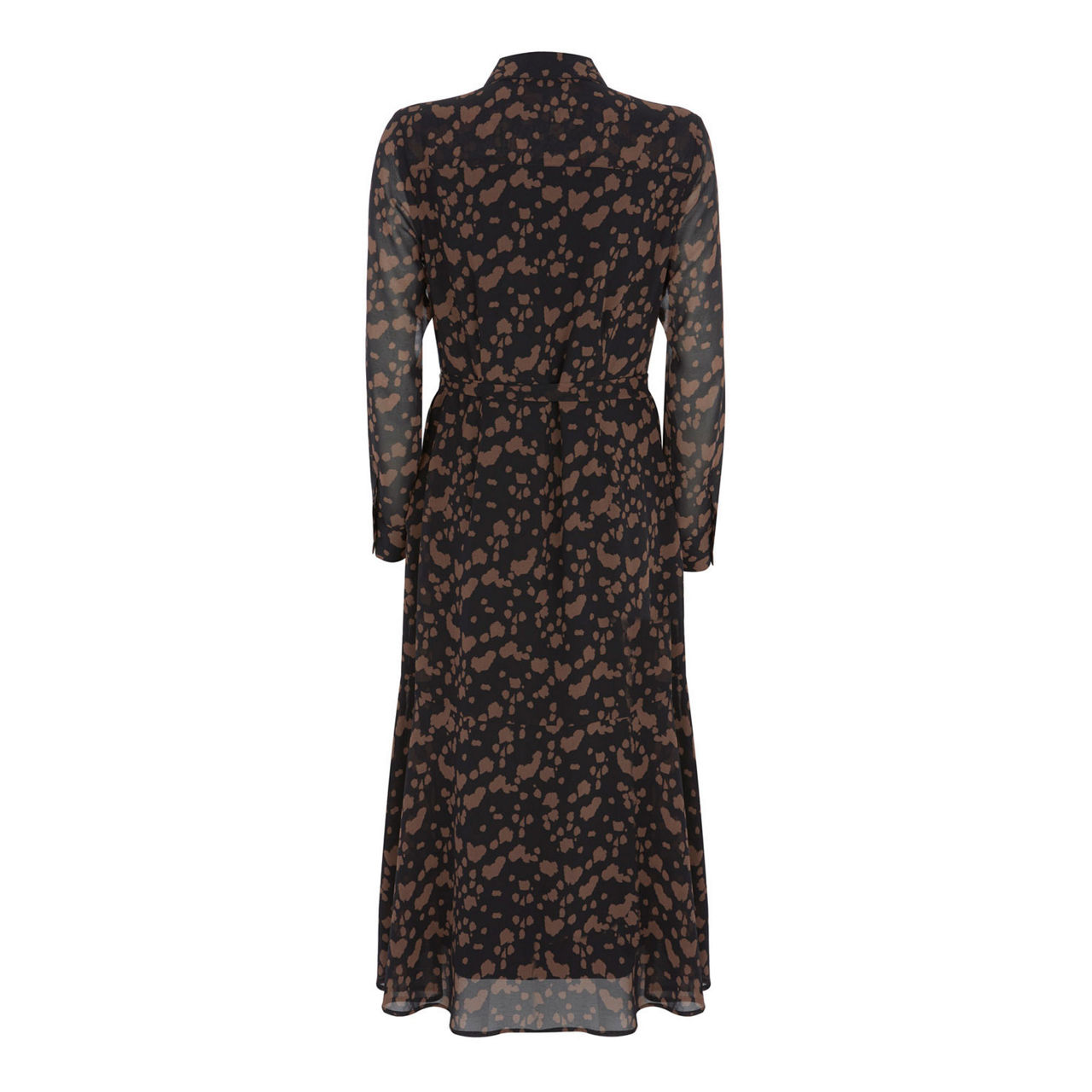 Cut from airy black chiffon in a loose-fitting silhouette, this long-sleeved shirt dress is printed all over with abstract animal rust motifs for a subtle nod to the trend. It's constructed with a button-down front and cuffs and features two utility pockets for added coverage. Wear yours slightly unbuttoned, with rolled-up cuffs and the tonal belt cinched into a loose bow.