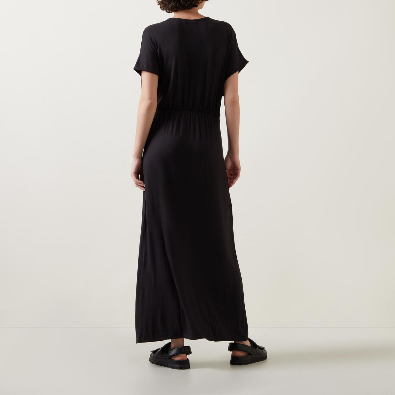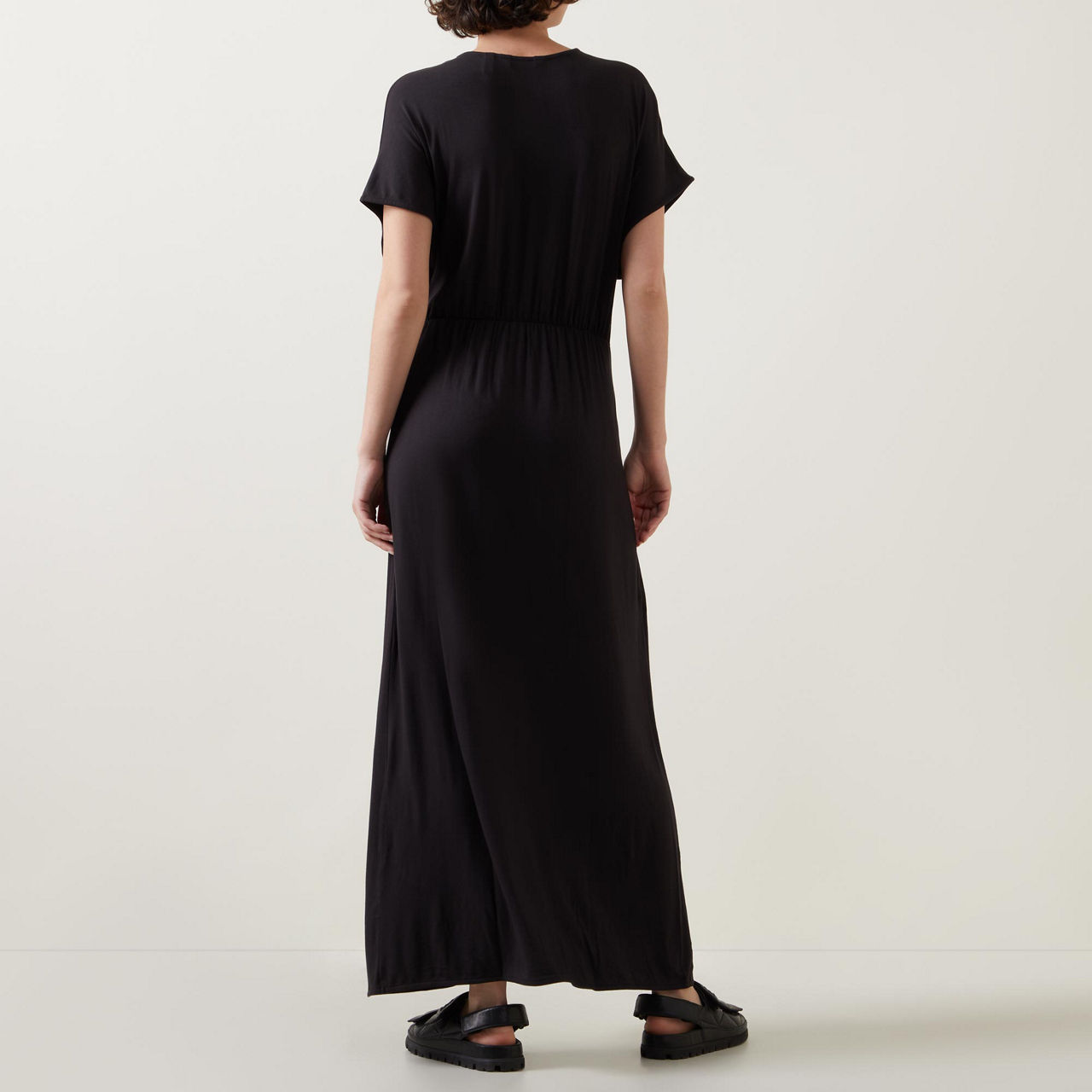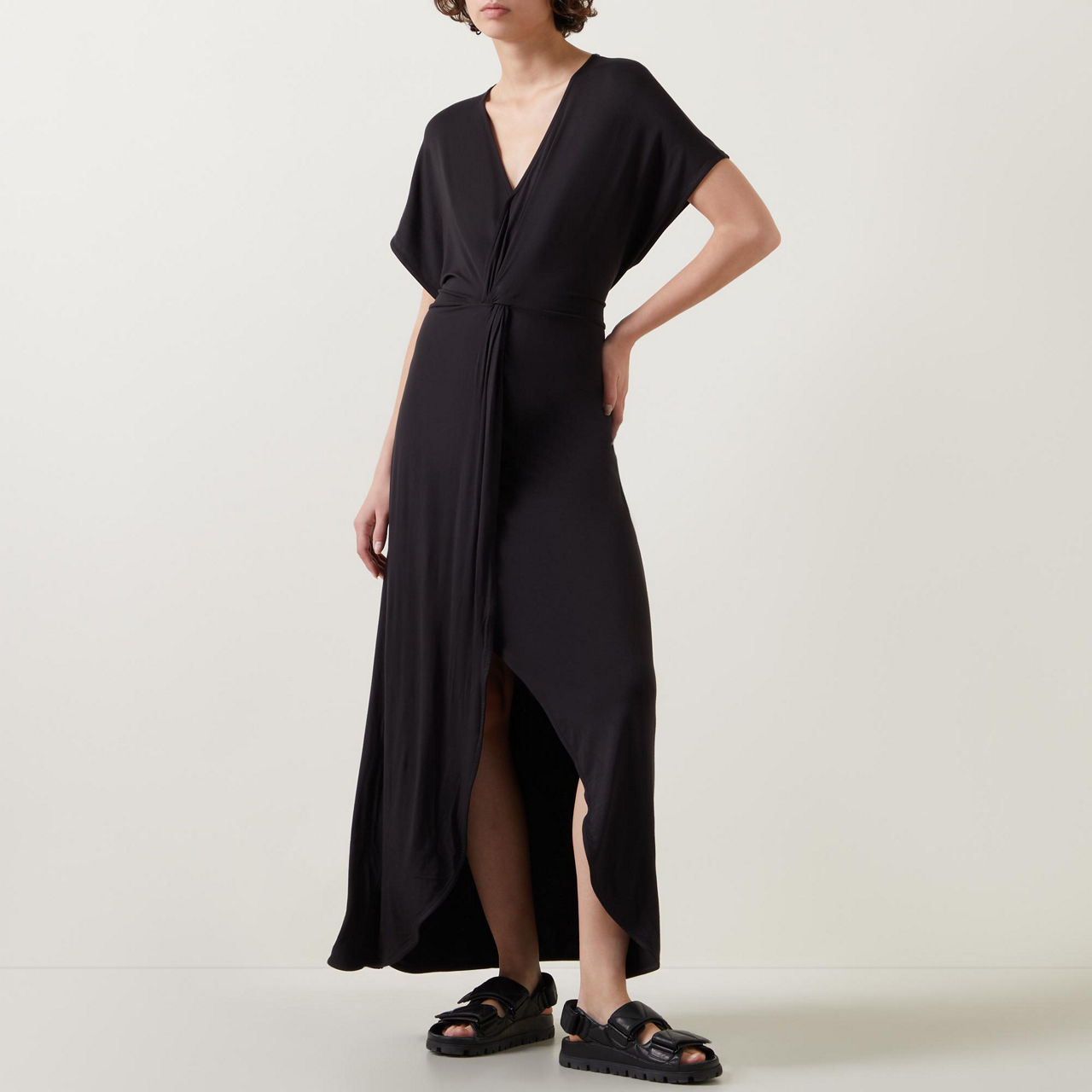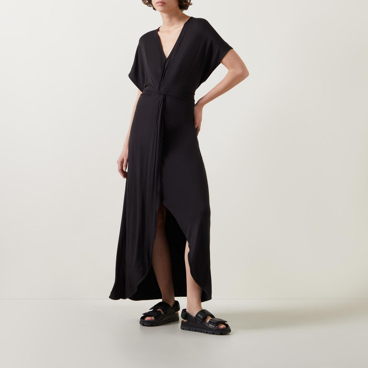 - Twist front, V-neckline, short sleeves, maxi length, front slit