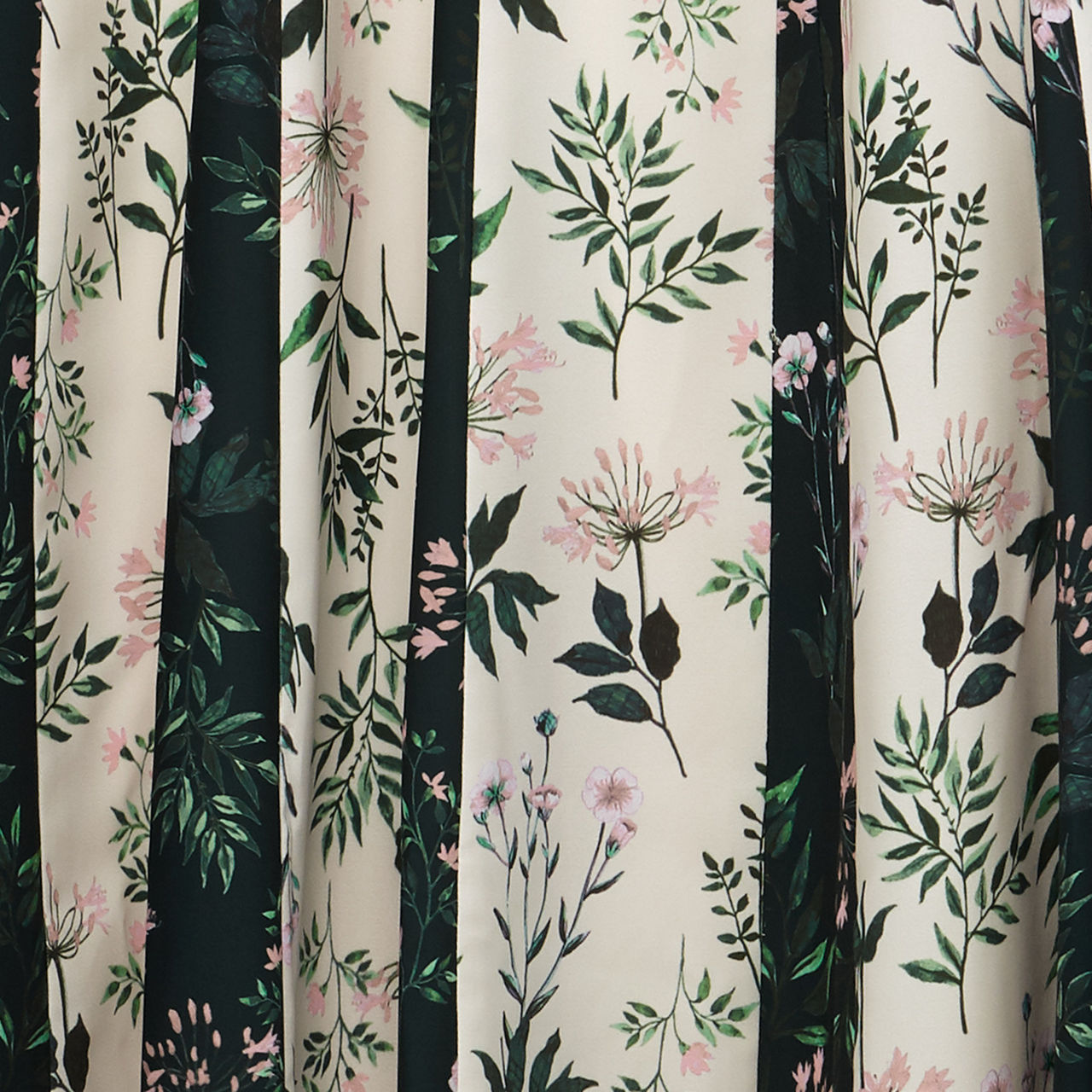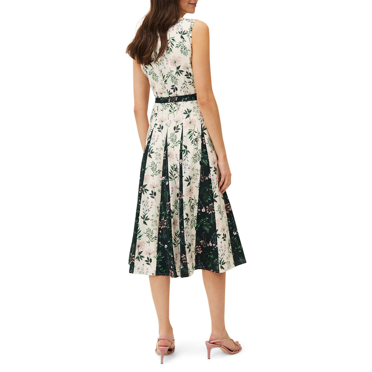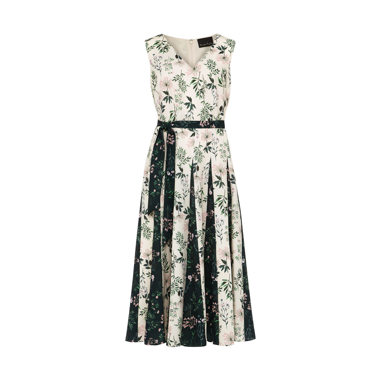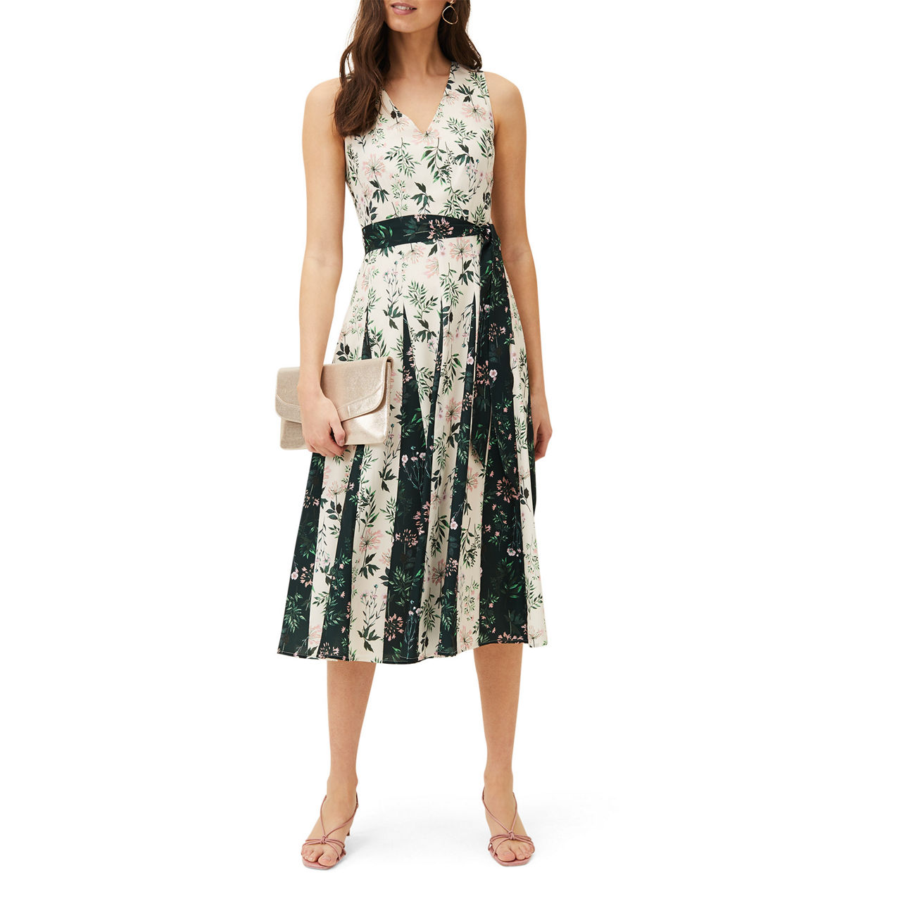- Sleeveless, V-neck, midi length, pleated skirt, belt tie detail, concealed zip, lined, floral print