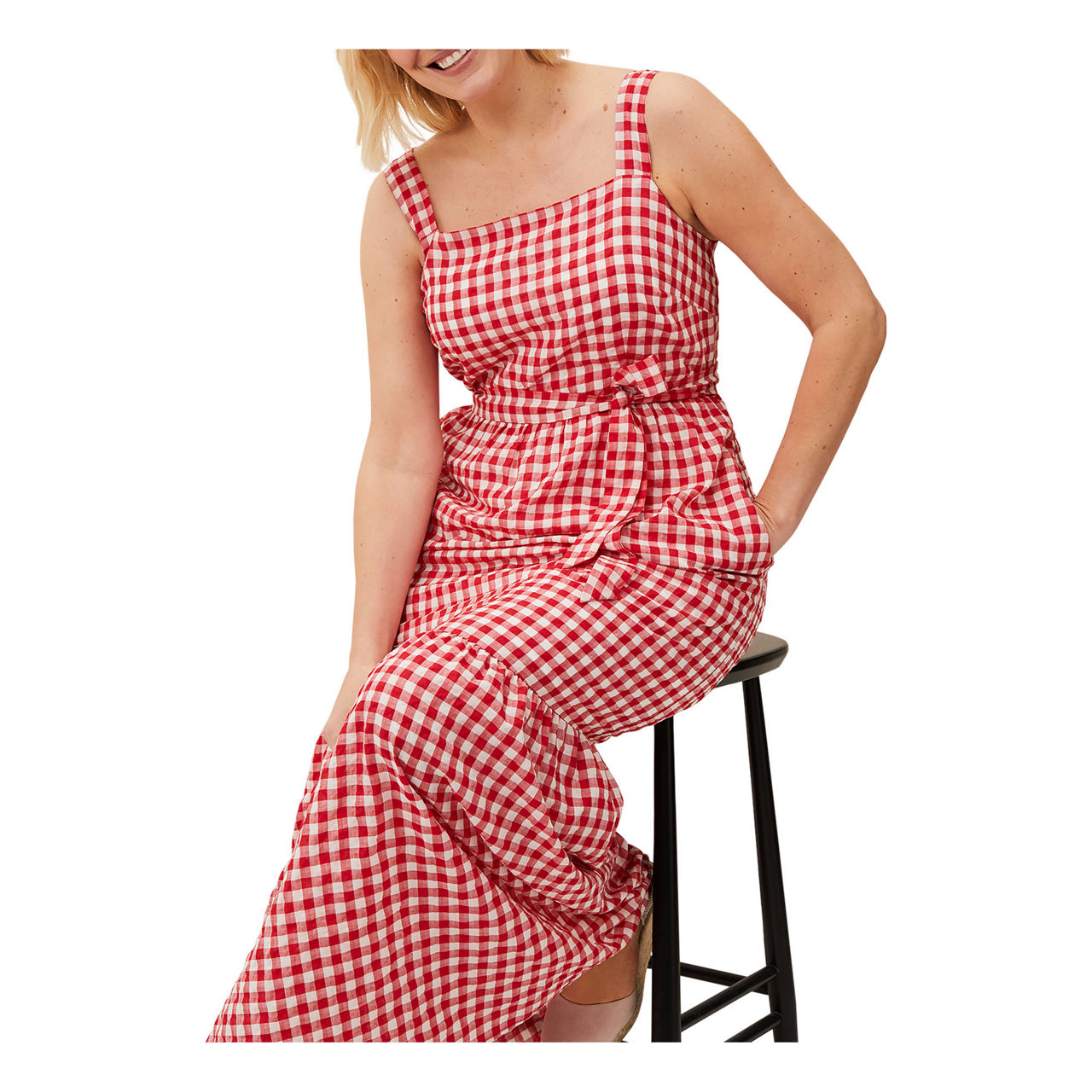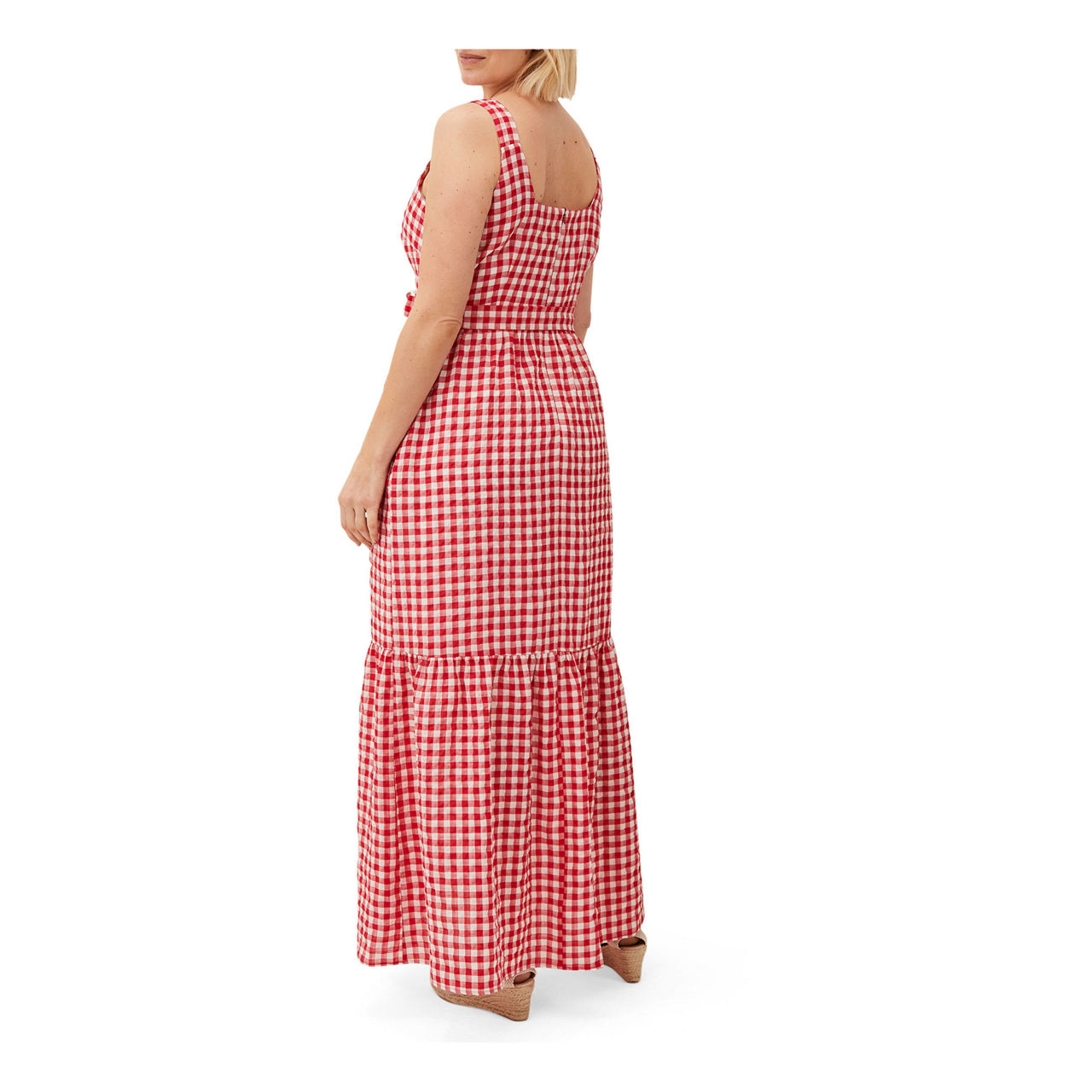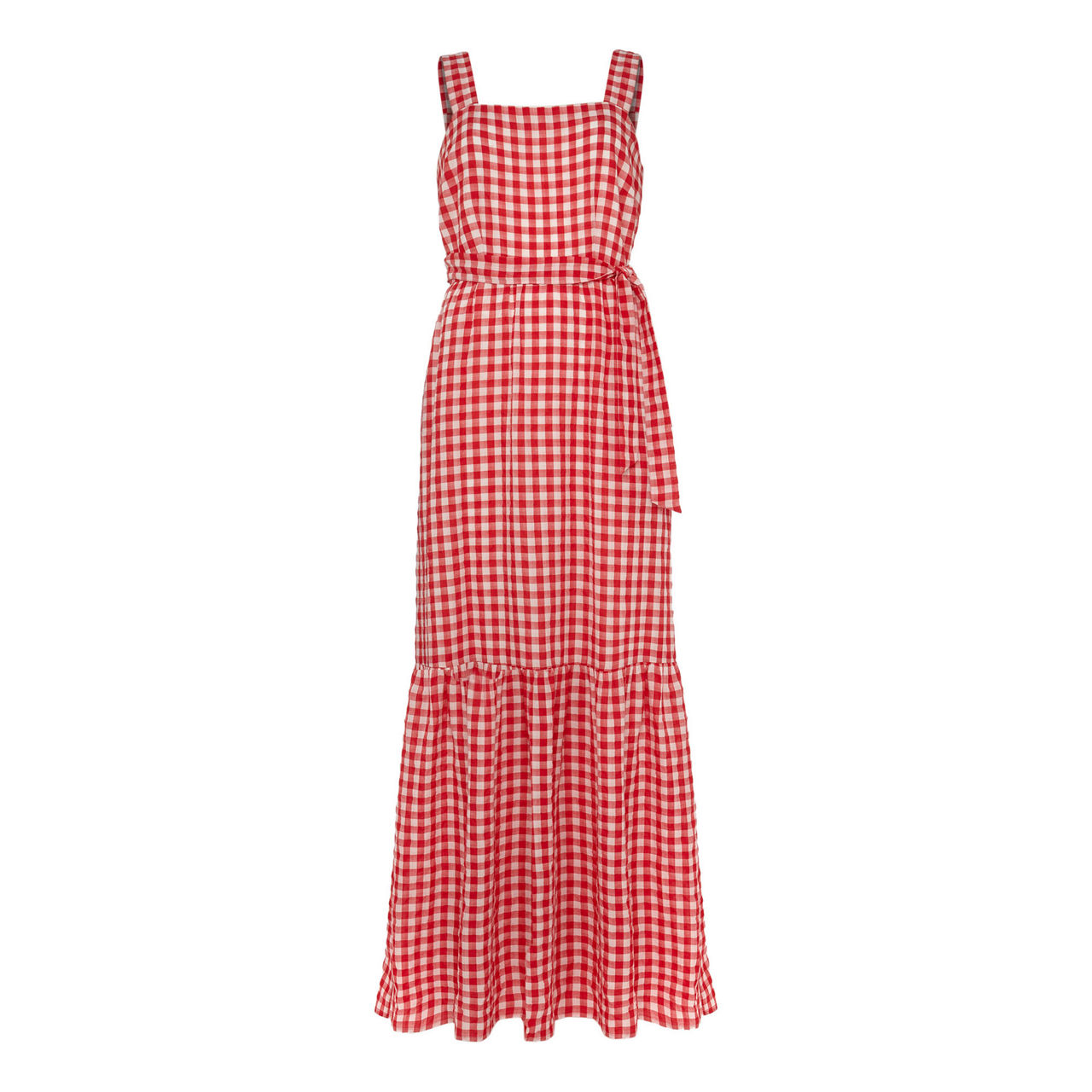 Embrace easy elegance in Phase Eight's Geri dress. This sleeveless silhouette is designed in a spring/summer-ready gingham print and finished with a square neckline tiered skirt and matching waist tie. Style with a pair of espadrilles to complete your look.