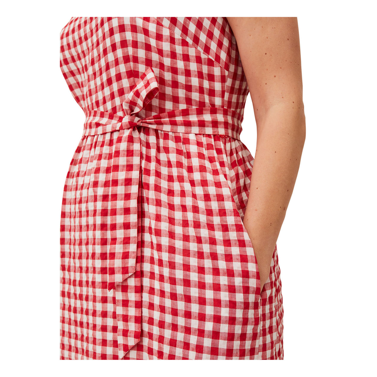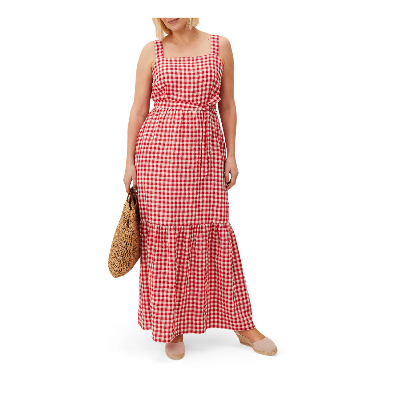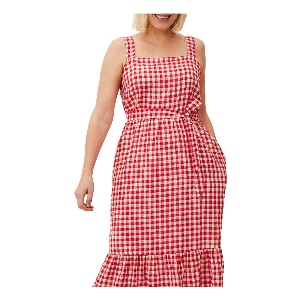 Embrace easy elegance in Phase Eight's Geri dress. This sleeveless silhouette is designed in a spring/summer-ready gingham print and finished with a square neckline tiered skirt and matching waist tie. Style with a pair of espadrilles to complete your look.