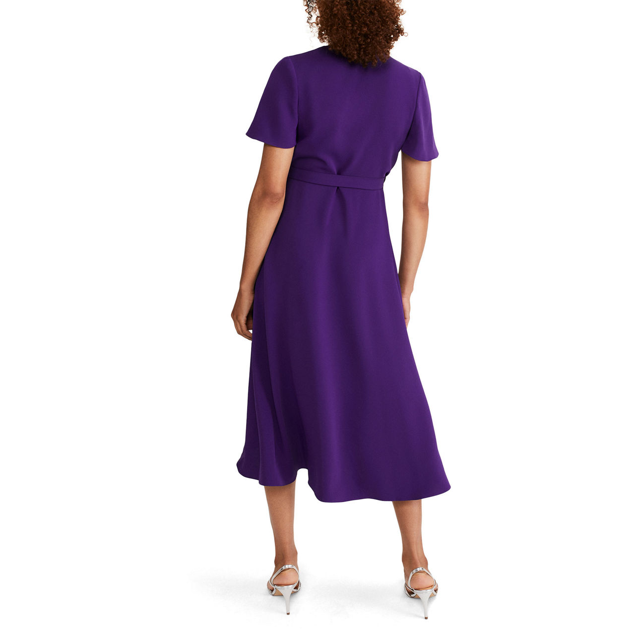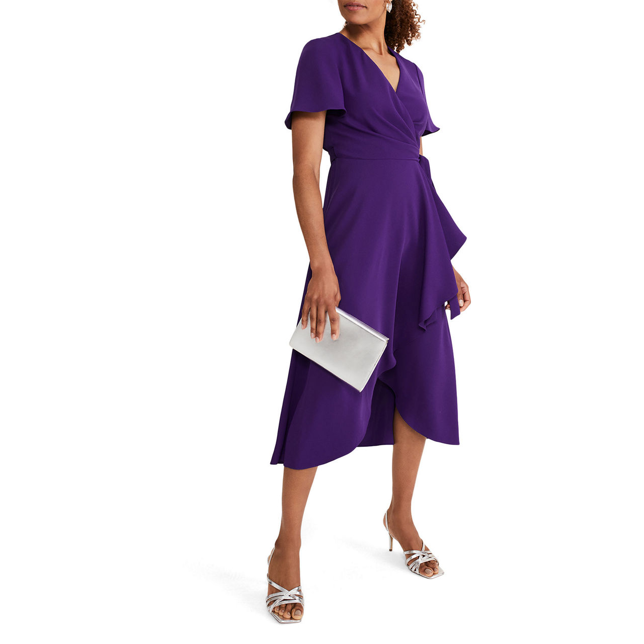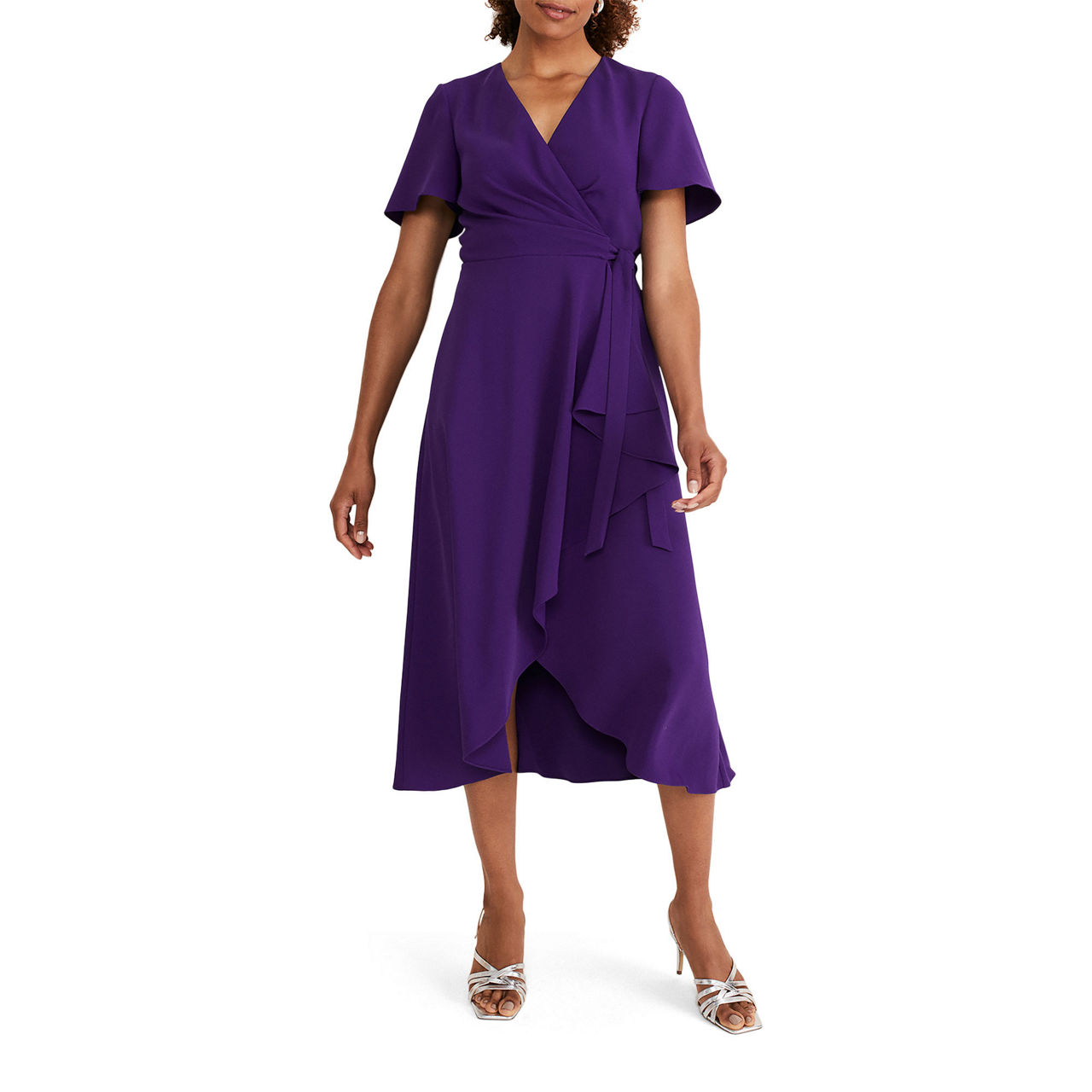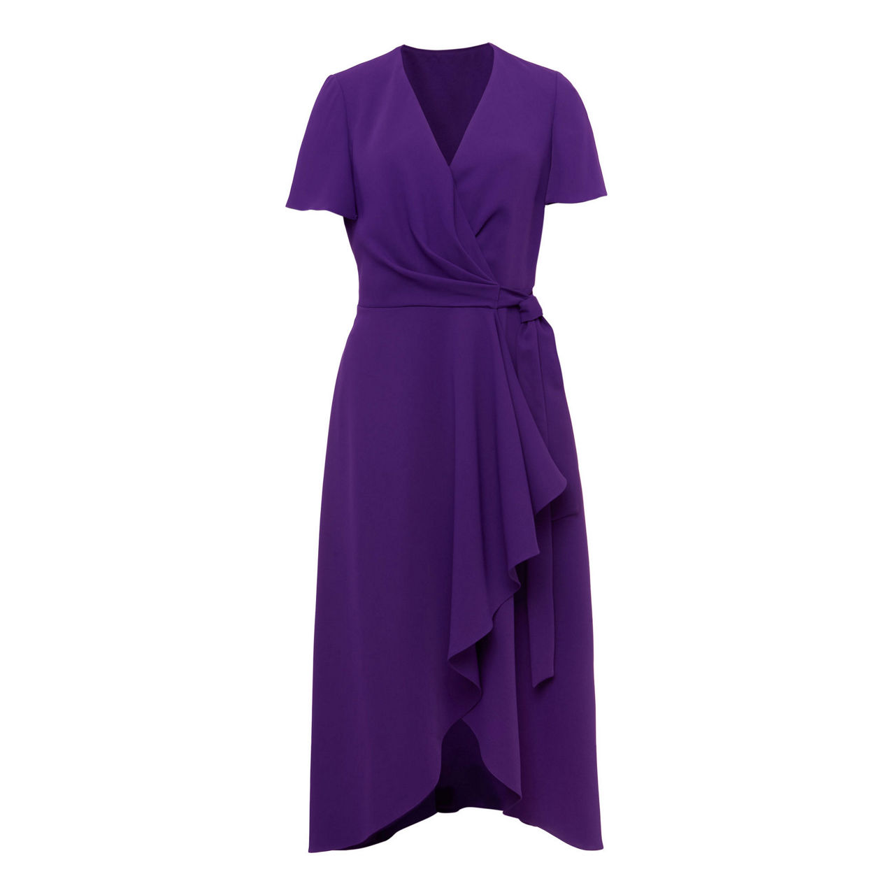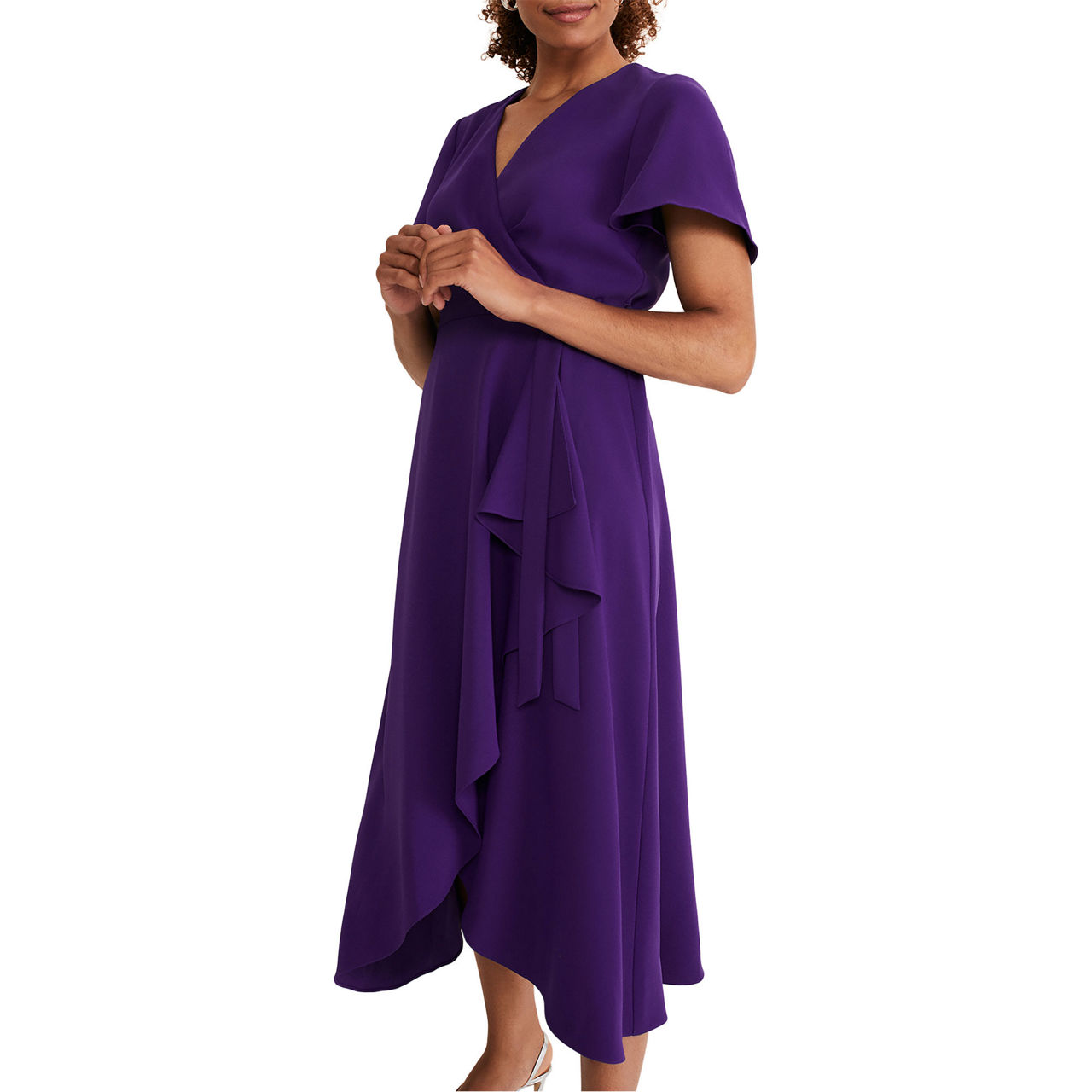 - V-neckline, wrap style, tie waist, short fluted sleeves, waterfall hem.