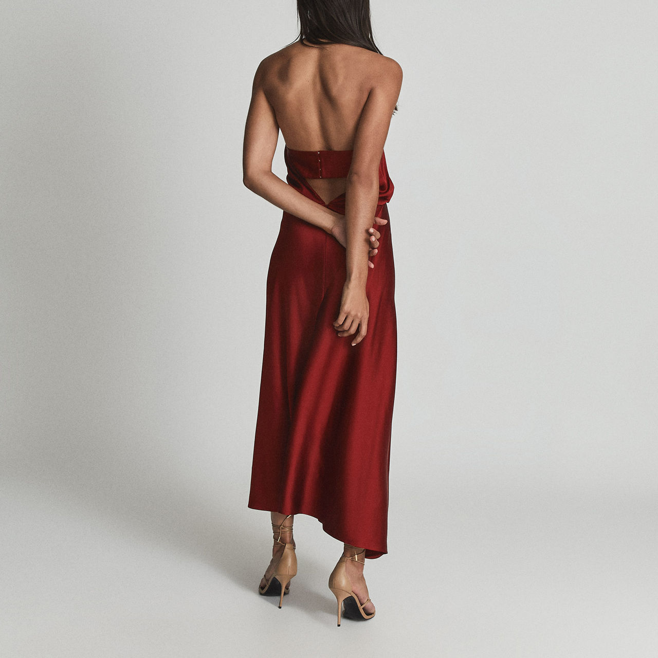 Party season is upon us, and Reiss have your go-to occasion look ready with this halterneck ankle-length dress. Cut from a fluid satin fabric with a touch of stretch for a covetable fit, the rich red fabric is twisted into a halterneck with a knotted detail at the front. Pair with barely-there heeled sandals for a polished event edit.