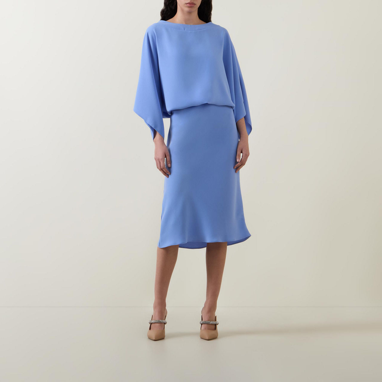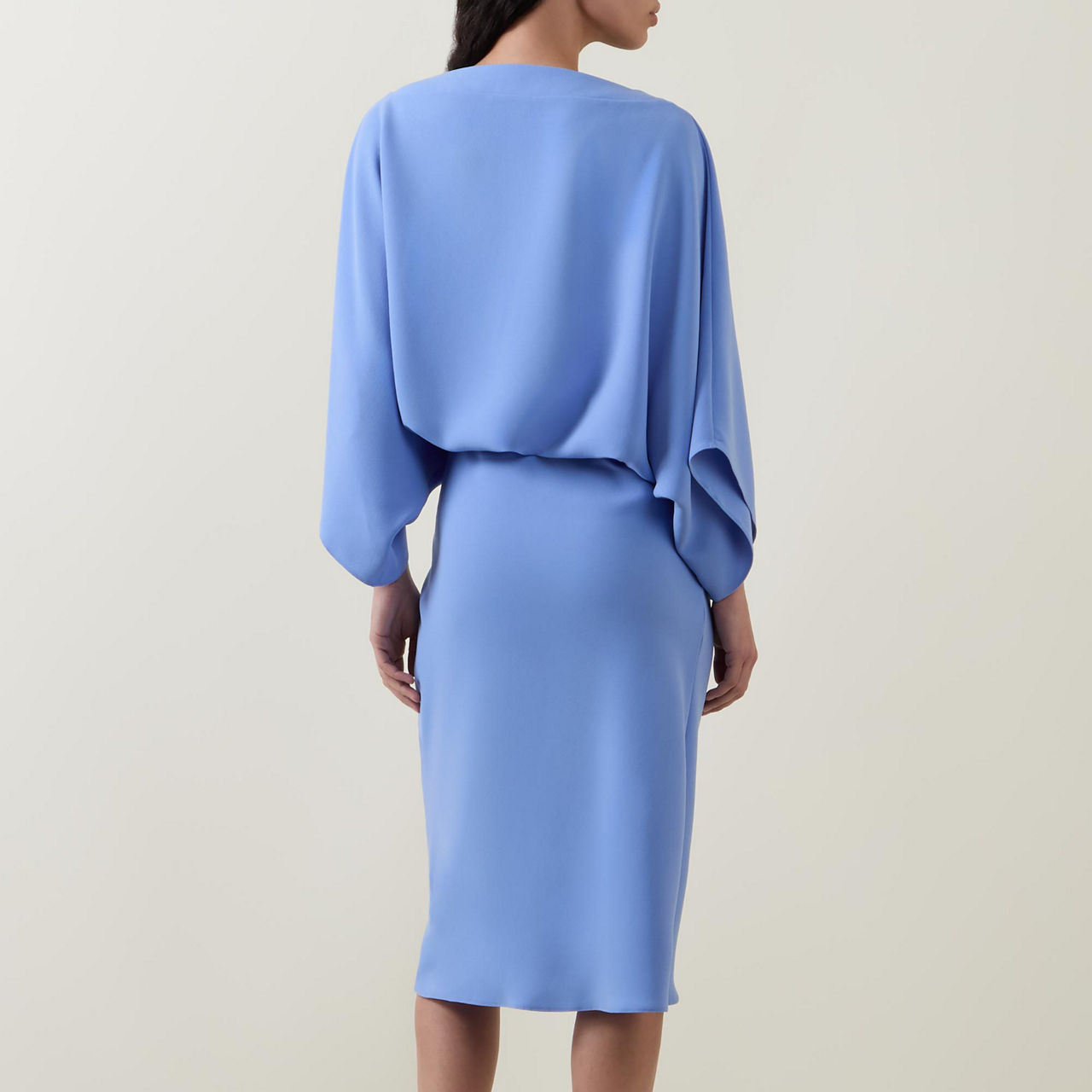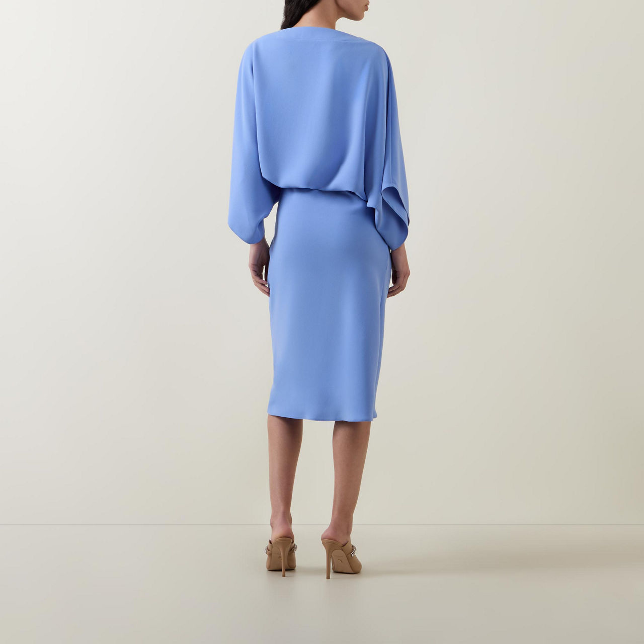 - Round neckline, three-quarter-length cape sleeves, fitted skirt, midi length