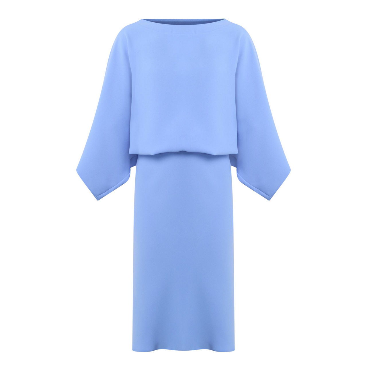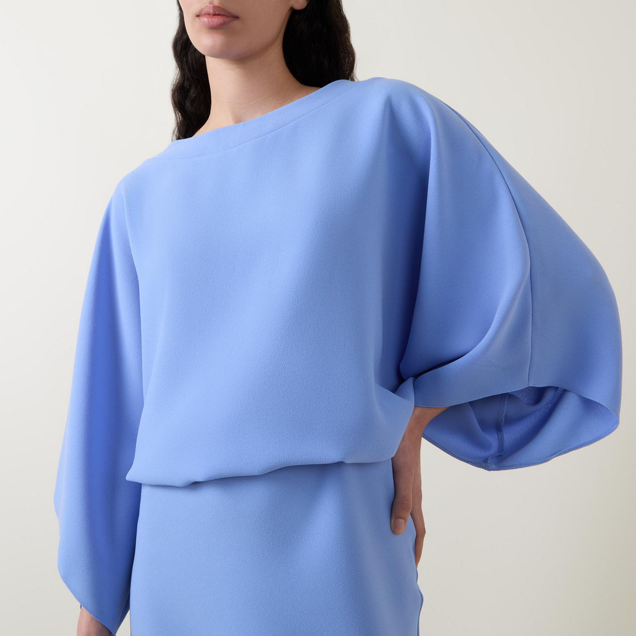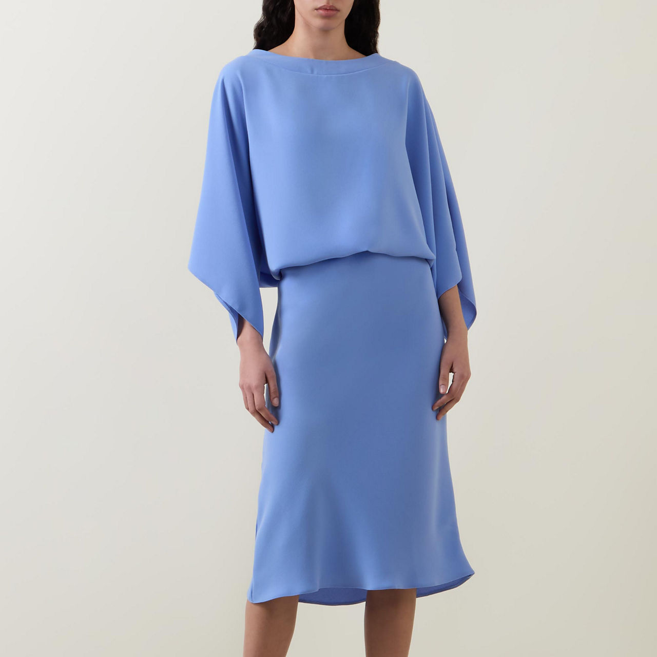 - Round neckline, three-quarter-length cape sleeves, fitted skirt, midi length