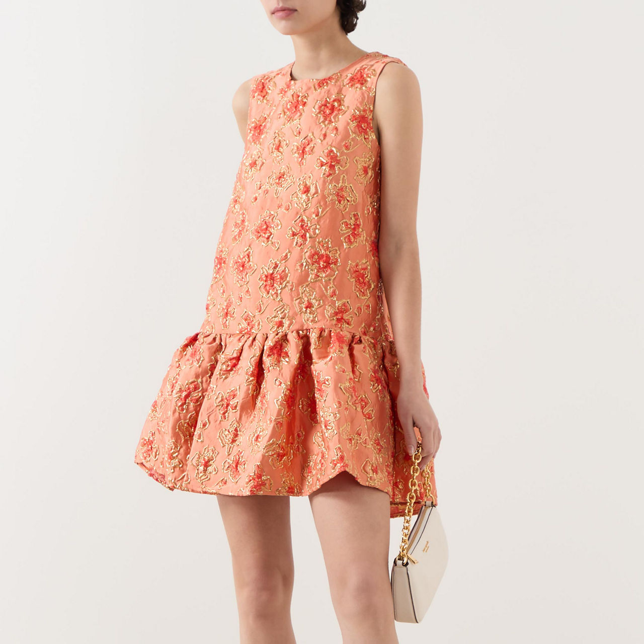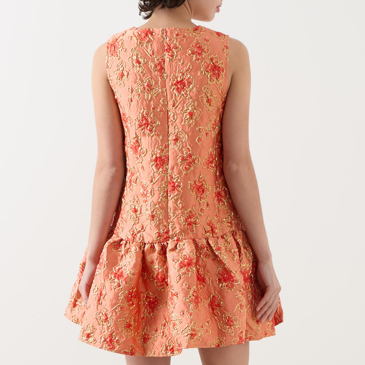 - Jacquard fabric, round neck, sleeveless, back zipper, floral pattern, peplum hemline