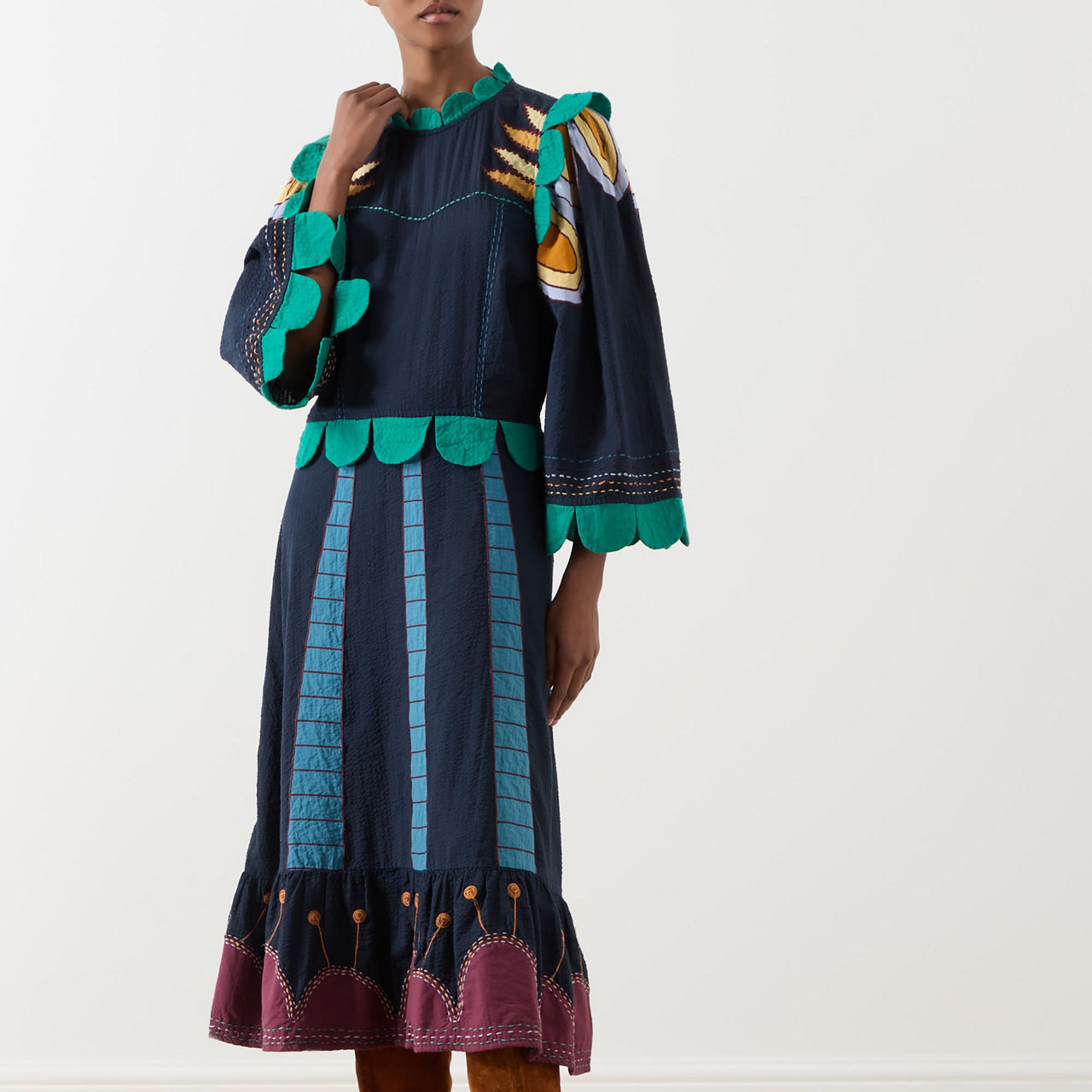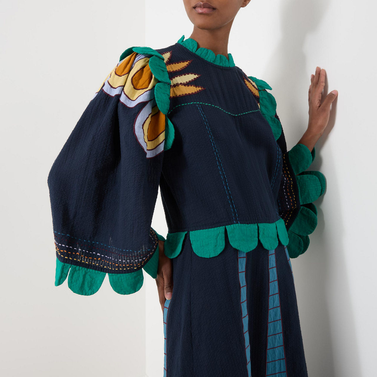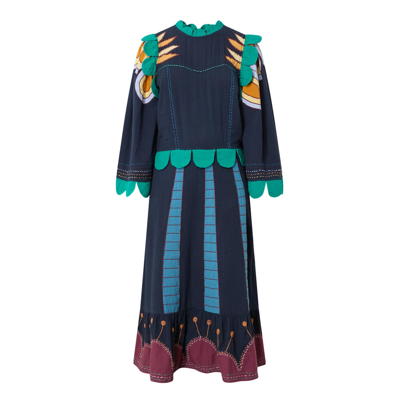 - Stand collar, three-quarter length wide sleeves, full skirt, flared hem, embroidered detailing throughout, contrasting scallop trim design, contrast stitching, midi length