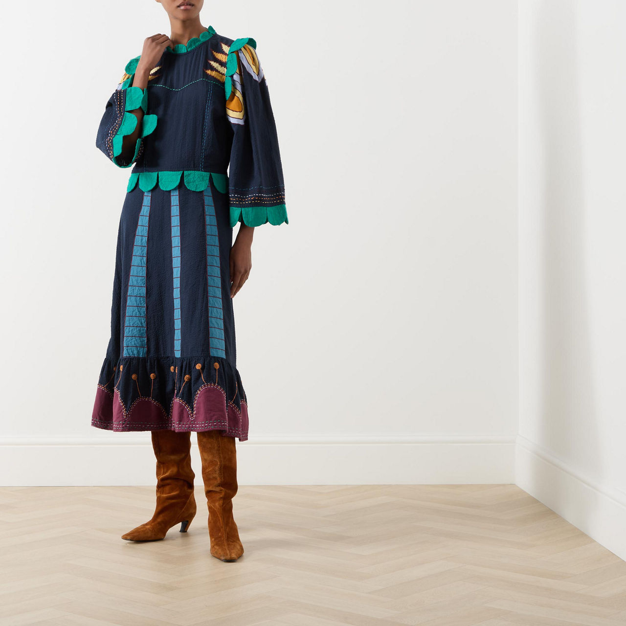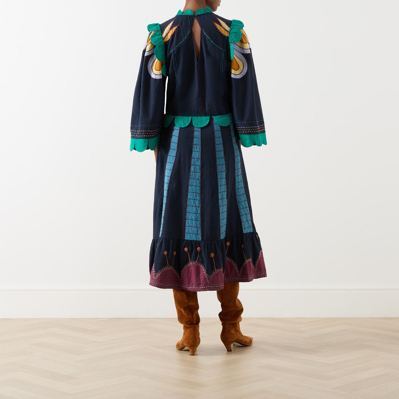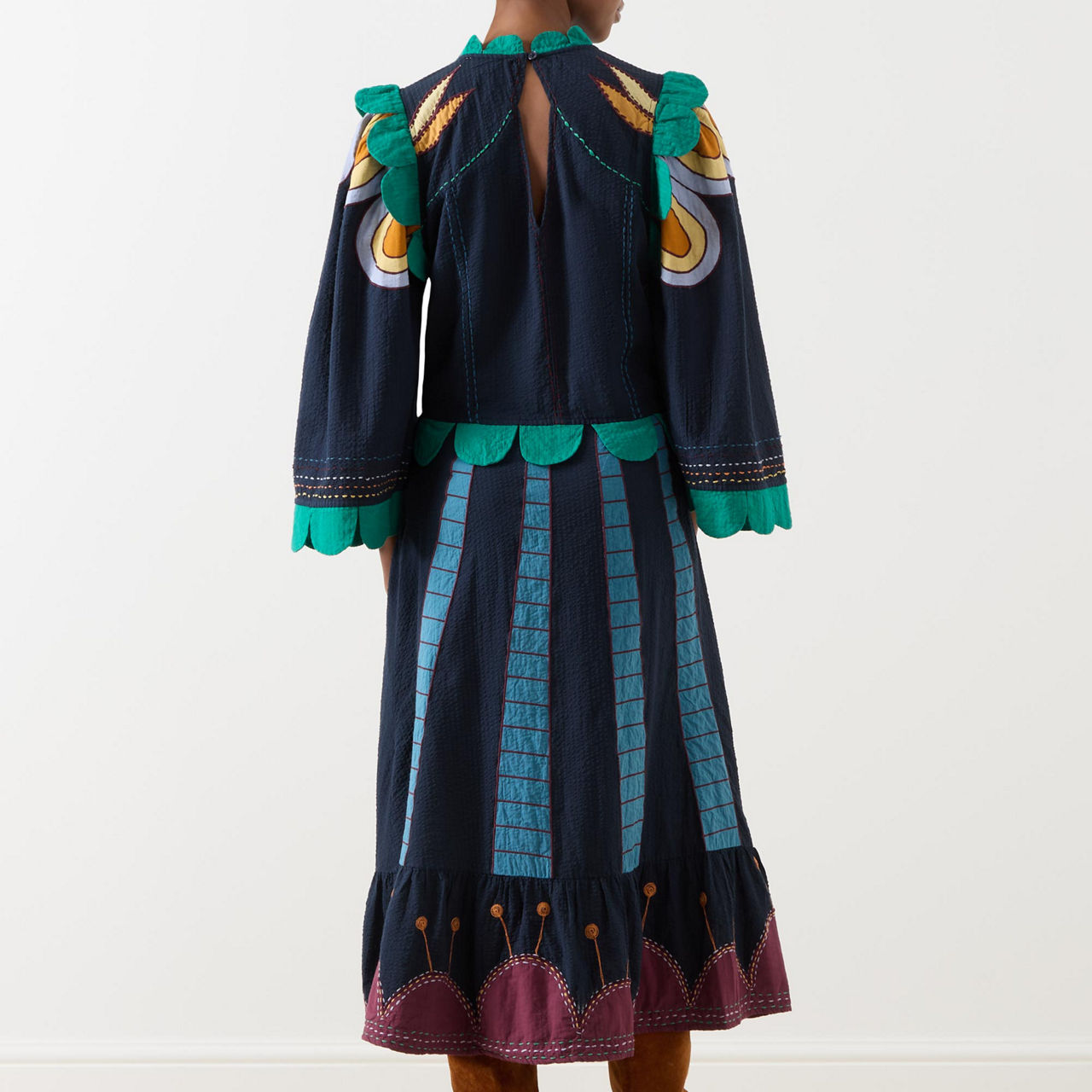 - Stand collar, three-quarter length wide sleeves, full skirt, flared hem, embroidered detailing throughout, contrasting scallop trim design, contrast stitching, midi length