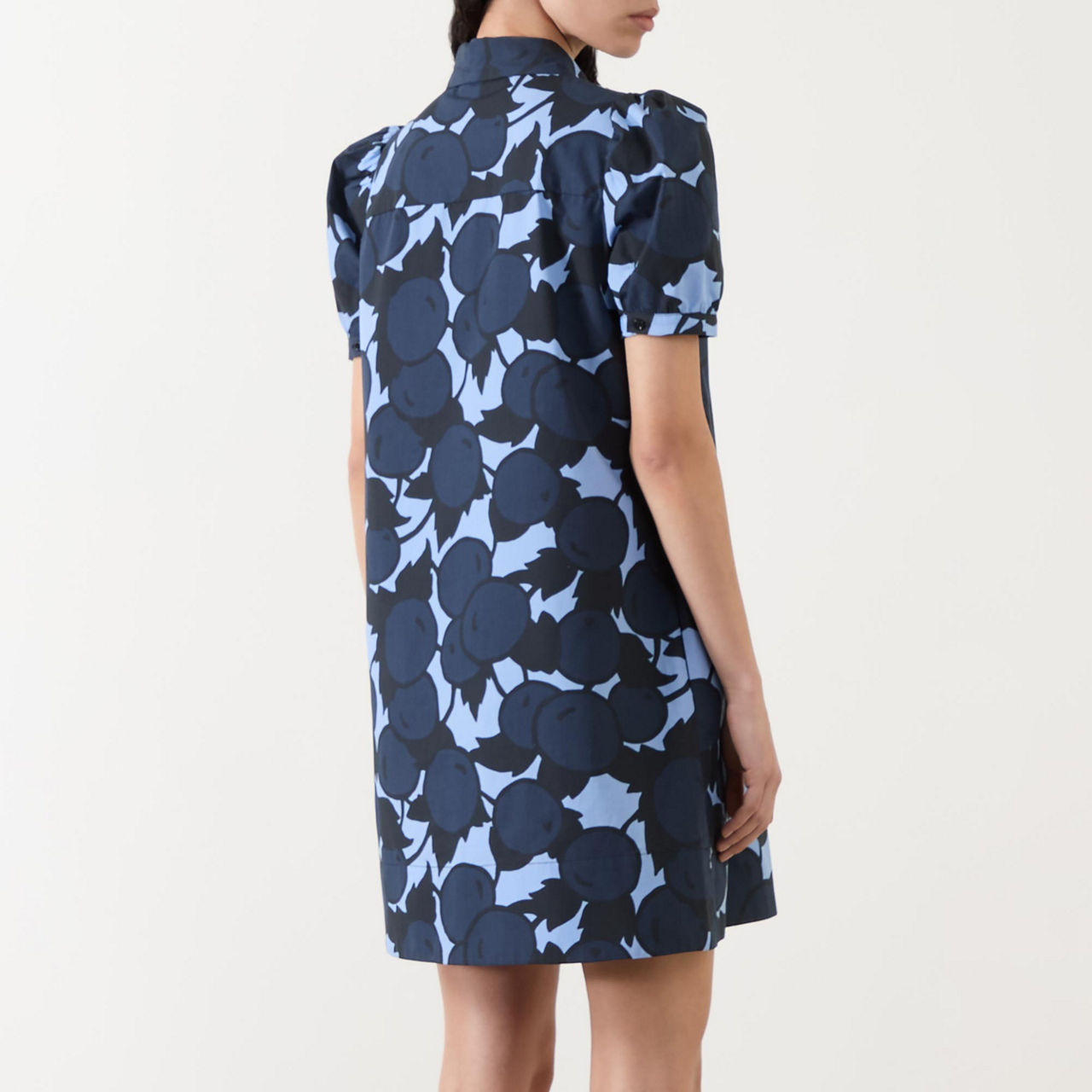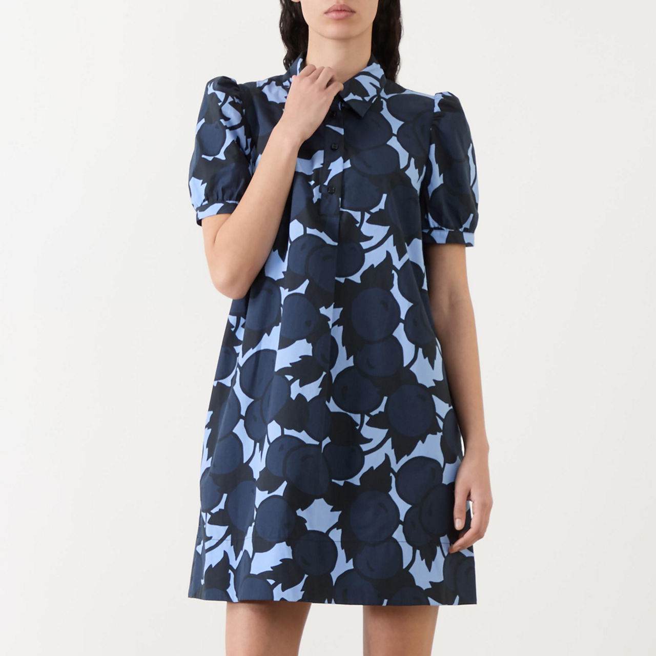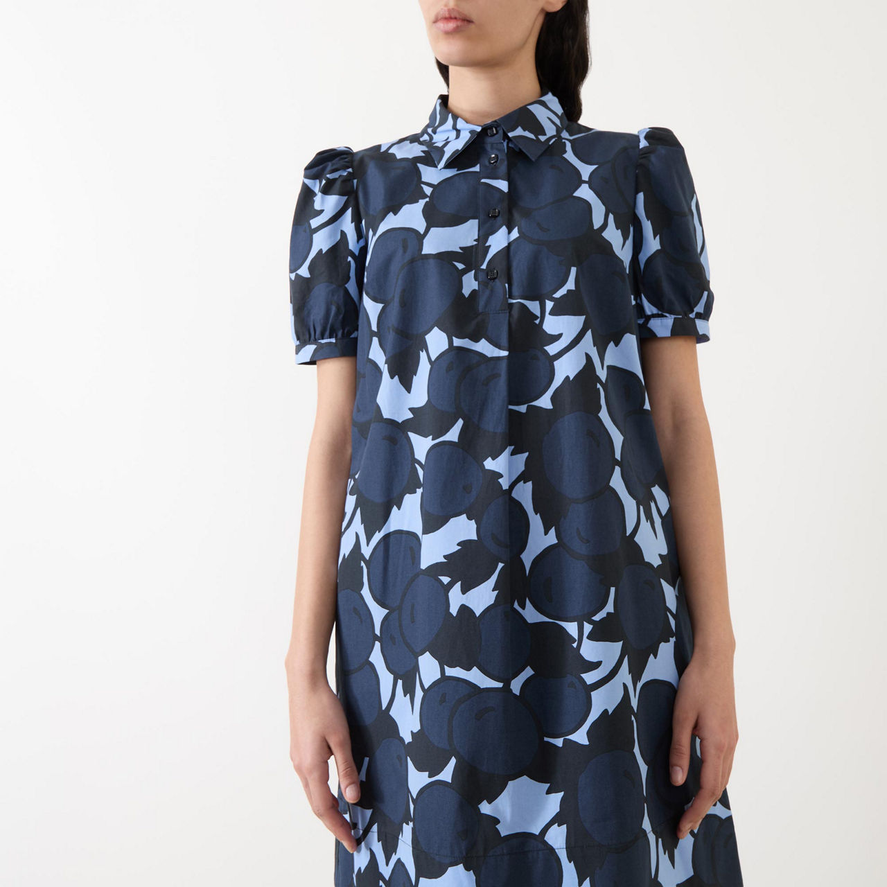 - Cherry print, puffed short sleeves, slightly flared, shirt collar, square buttons, mini length