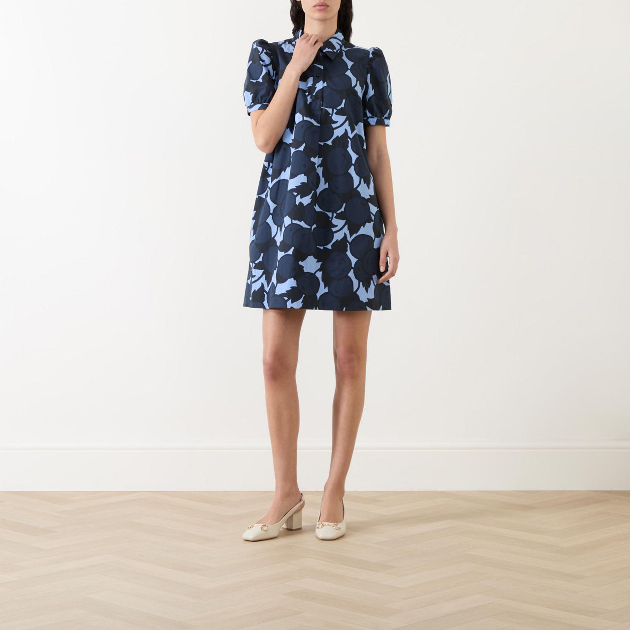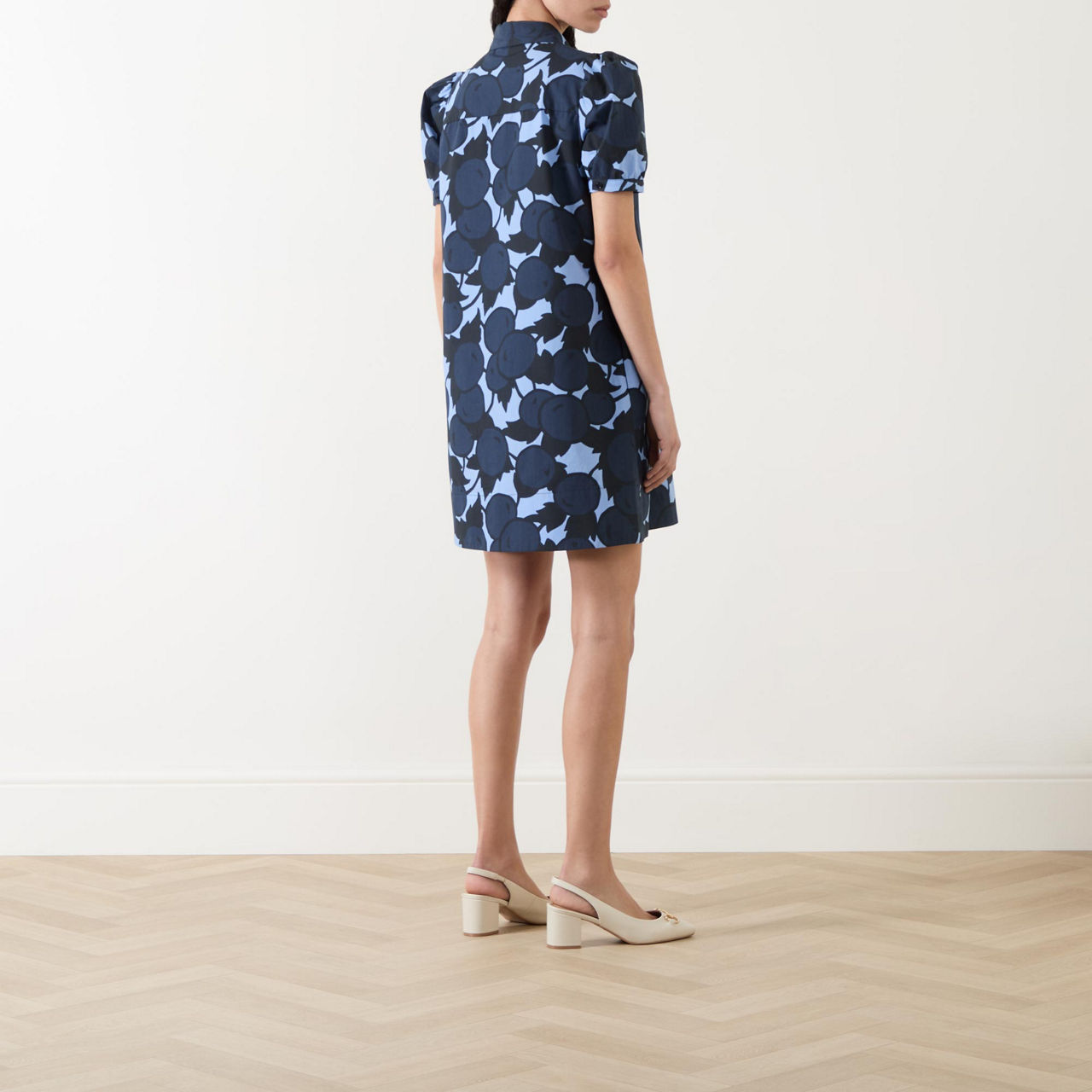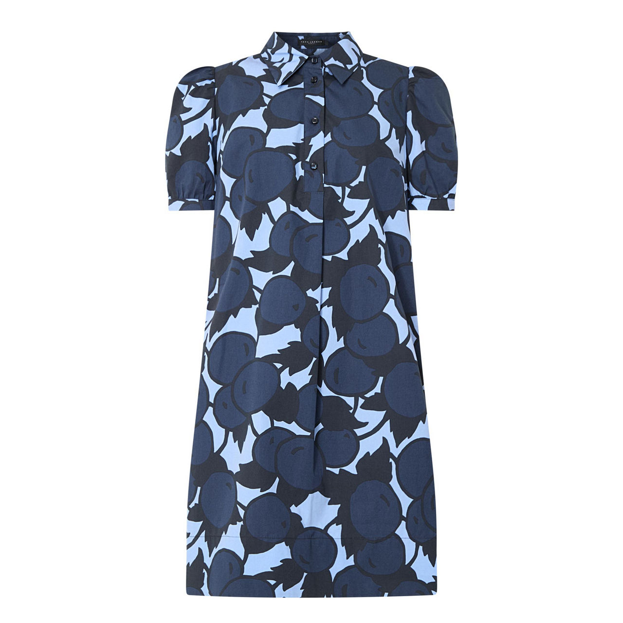 - Cherry print, puffed short sleeves, slightly flared, shirt collar, square buttons, mini length