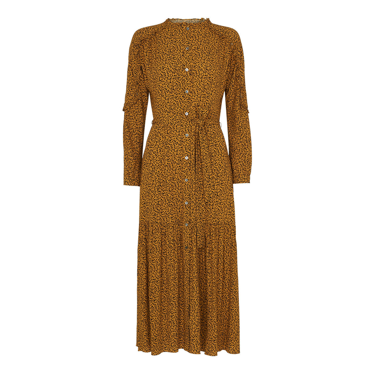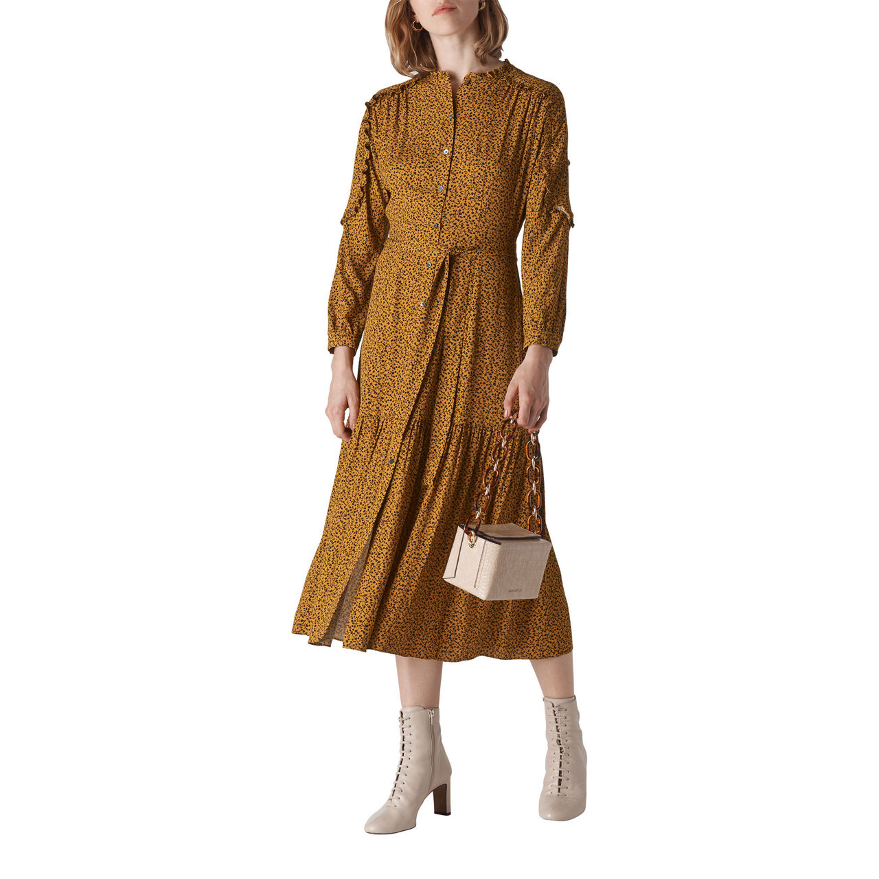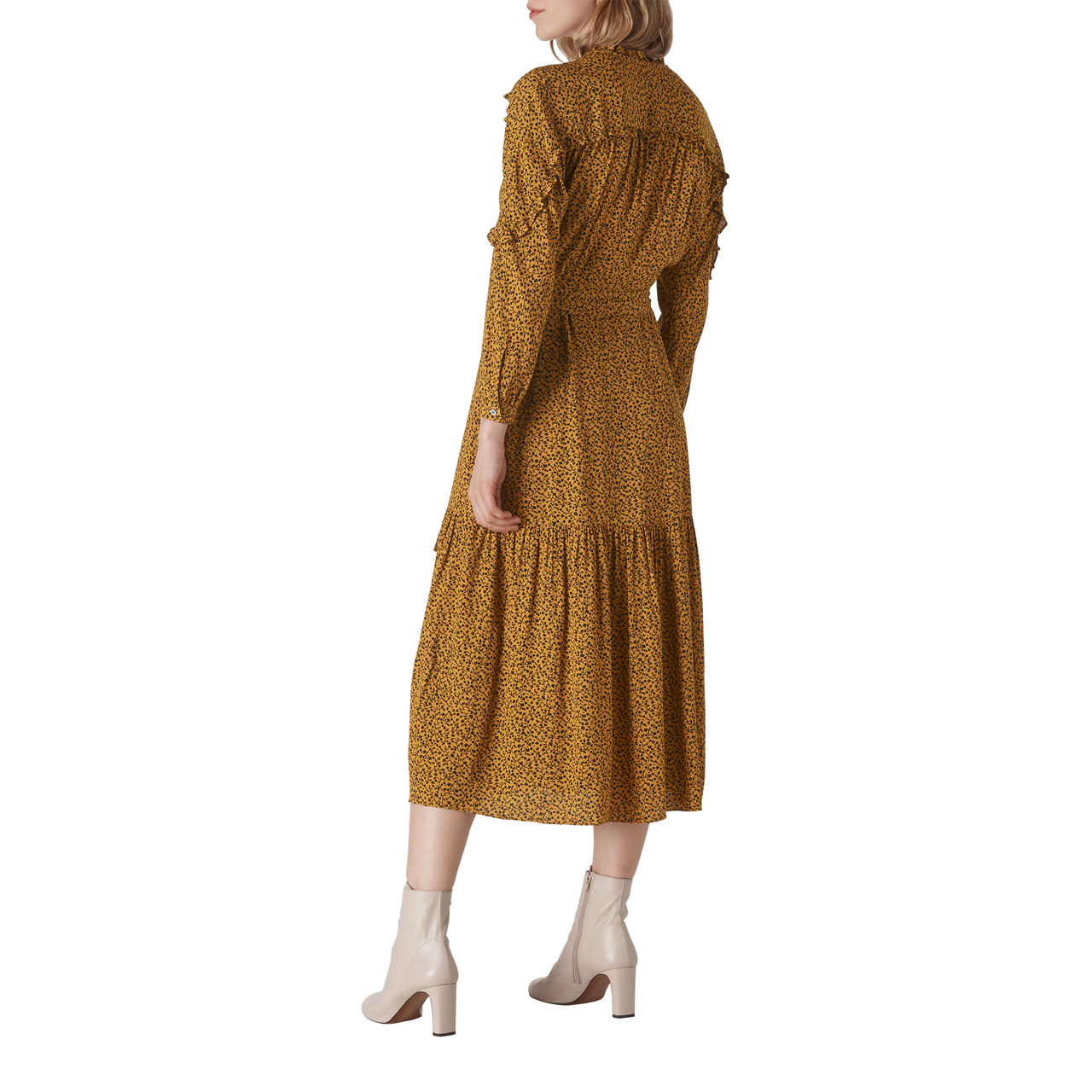 - Leaves print, high neckline, frill shoulders, puff sleeves, relaxed fit, midi length.