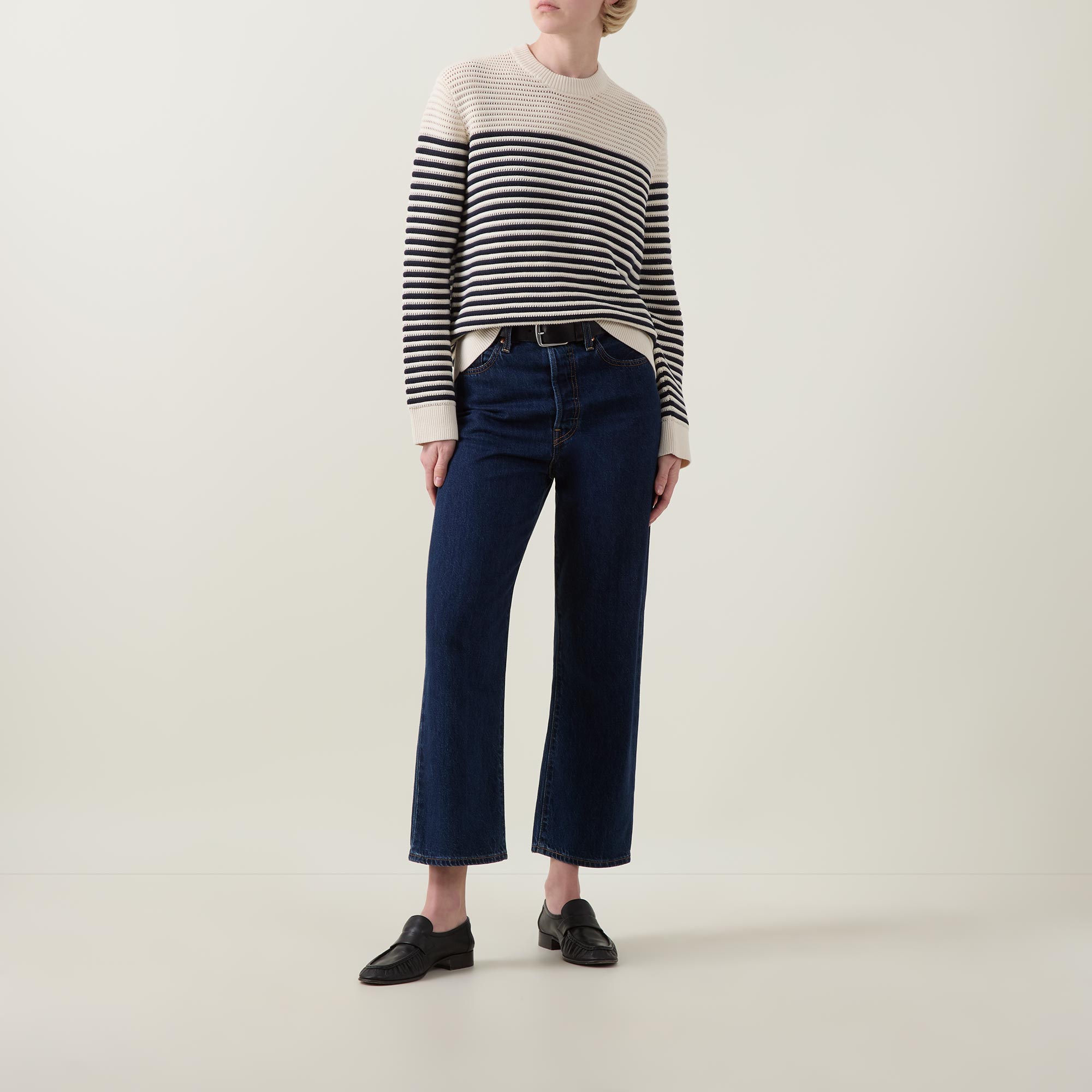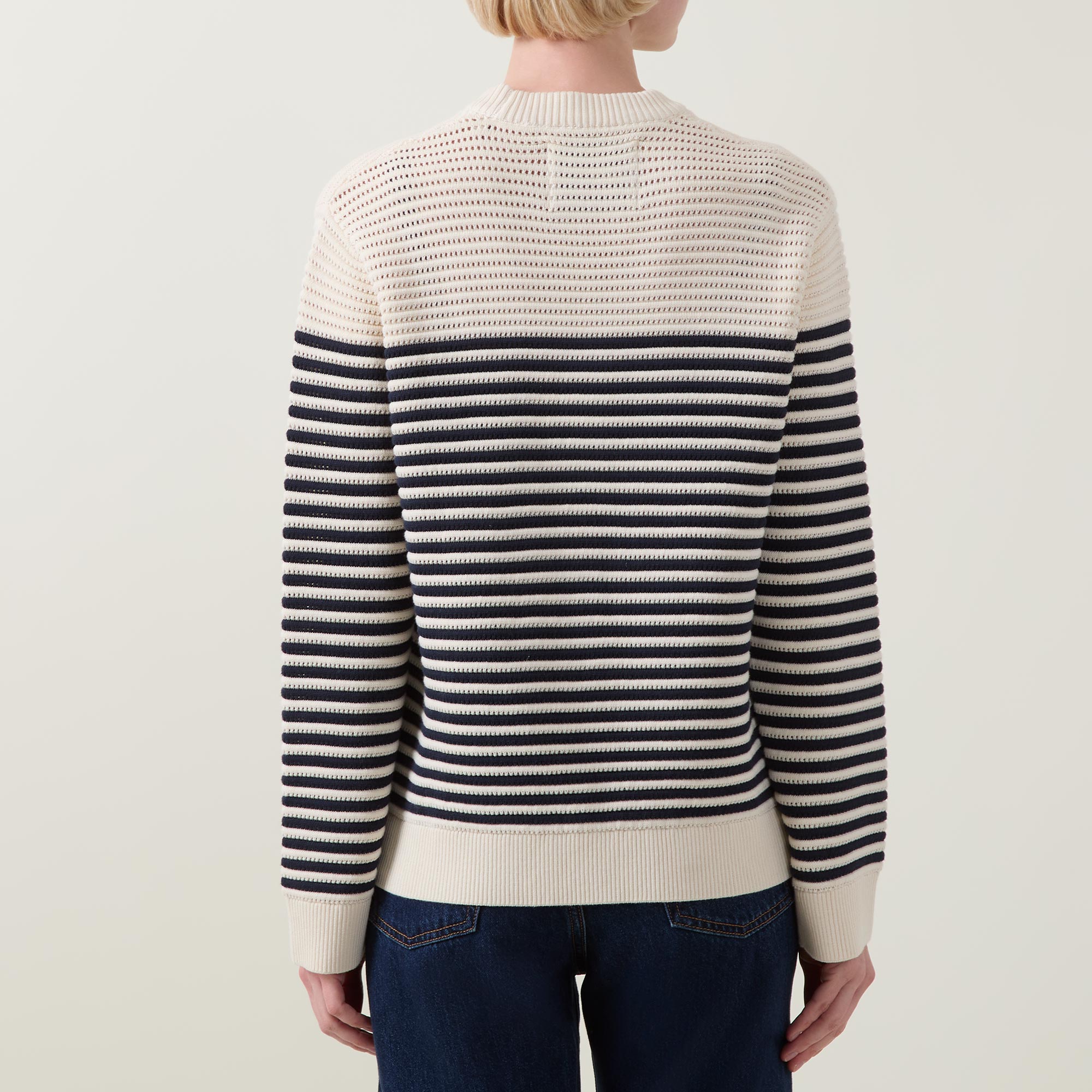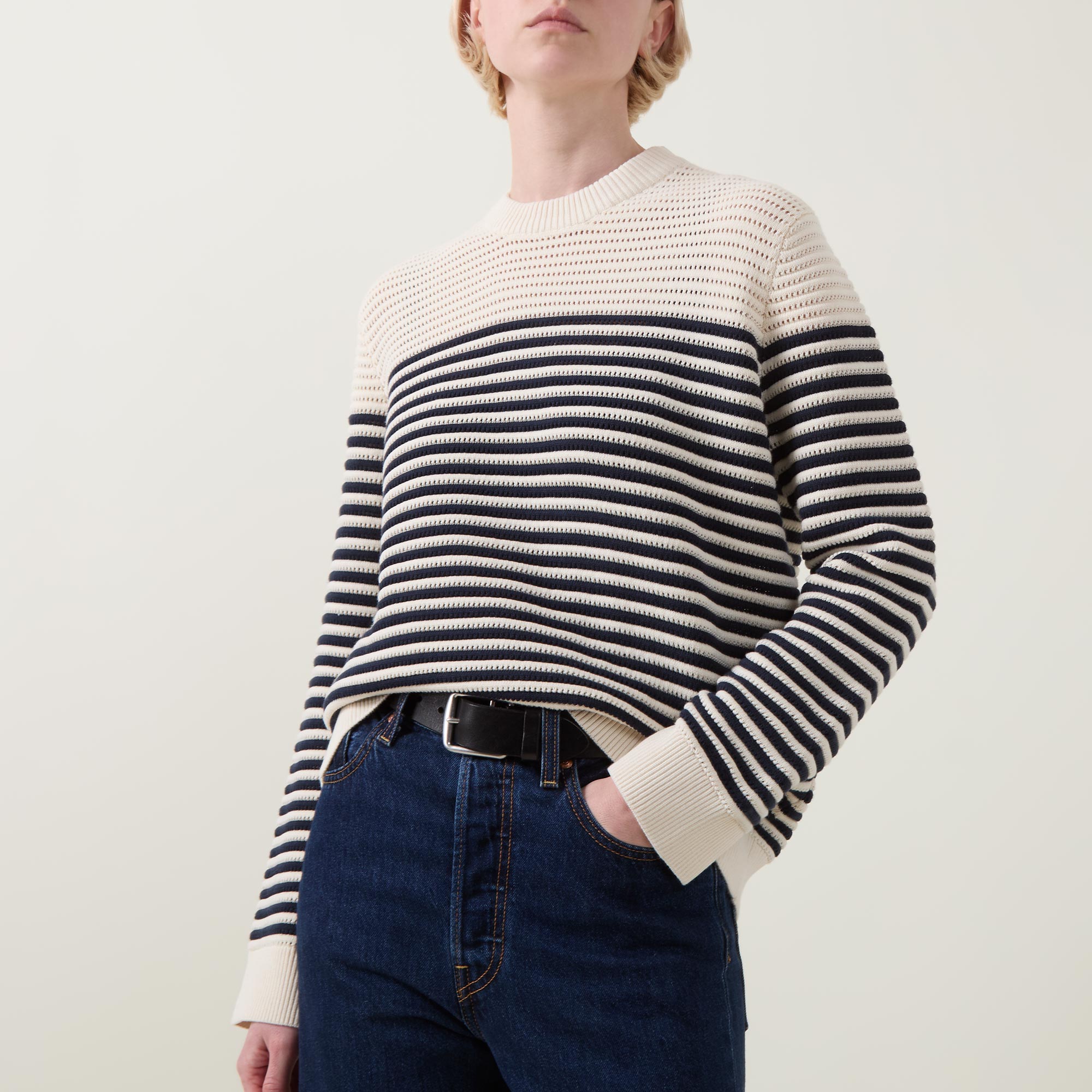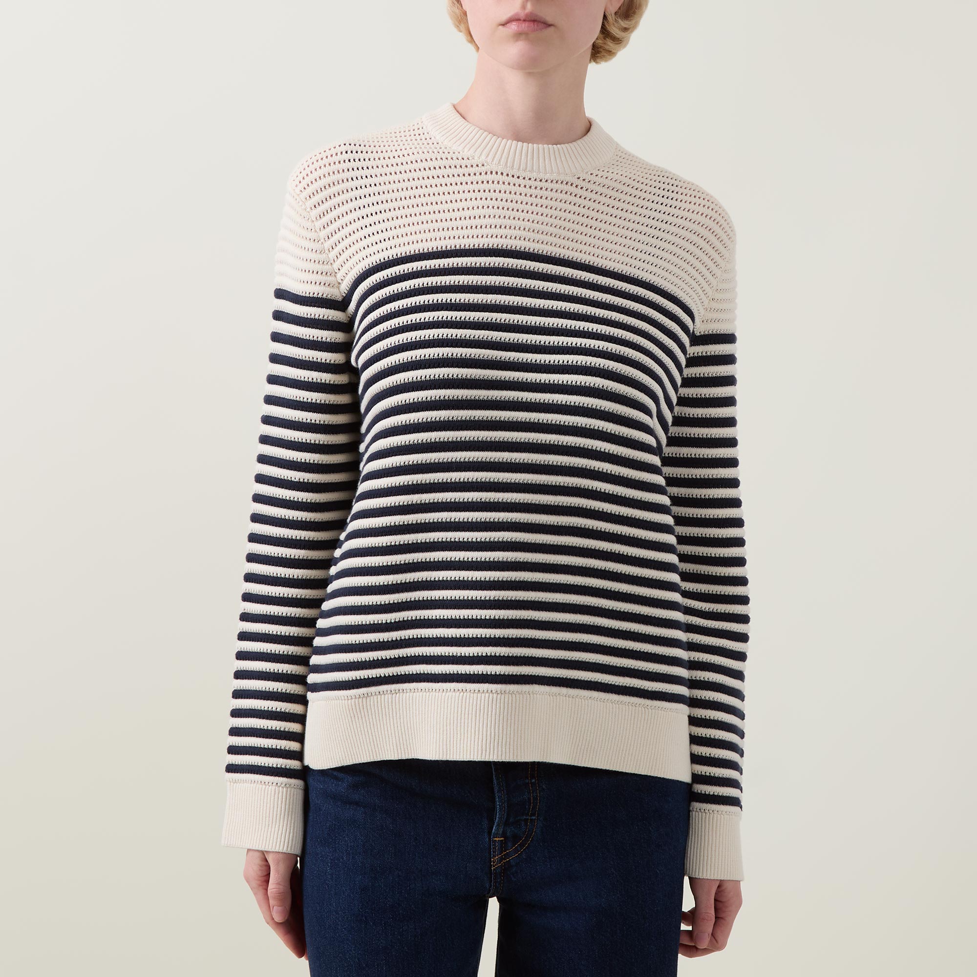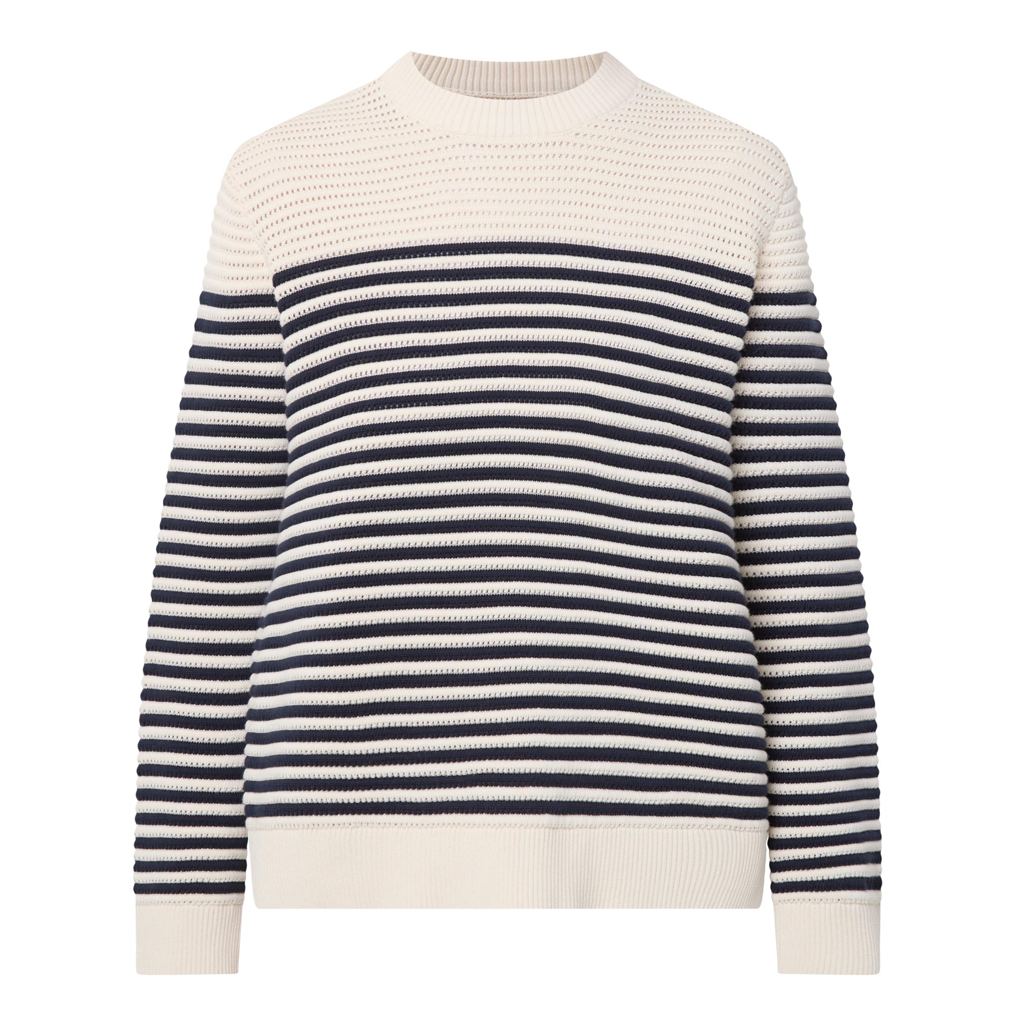 - Crew neck, long sleeves, straight hem, ribbed trims, chunky knit construction, striped pattern, soft finish