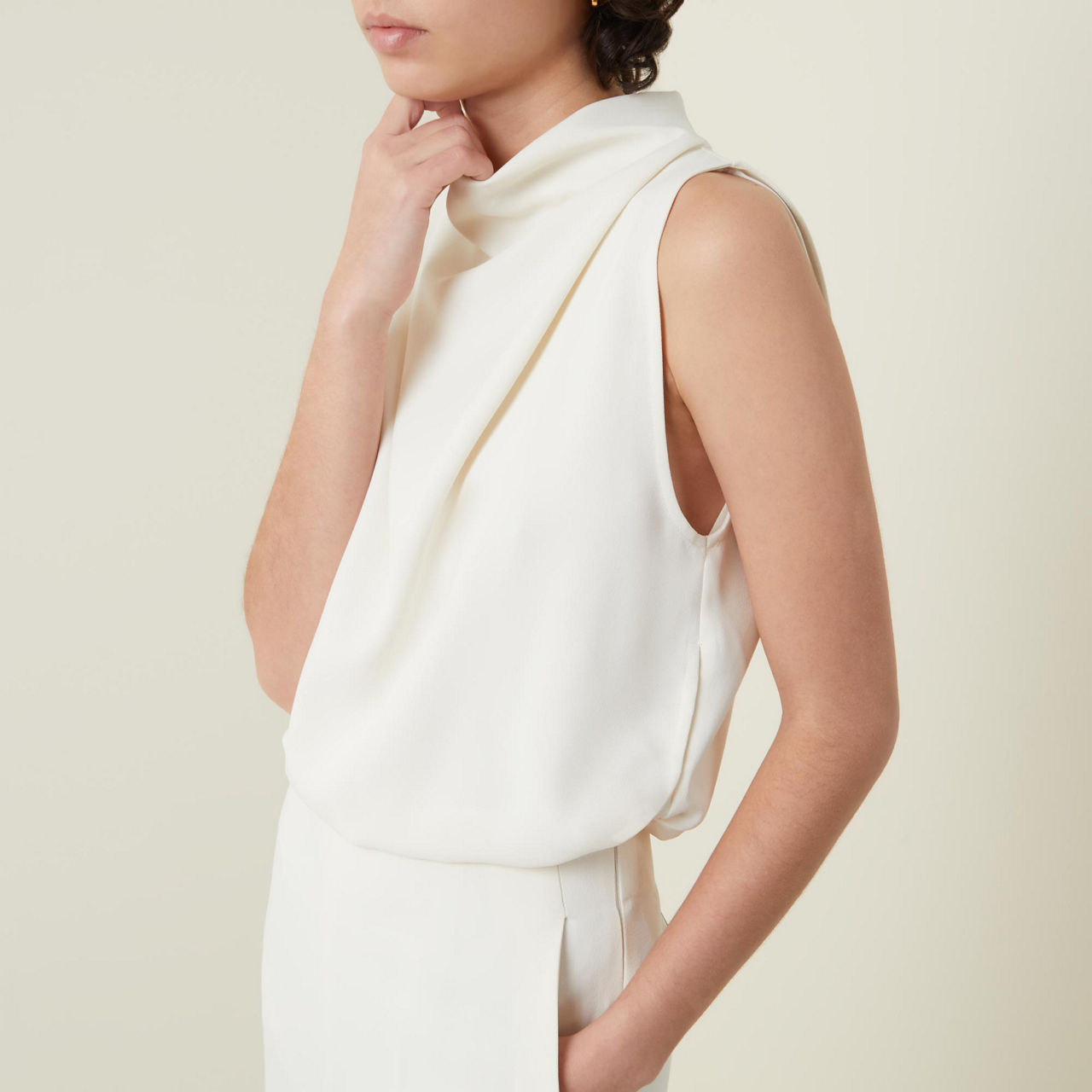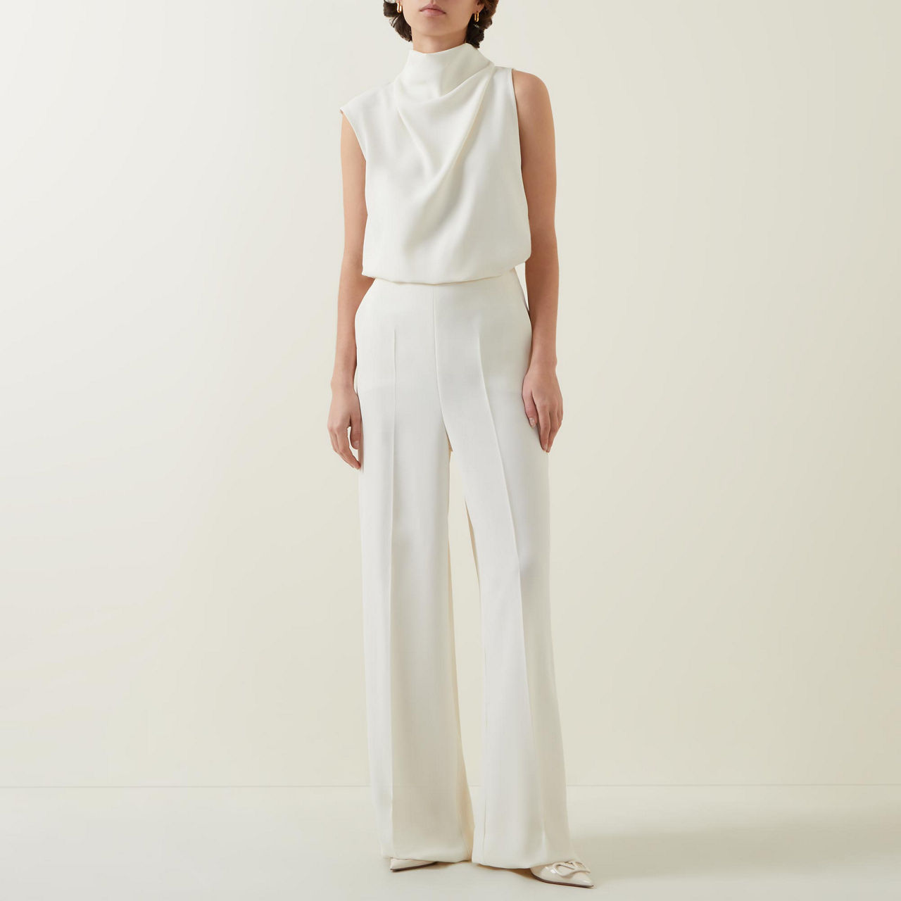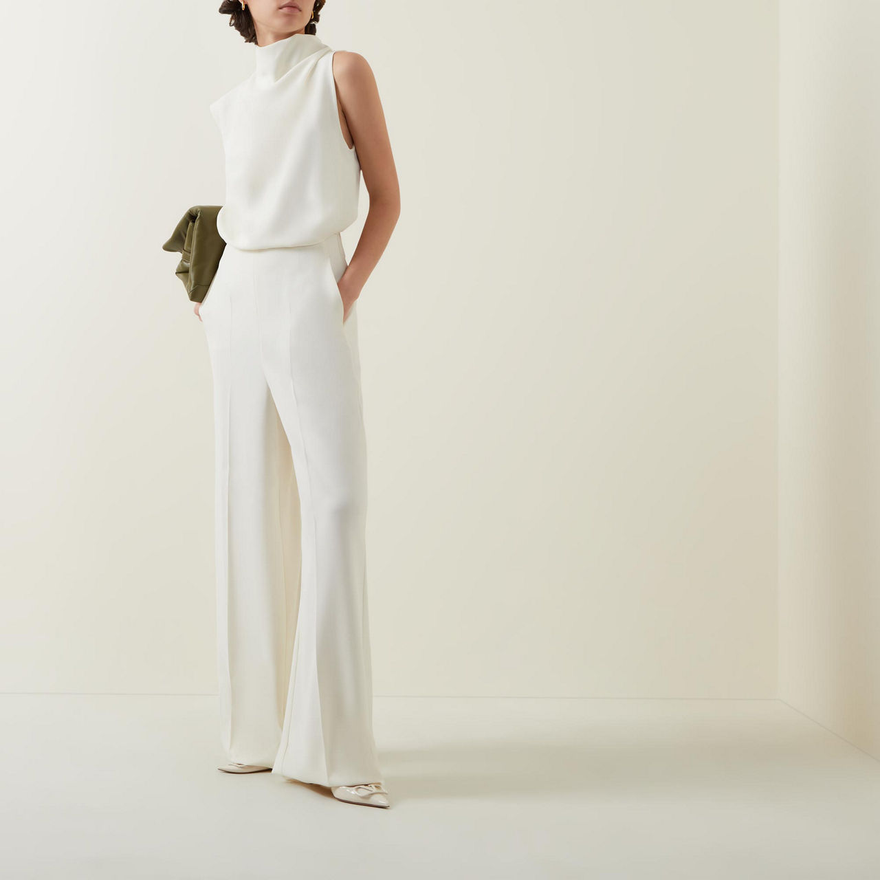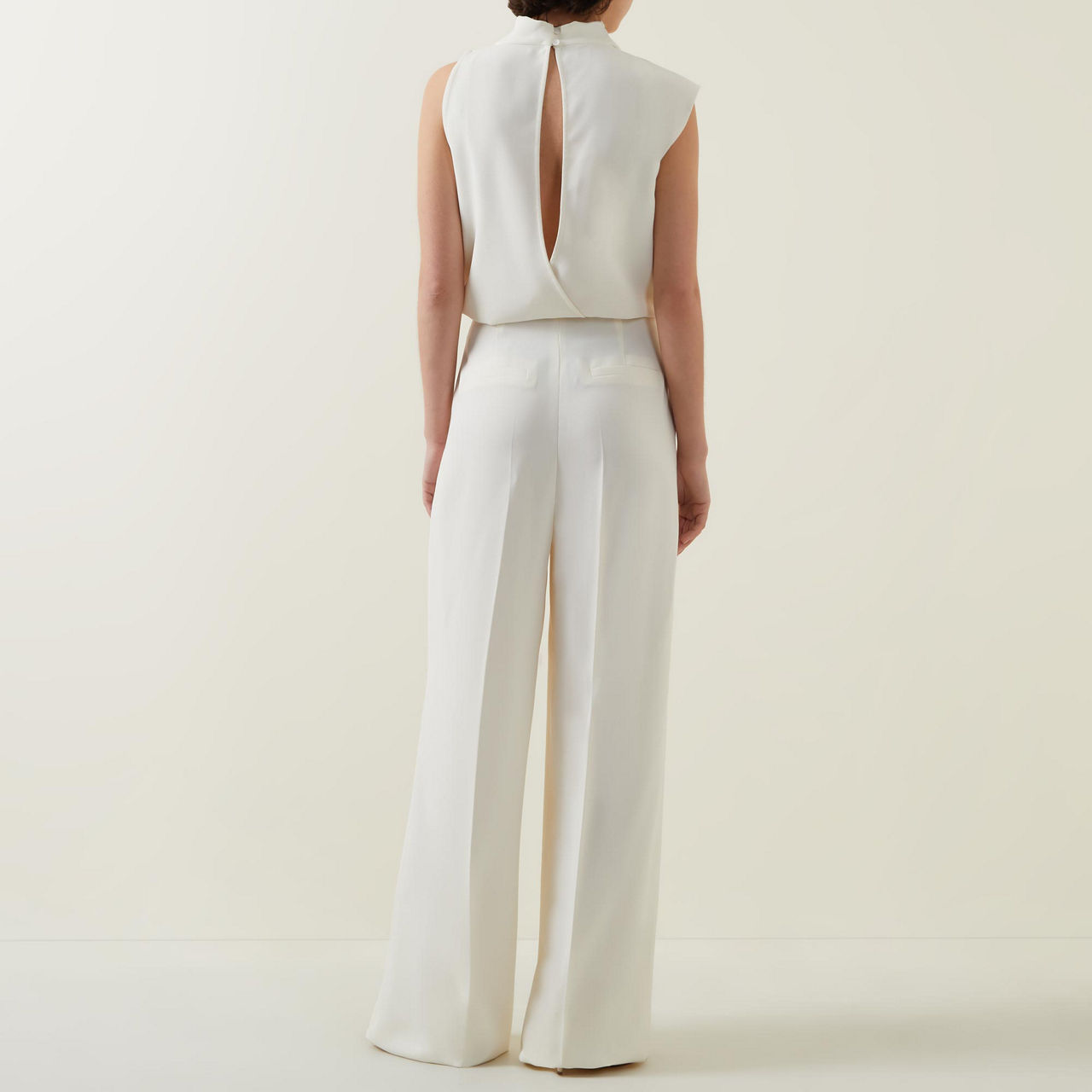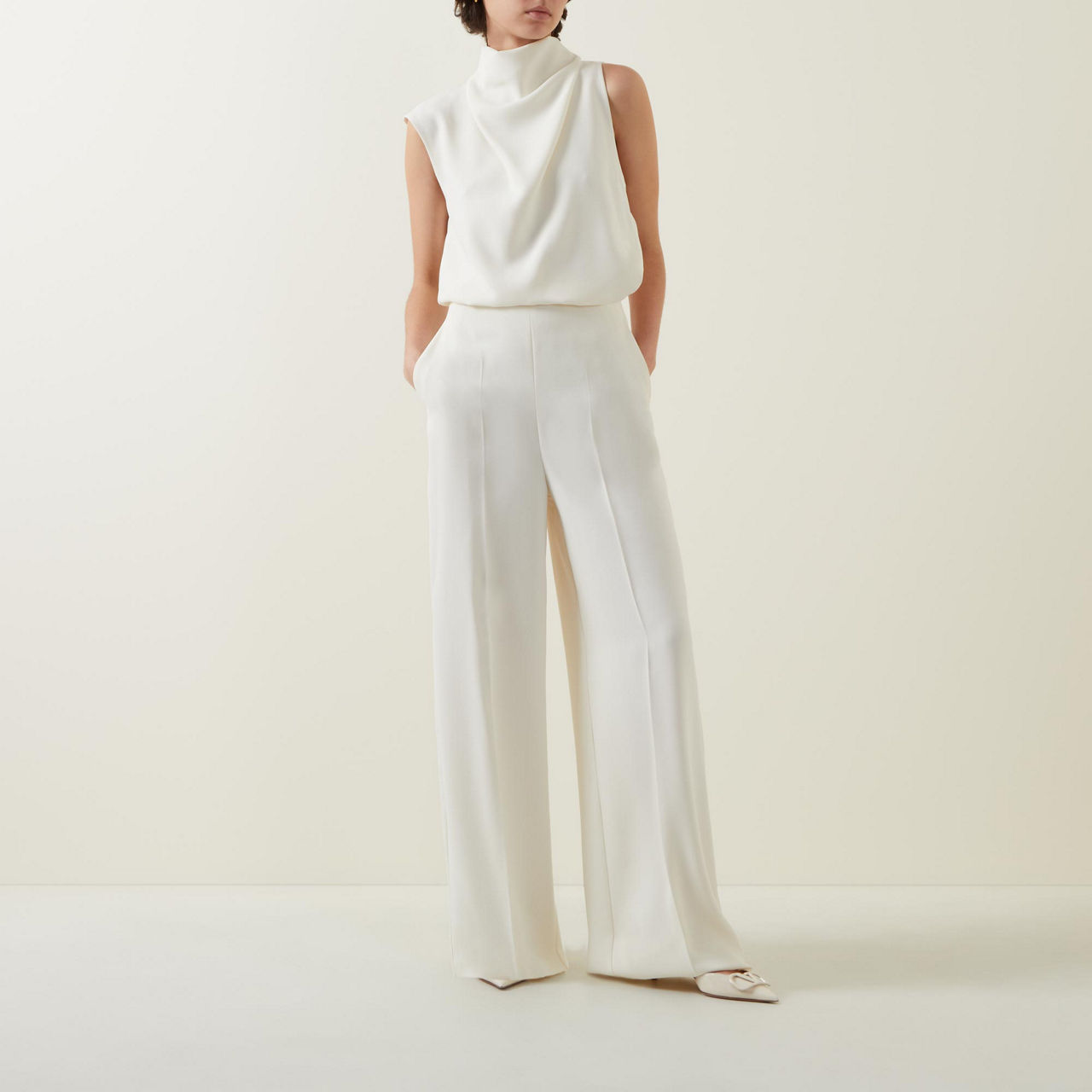 - Funnel neck with gathered detailing, asymmetric sleeveless design, rear elongated keyhole and button fastening, concealed zip fastening, relaxed waist seam, two angled front pockets, two rear welt pockets, wide-leg, pressed creases, crepe-style fabric