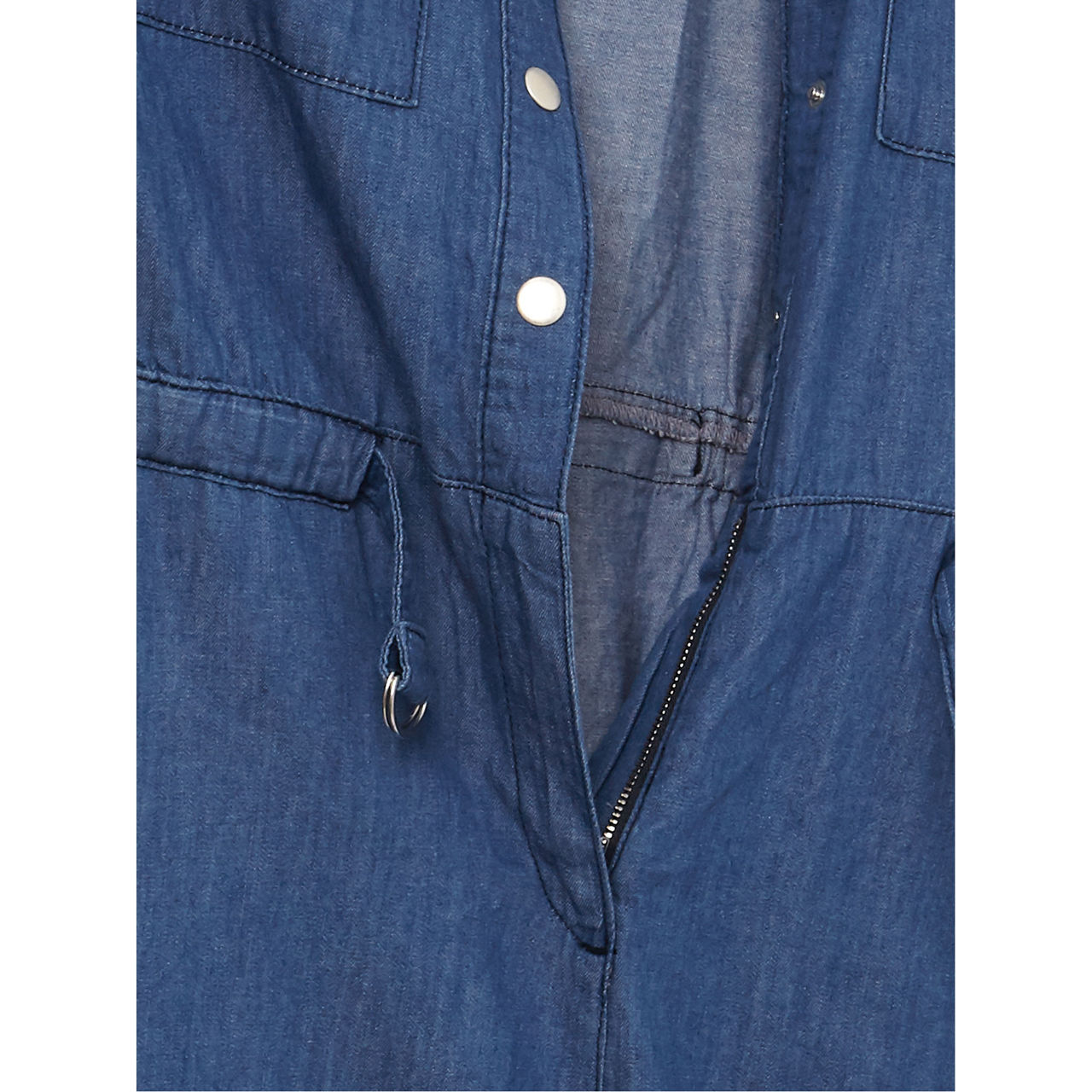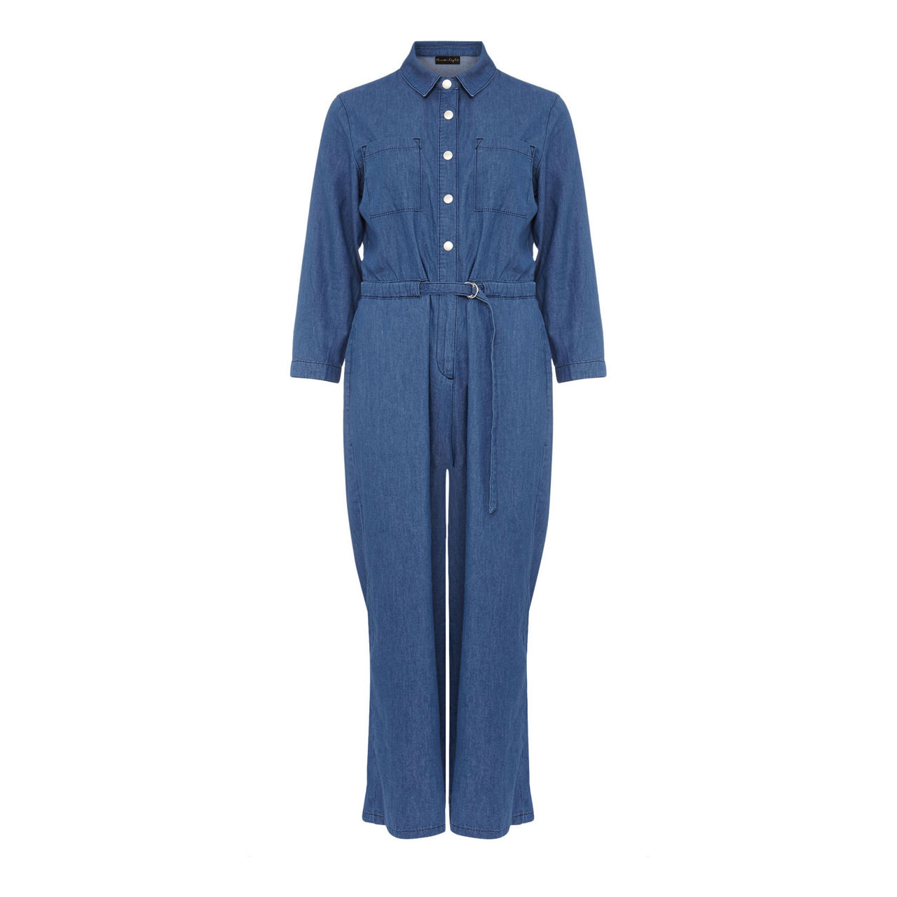 Designed in a utility-inspired boiler silhouette this denim style features long sleeves metallic buttons a D-ring belt and wide leg cut. Roll up the sleeves to the elbow for a relaxed off-duty look.