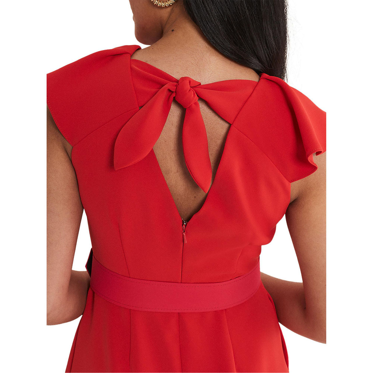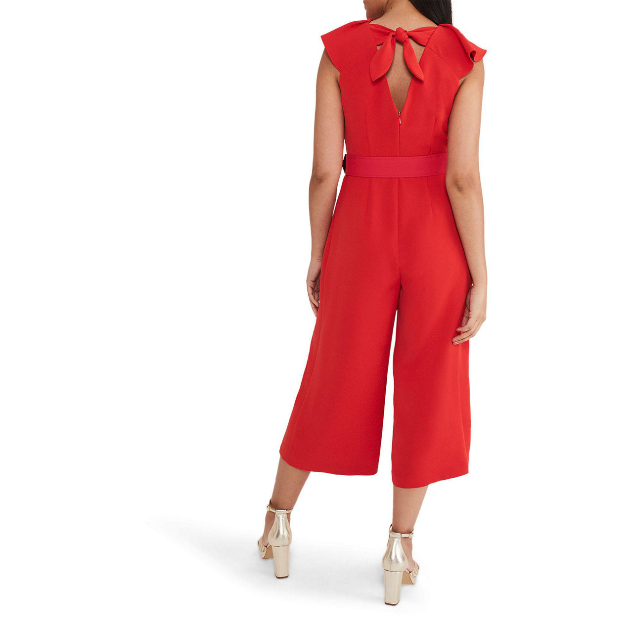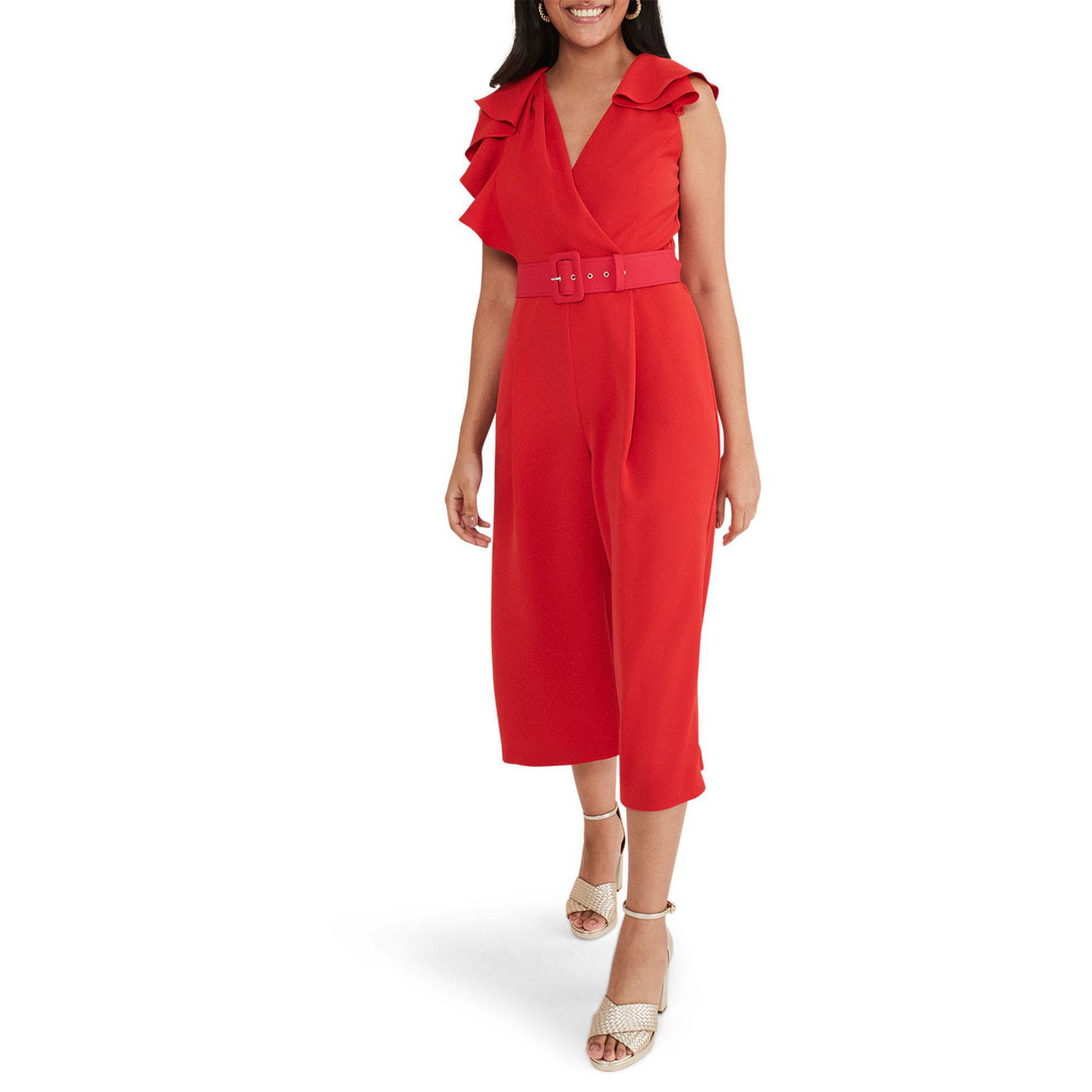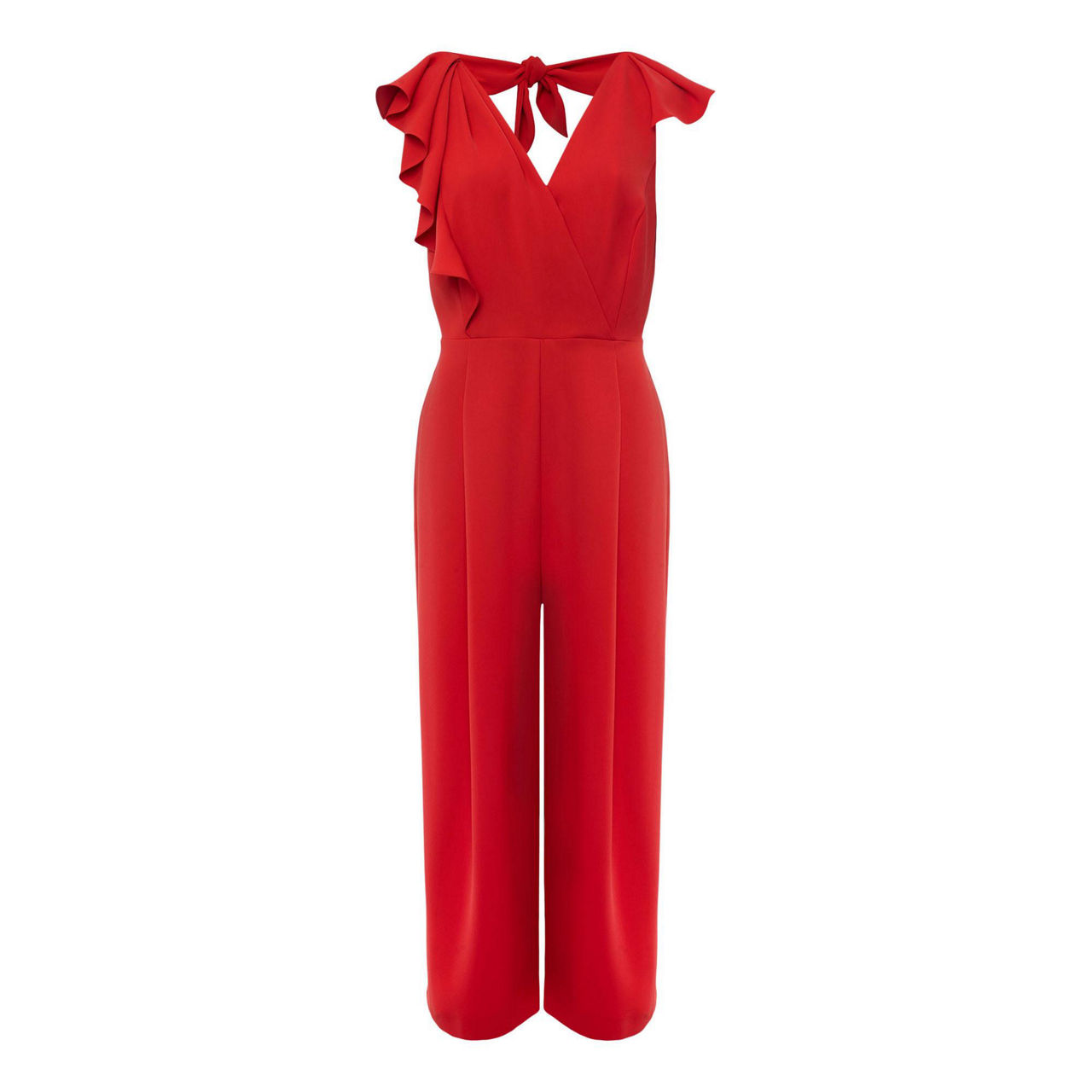 The perfect style for your next special occasion. Designed in a vibrant red shade, Phase Eight's Nicky jumpsuit features ruffled detail on the sleeves, a wrap over bodice and falls to a cropped, wide leg. Wear with heels and a matching clutch for the perfect event-ready look.