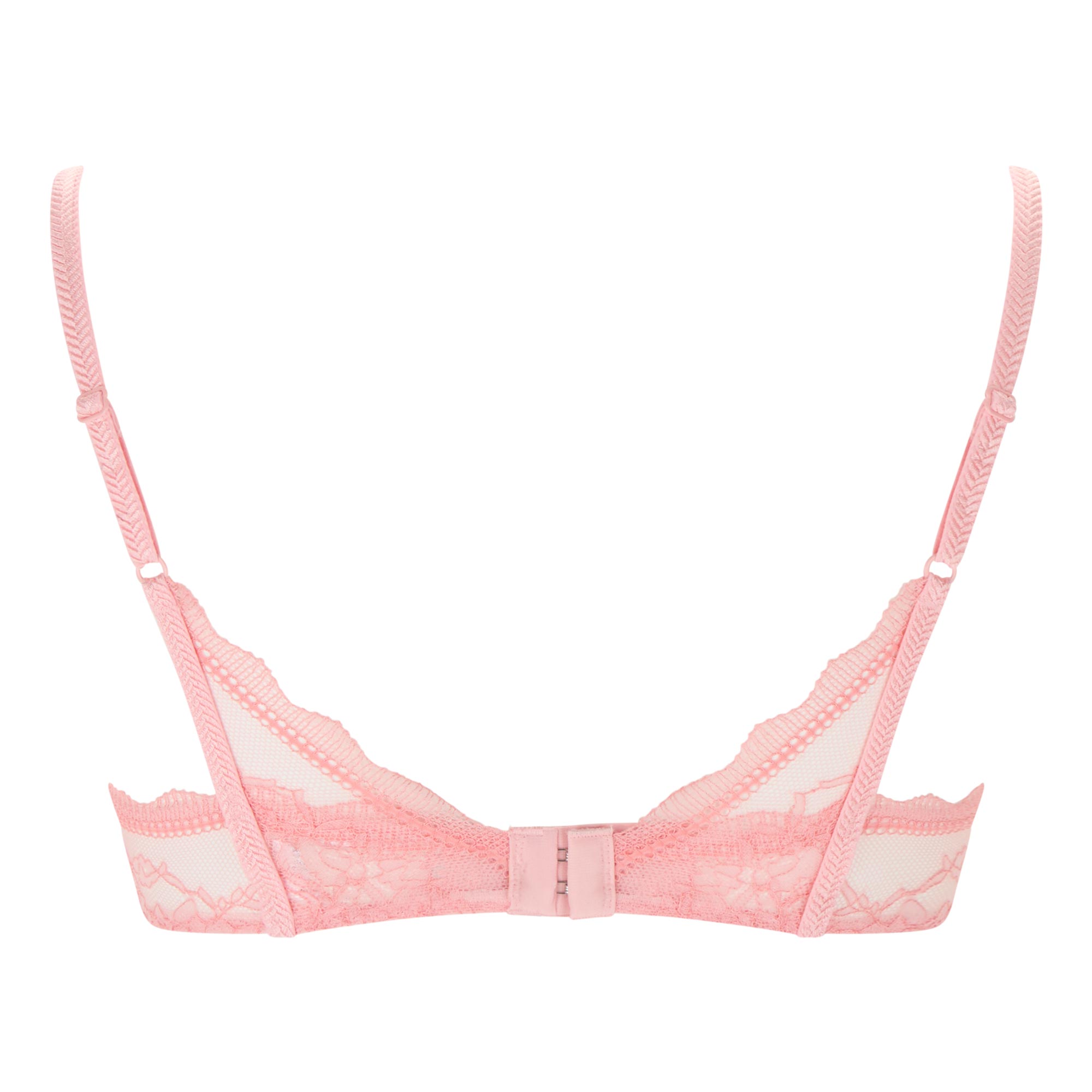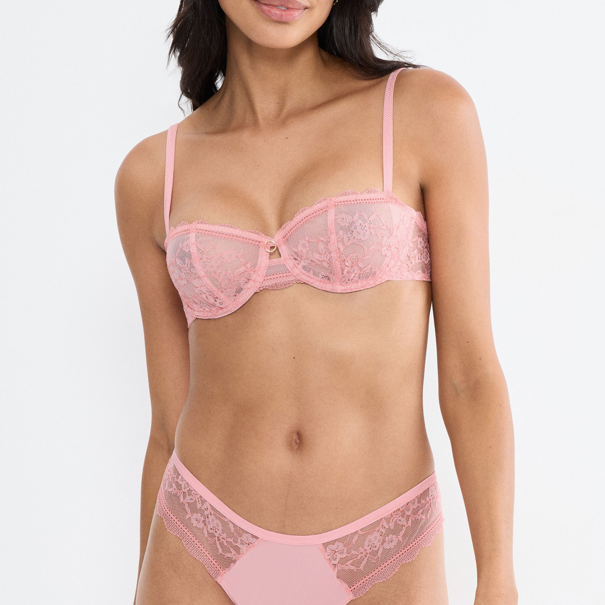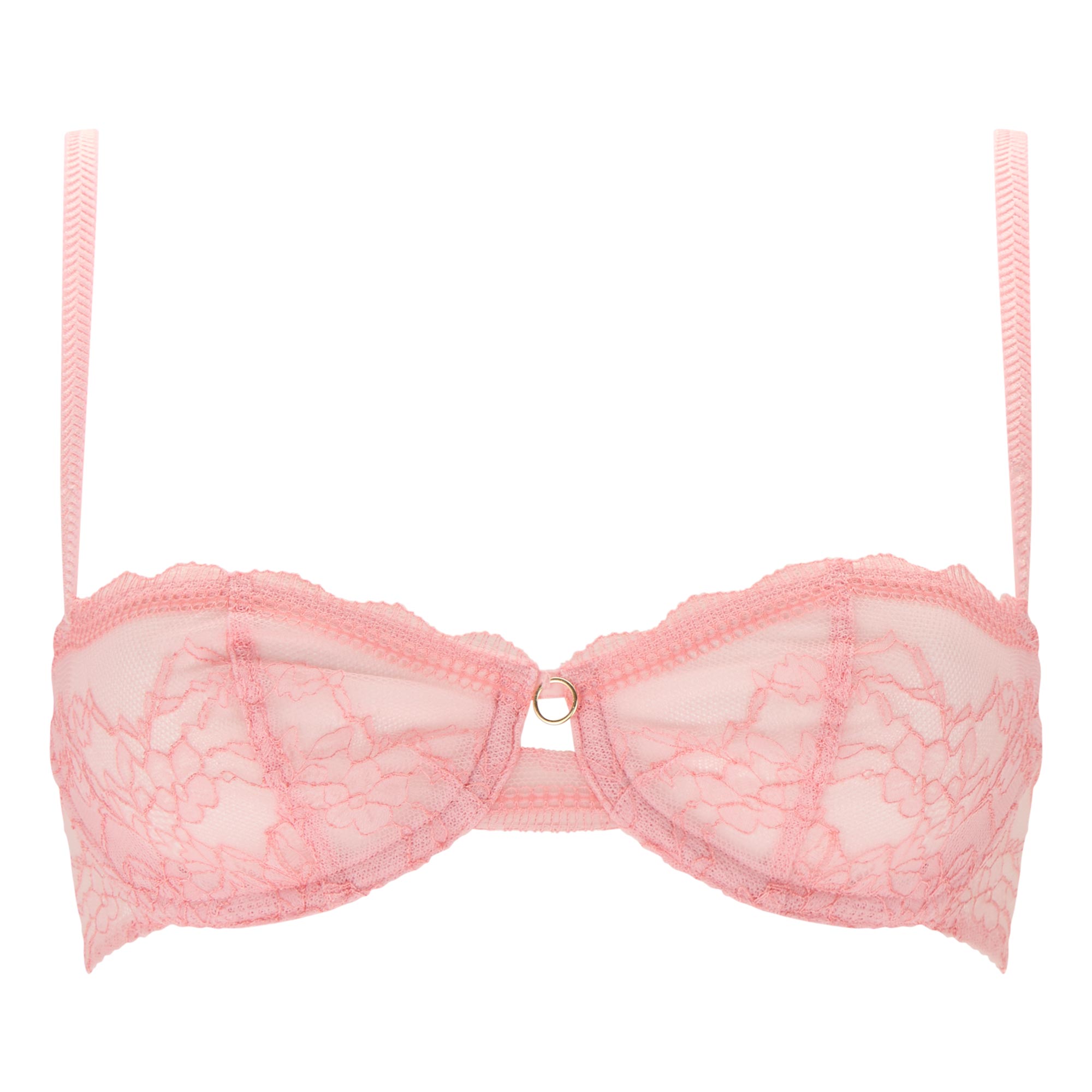- Comfort wire bra, lightly lined with inner side slings to enhance lift and create a naturally rounded shape, soft stretch two-tone floral lace with light cording for an elegant finish, playful keyhole detail and gold-tone ring at the centre front with embellished shoulder straps