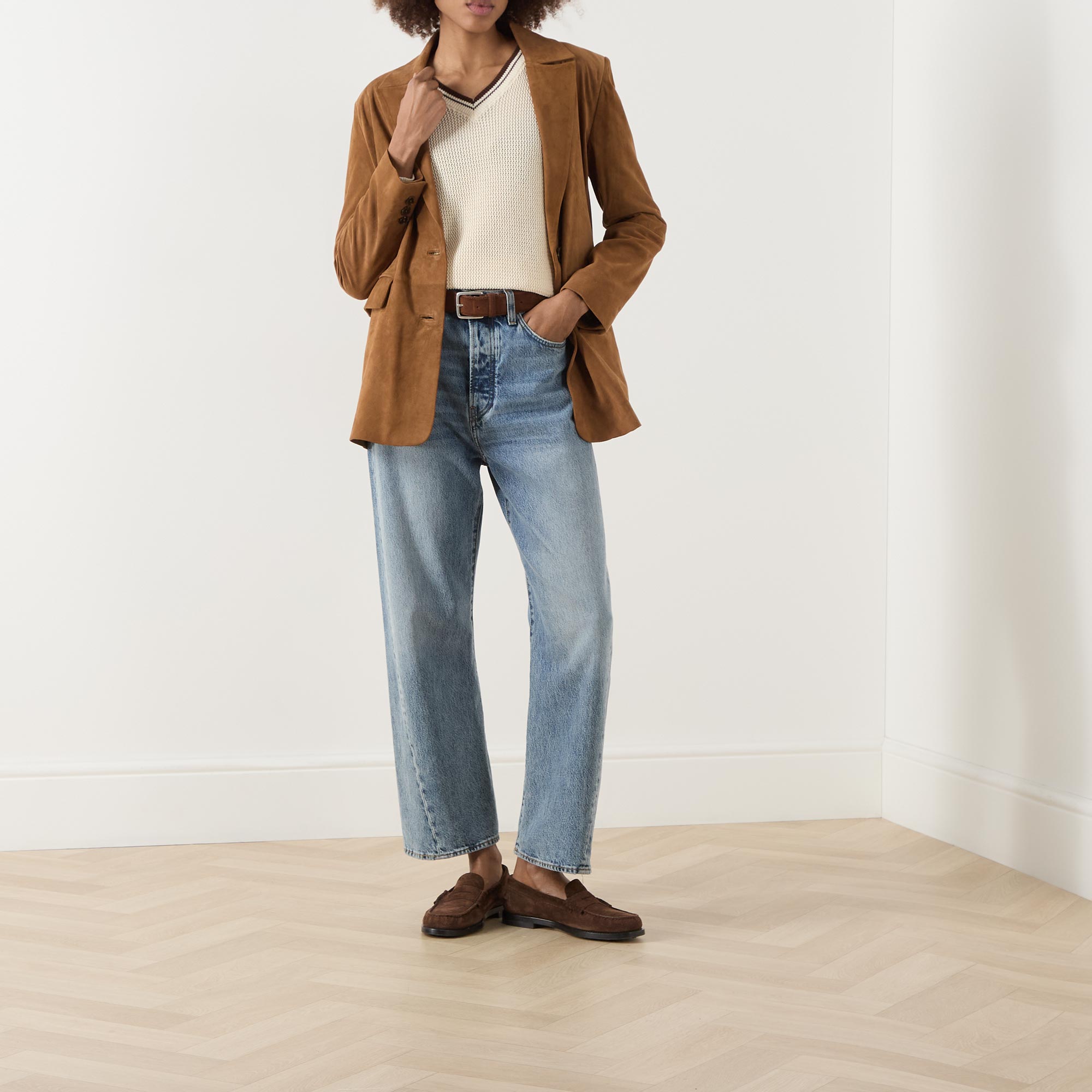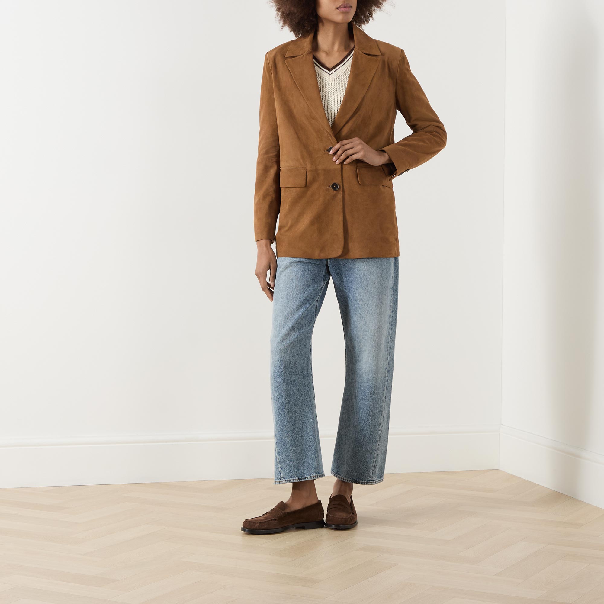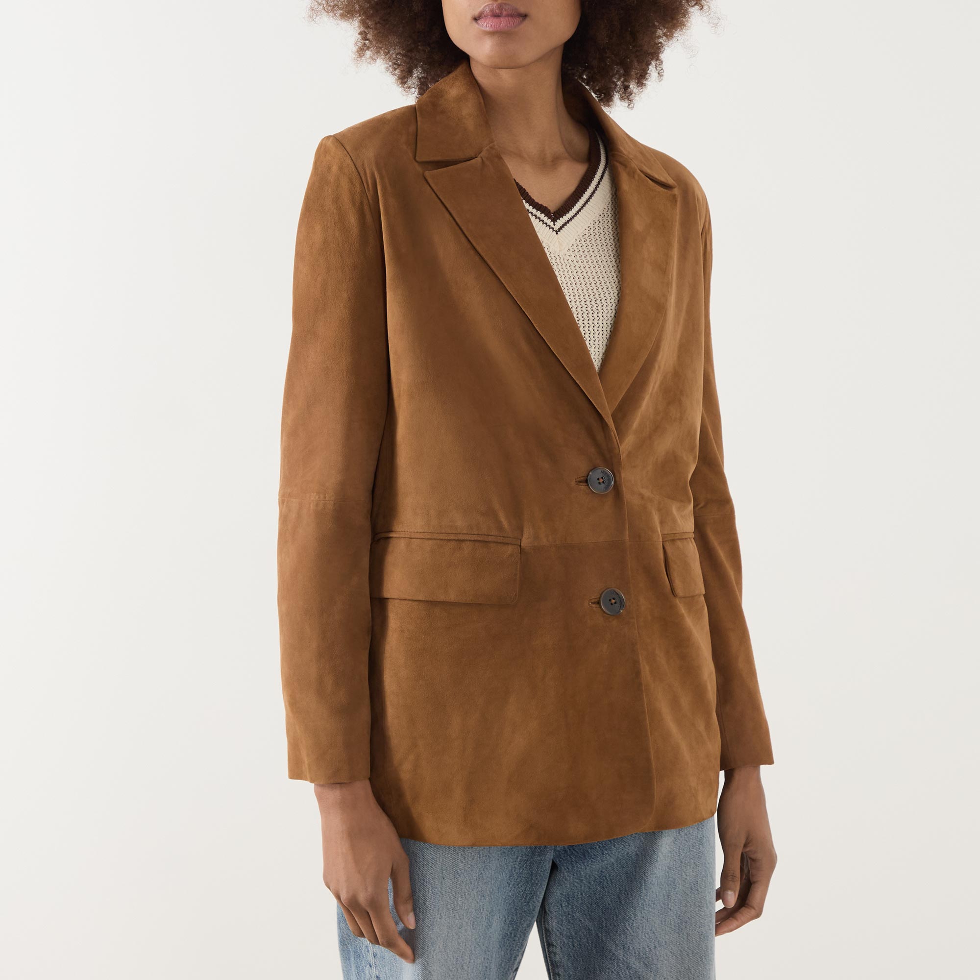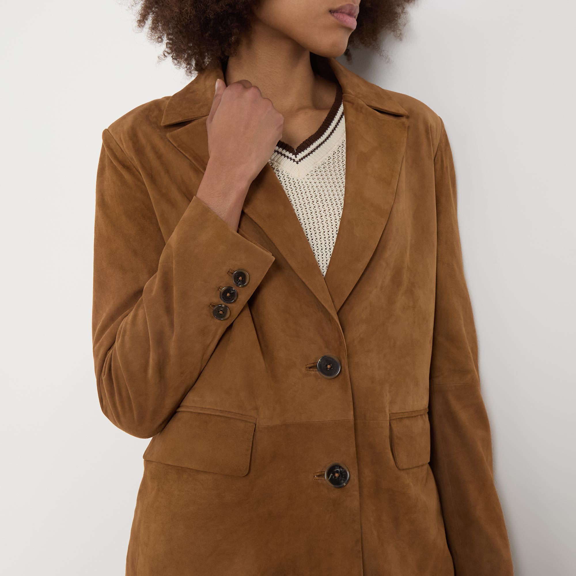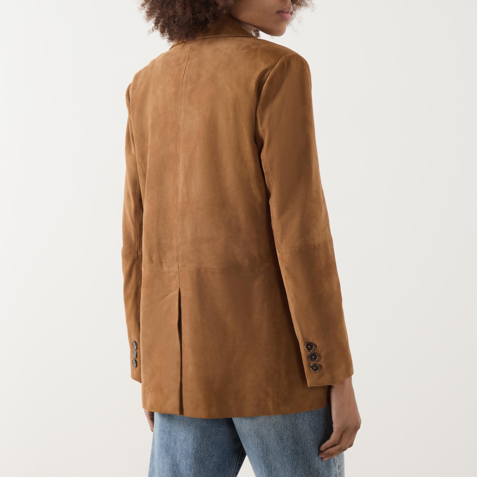 - Single-breasted front, long sleeves, notched-lapel collar, button fastening, two side flap pockets, buttoned cuffs, rear slit, smooth suede leather finish