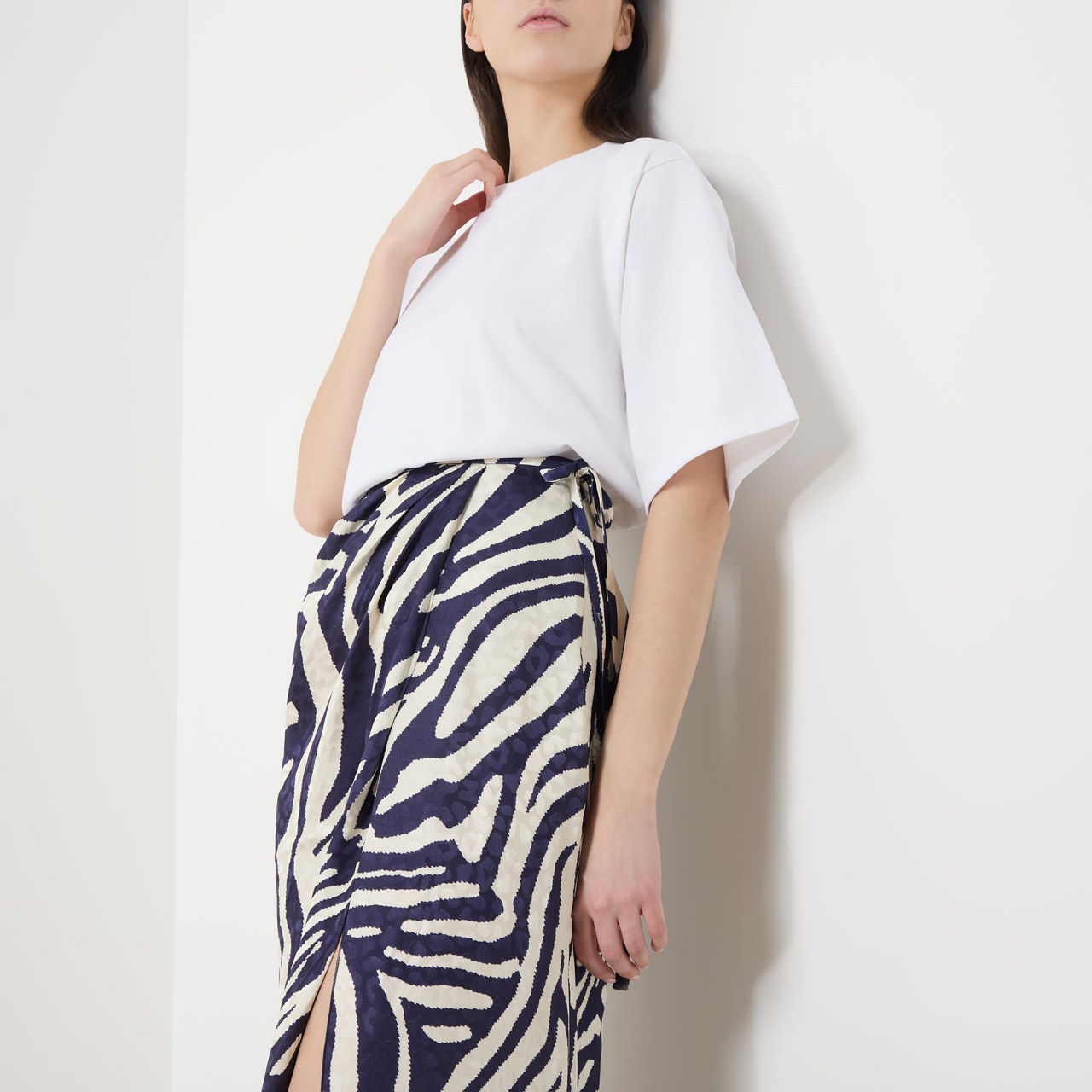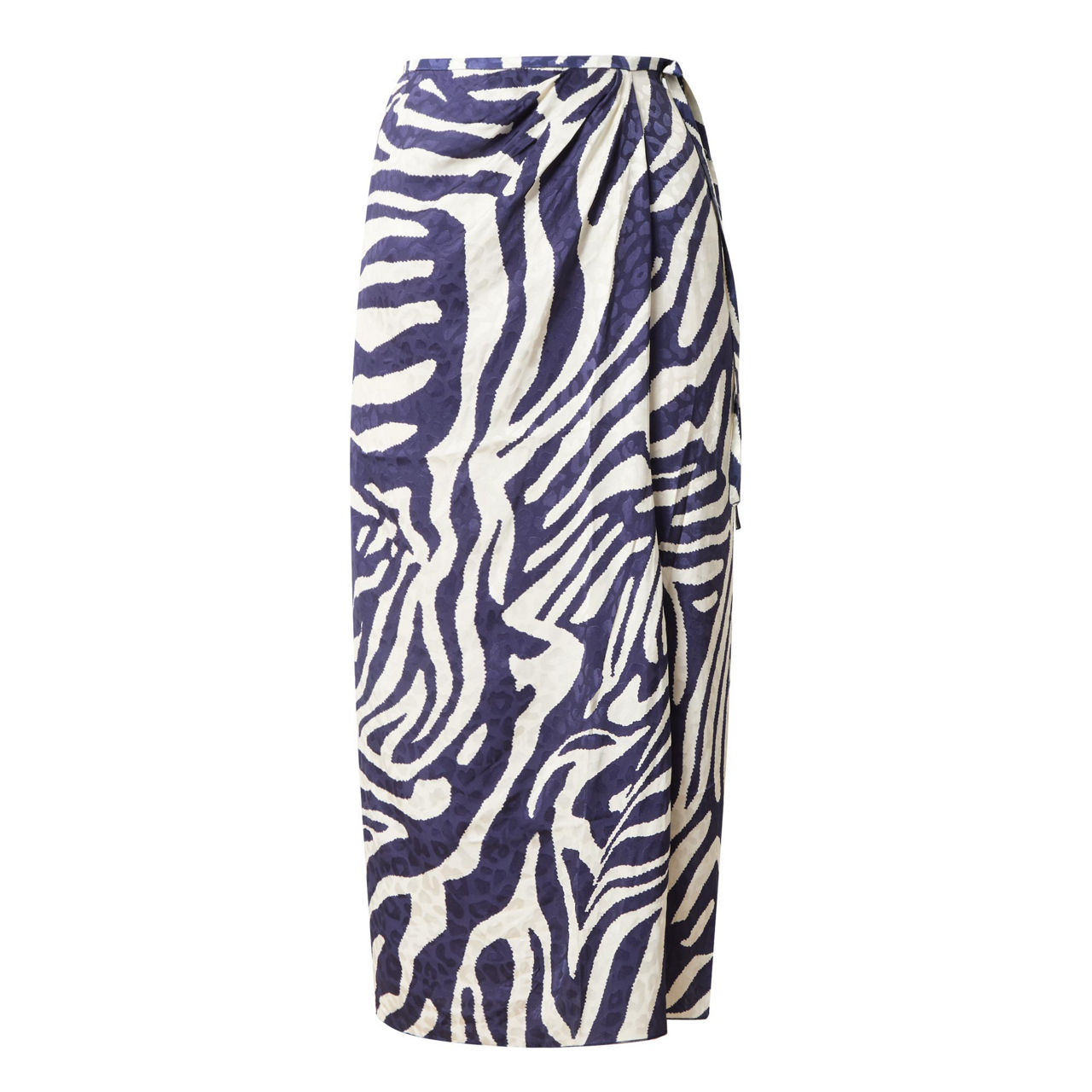 - High-rise, wrap-style, gathered at the waist, self-tie detail, draped effect, concealed zip fastening, all-over zebra print pattern, midi-length