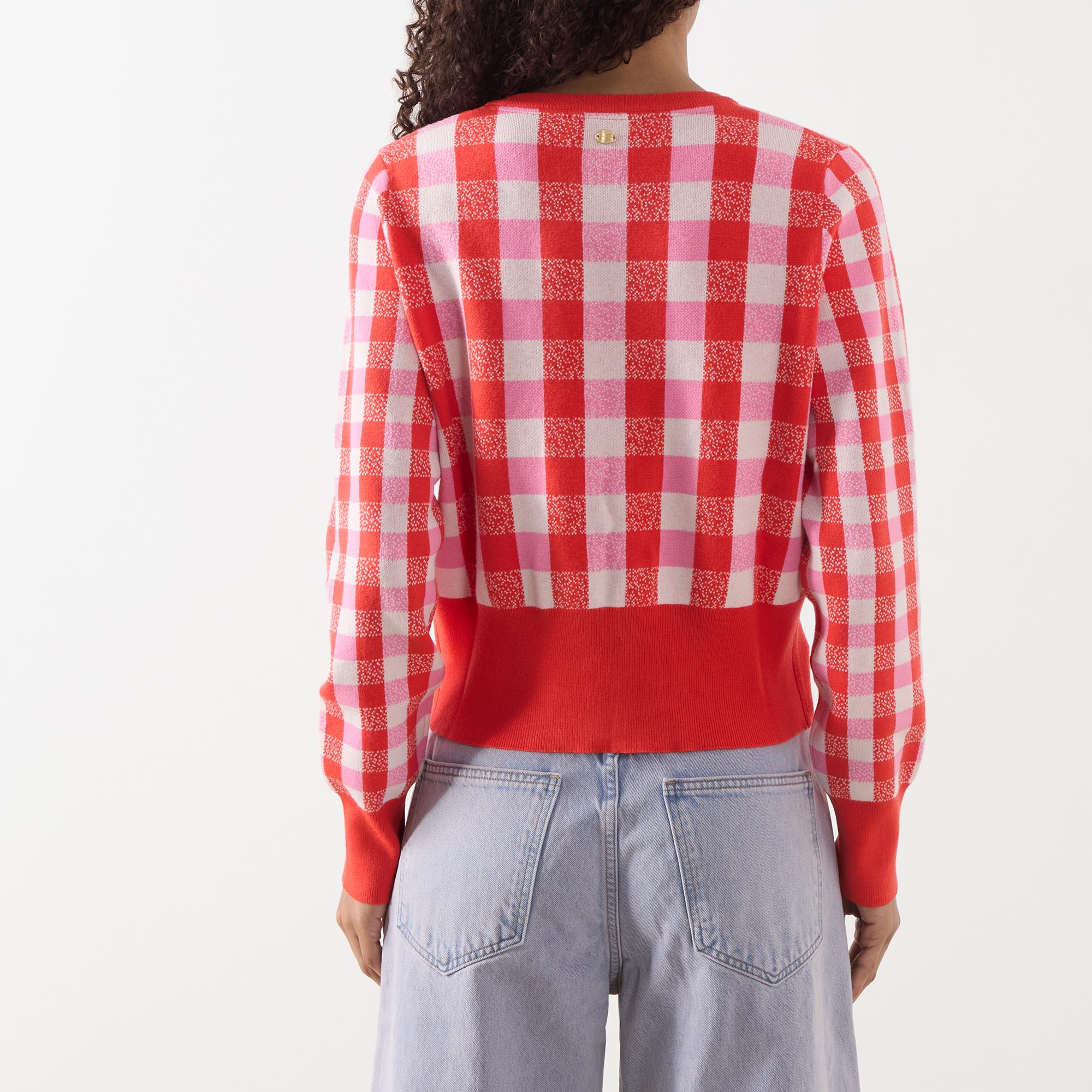 - Crew neckline, long sleeves, tie-front fastening, straight hem, ribbed trims, checkered pattern