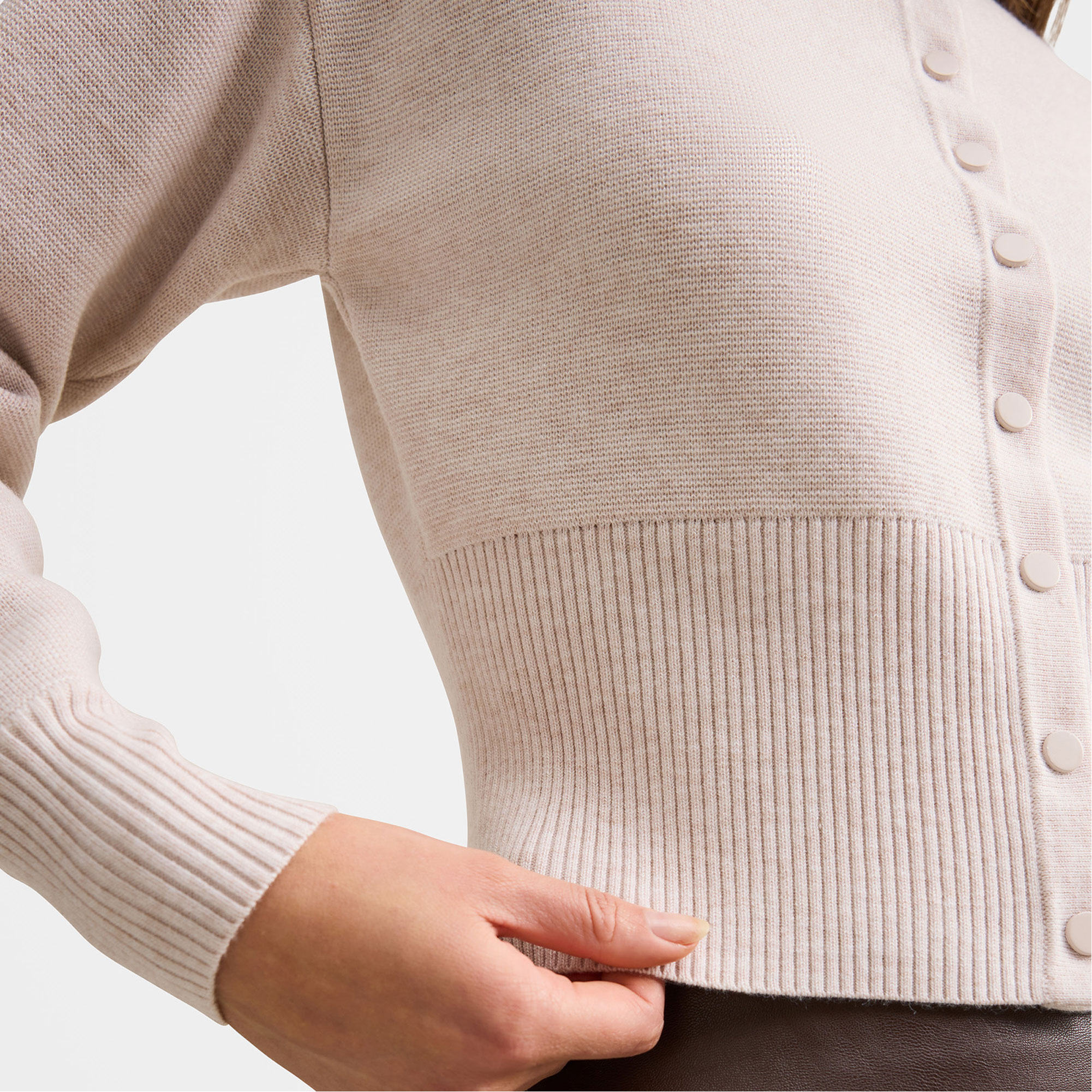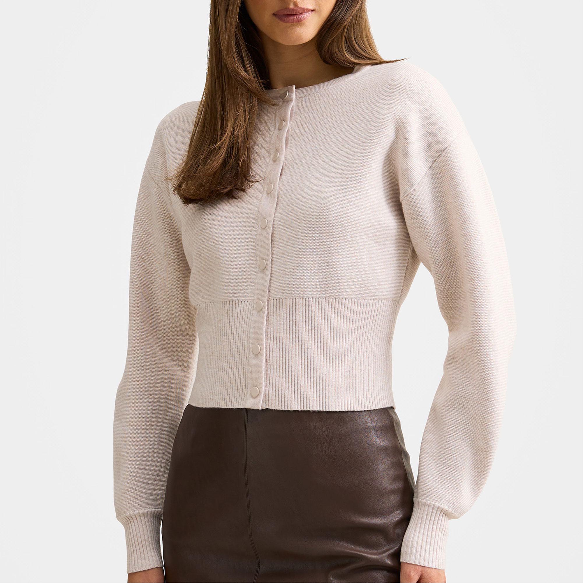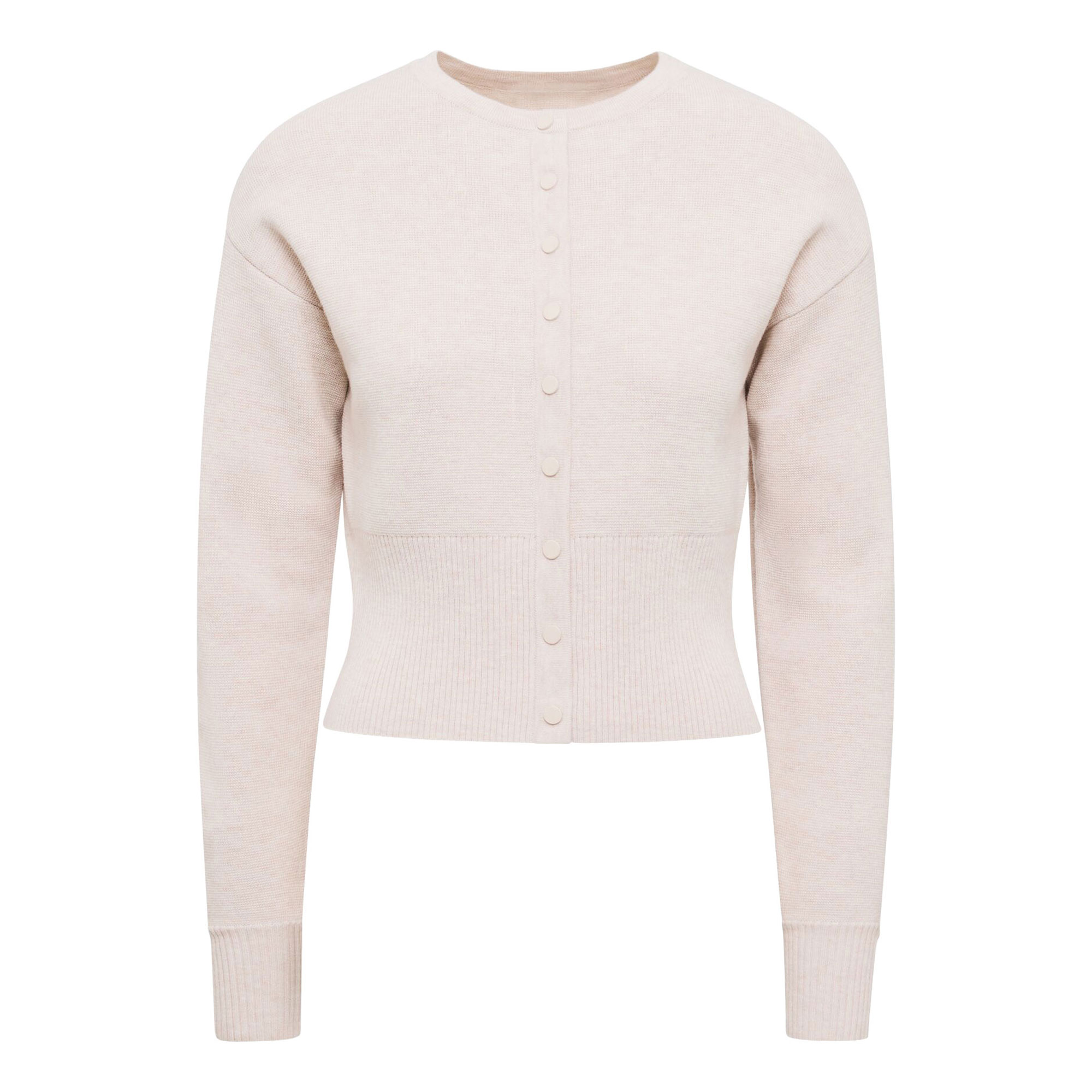 - Ribbed hem and cuffs, round collar neckline, button-down front