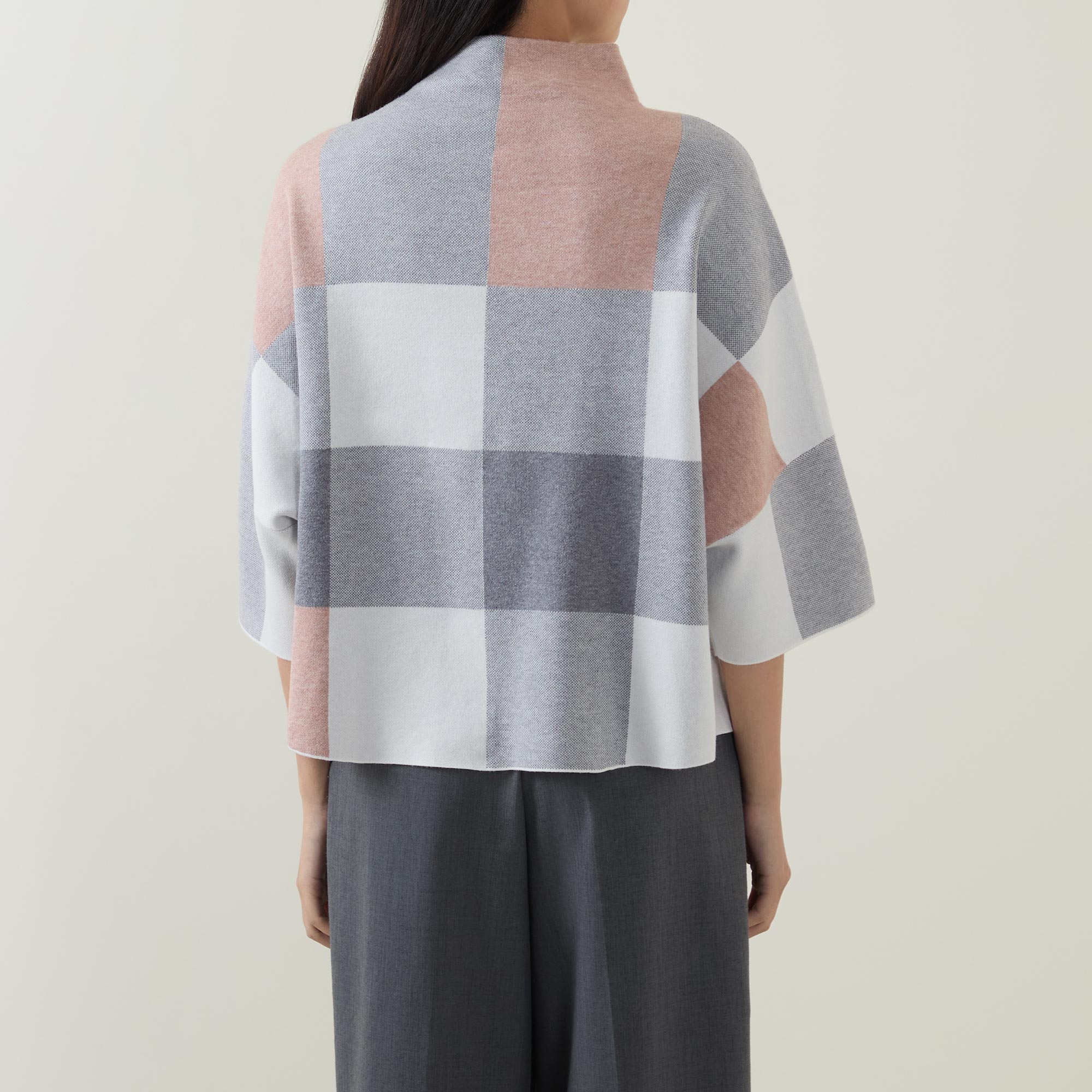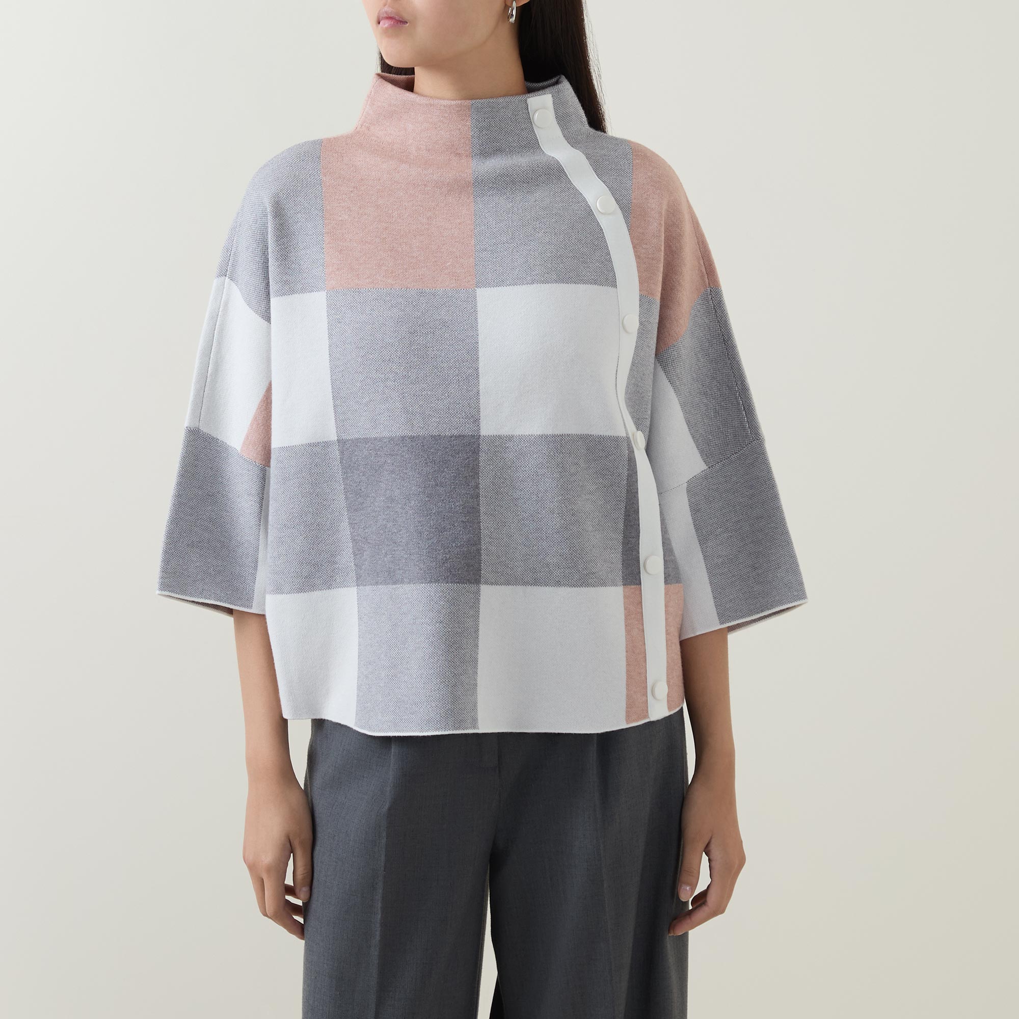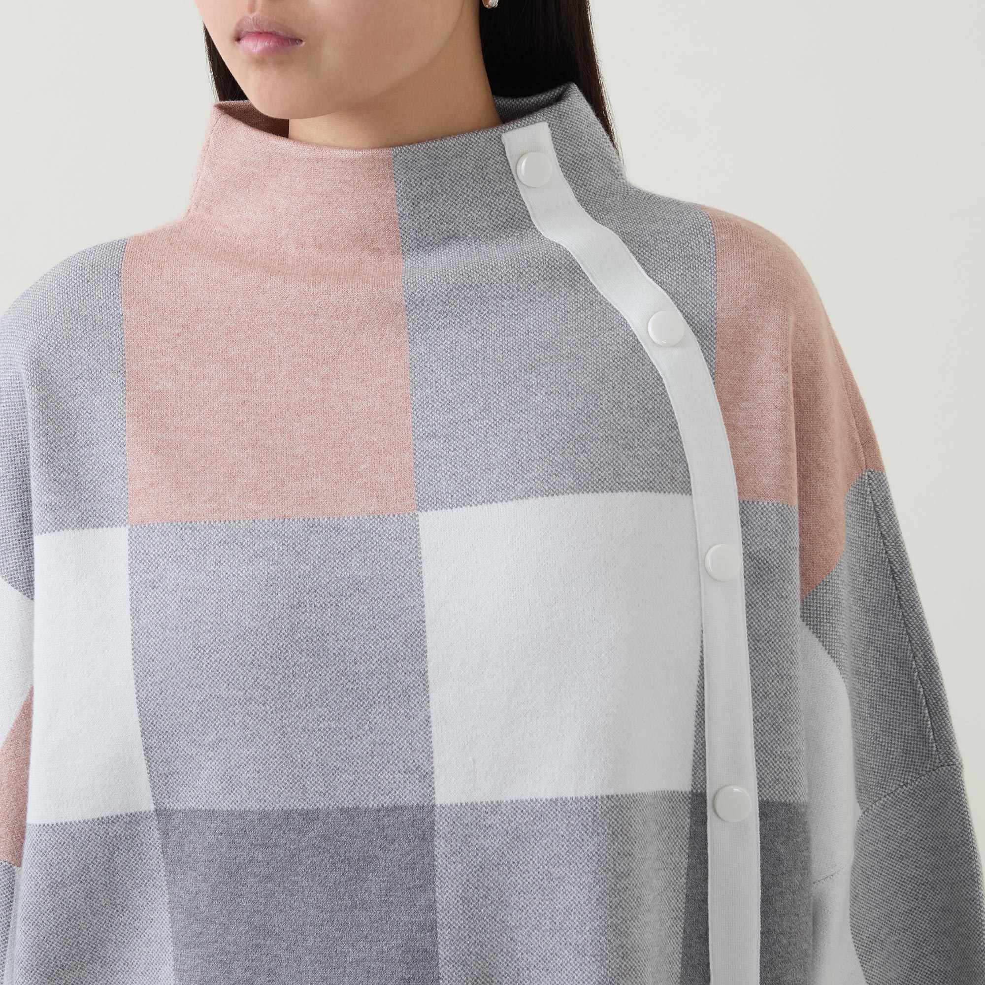 - Checked pattern, turtleneck, cropped batwing sleeves, asymmetric stripe with faux button detail, relaxed fit