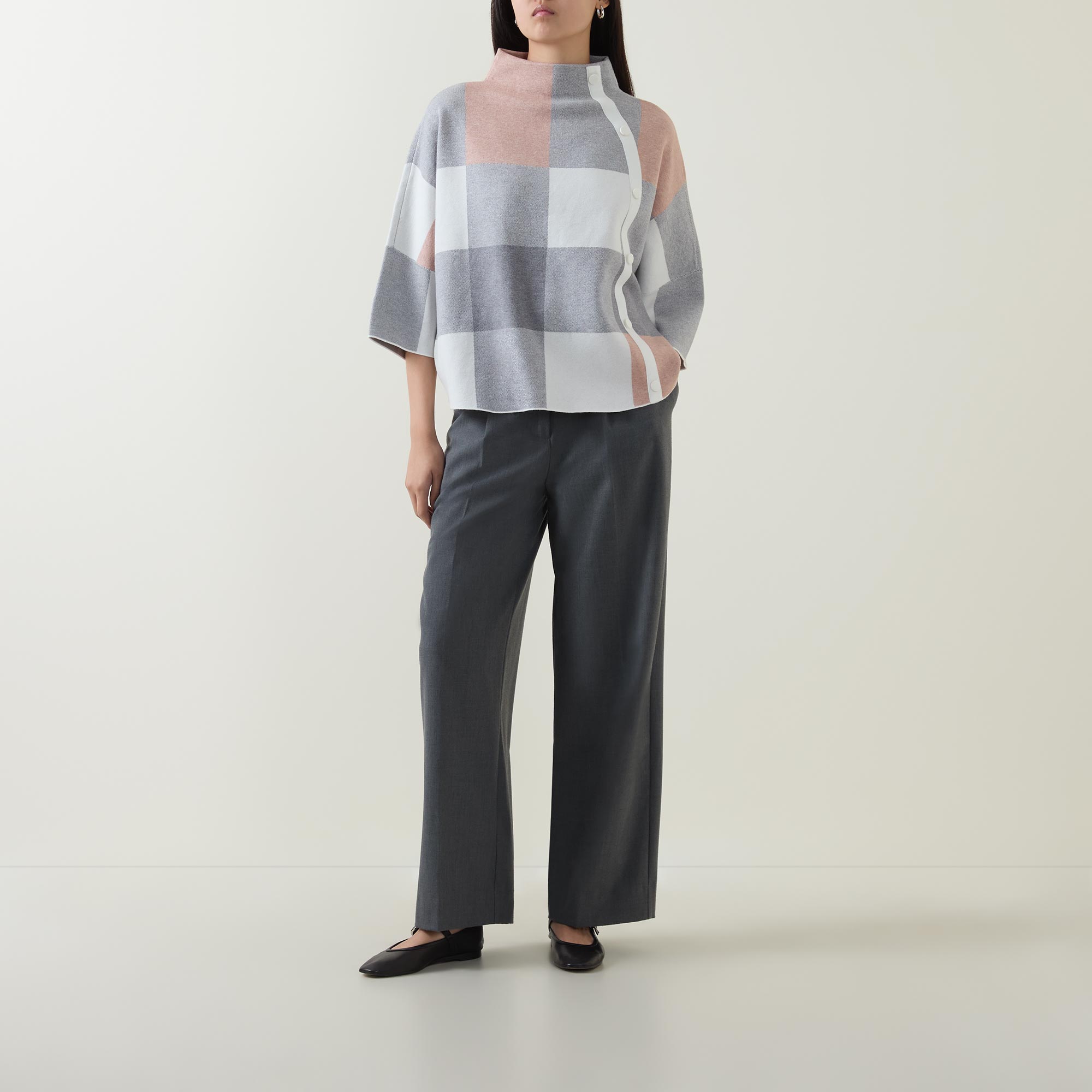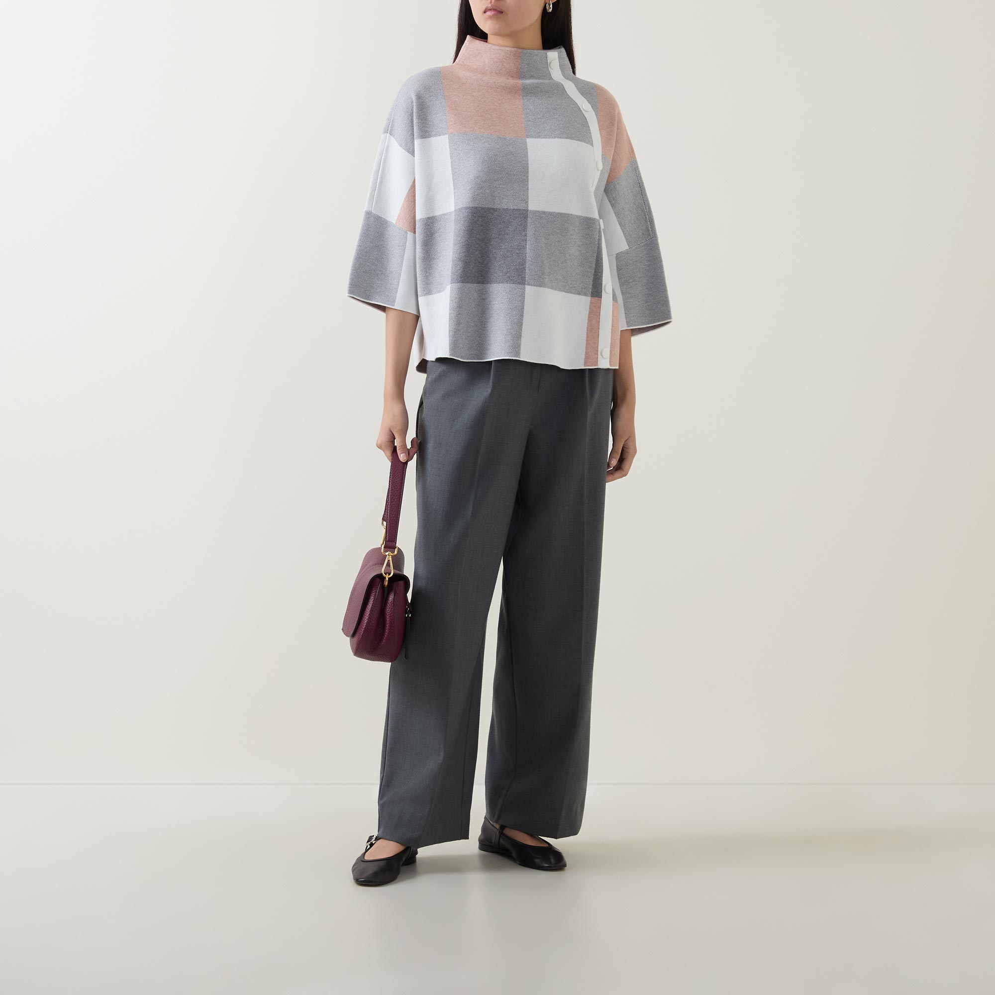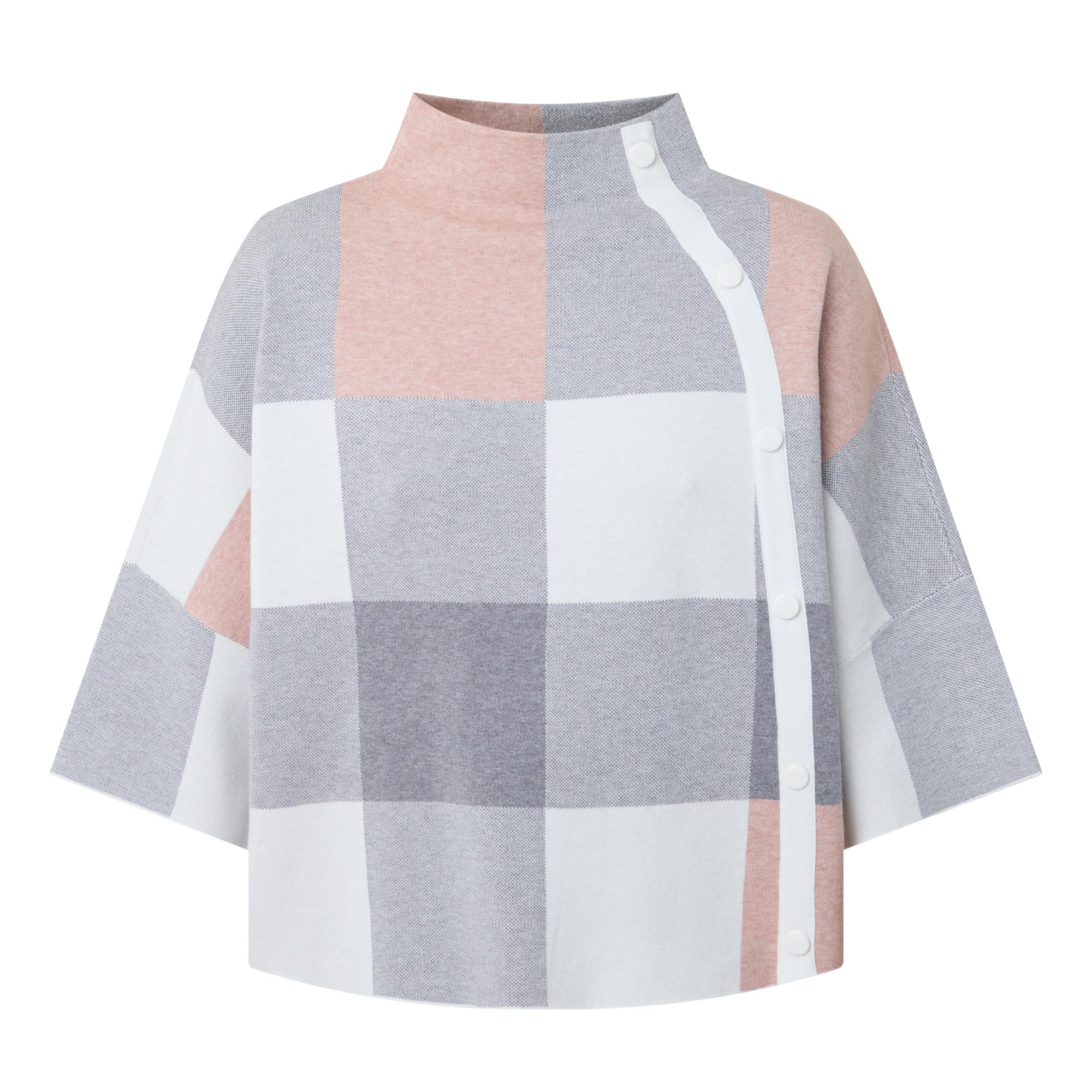 - Checked pattern, turtleneck, cropped batwing sleeves, asymmetric stripe with faux button detail, relaxed fit