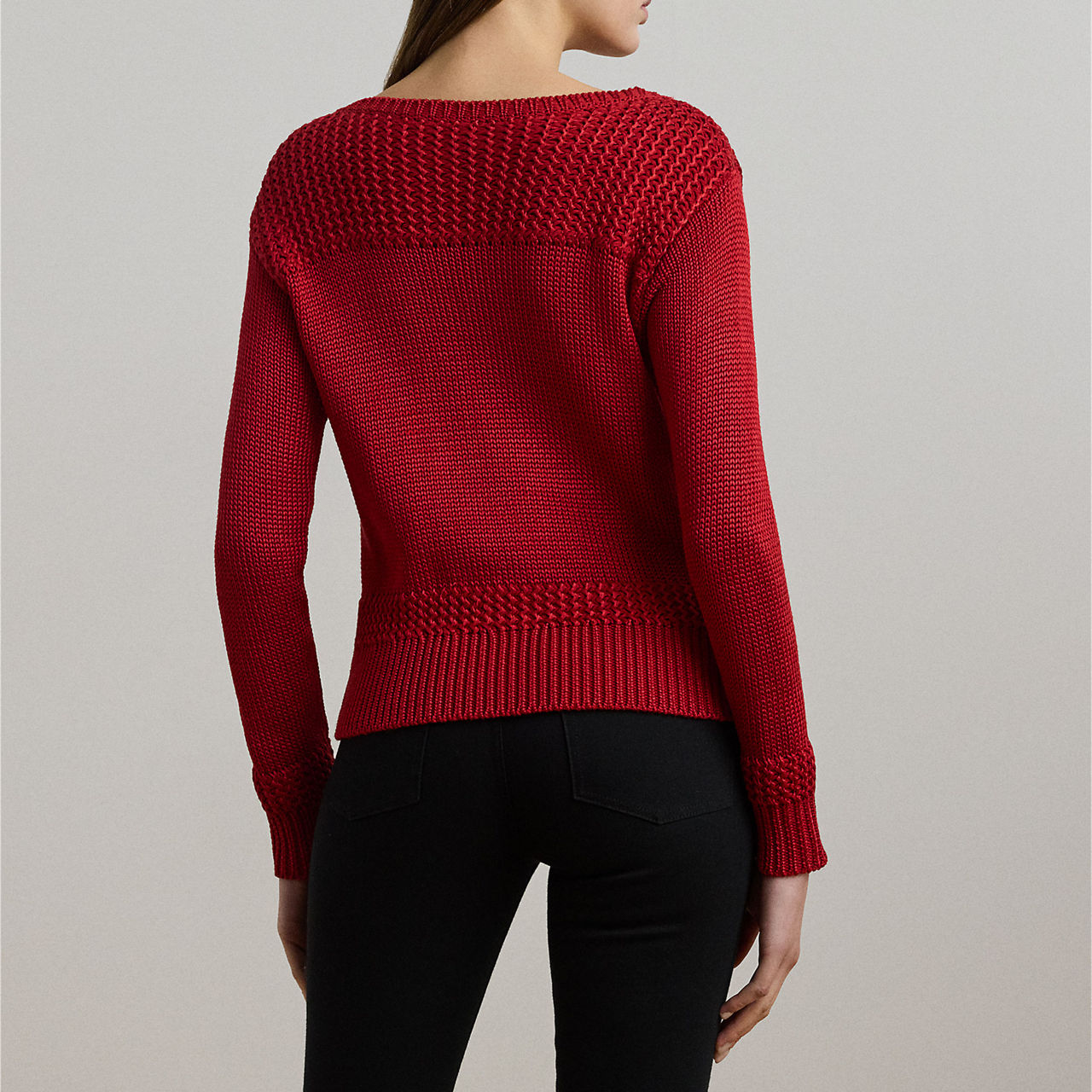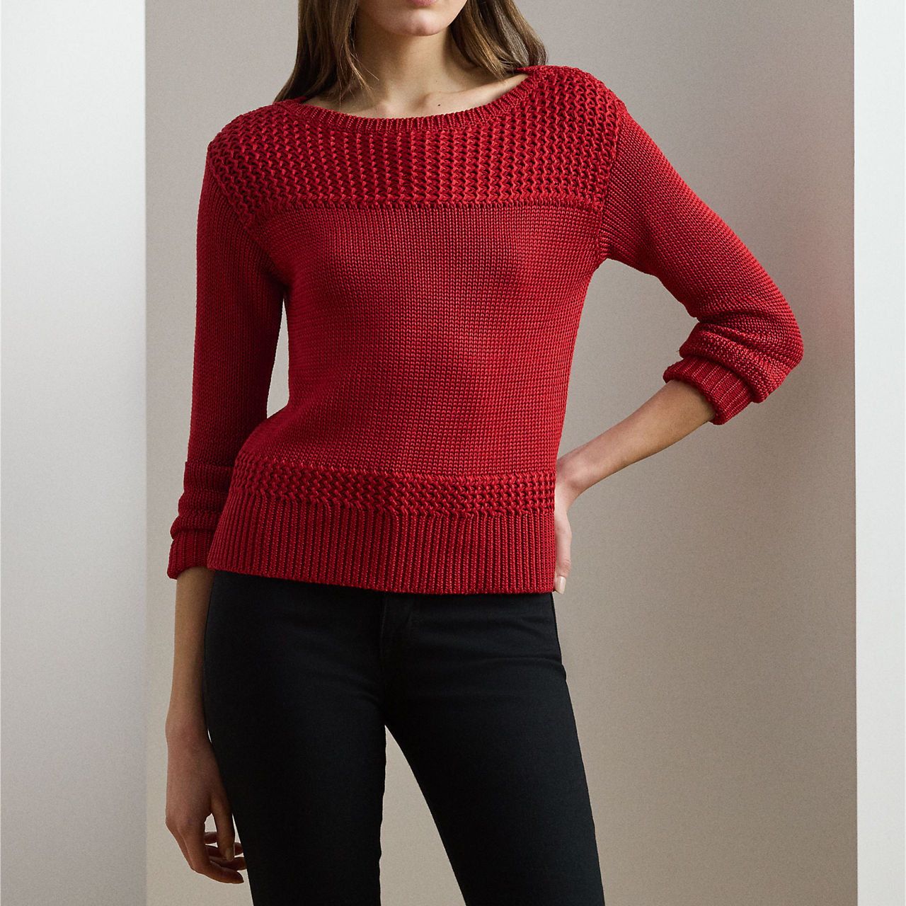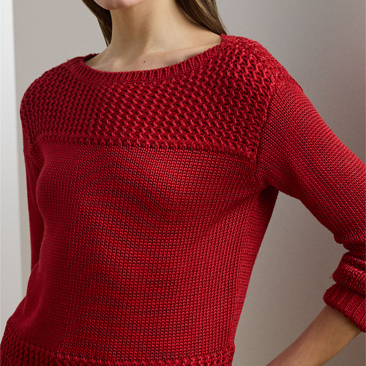• Ribbed boatneck, long sleeves with ribbed cuffs, rack stitching at the yoke, cuffs, and hem, ribbed hem