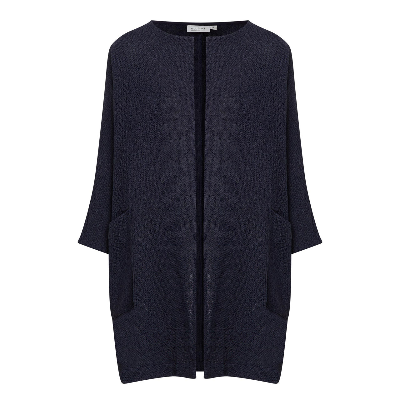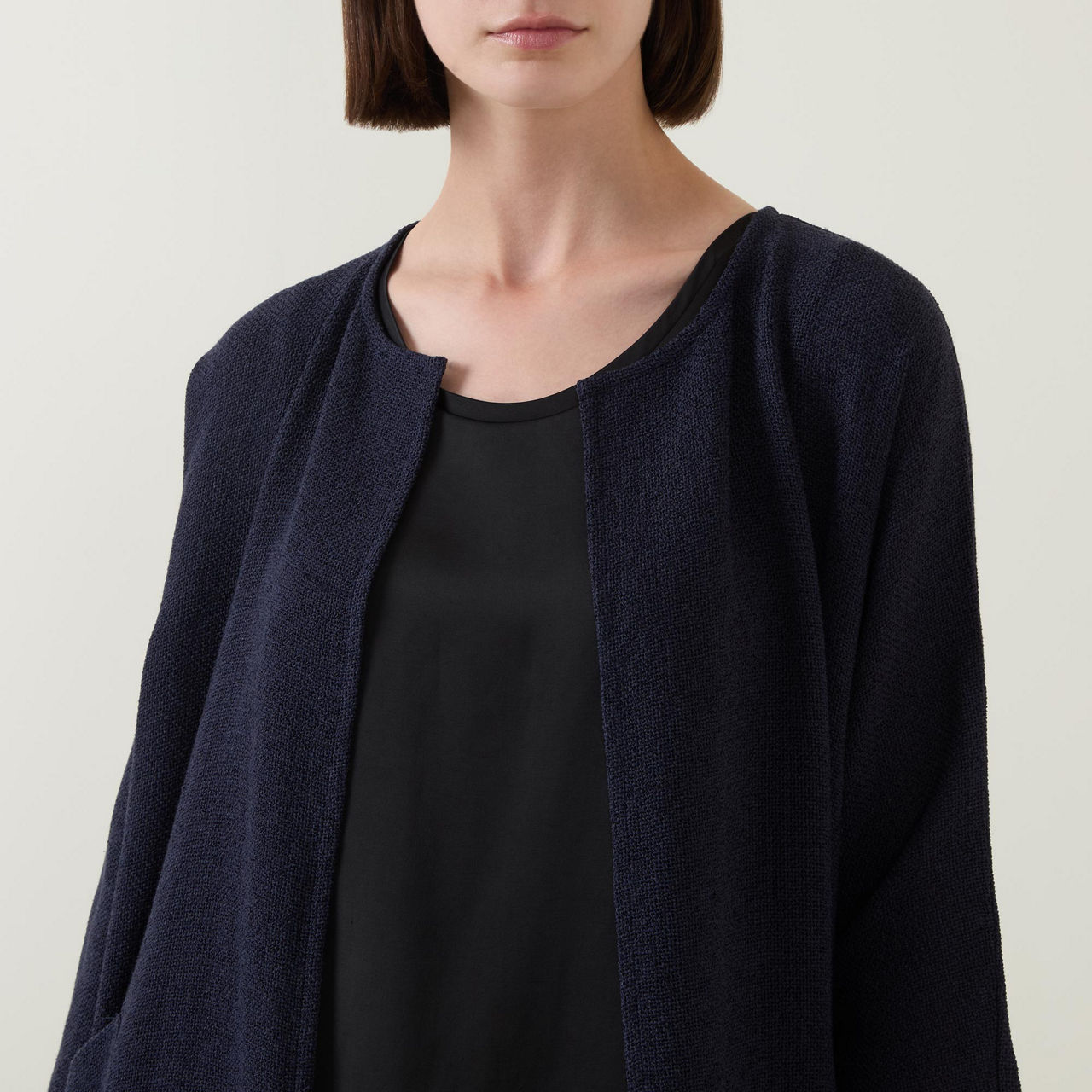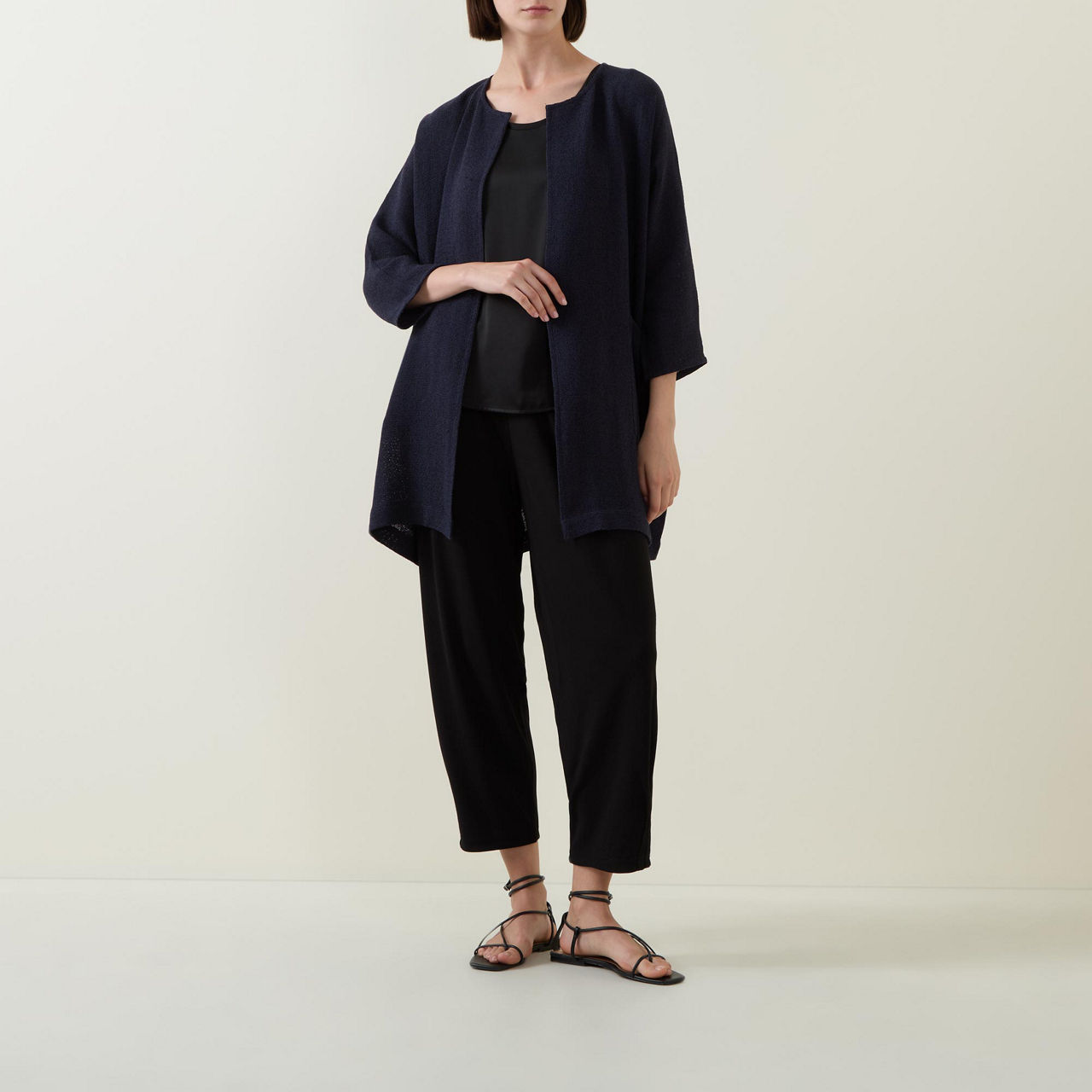 - Open-style, draped design, rounded shoulders, three-quarter length sleeves, two front patch pockets, straight hem, bouclé textured finish