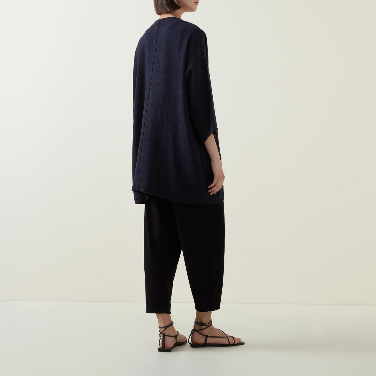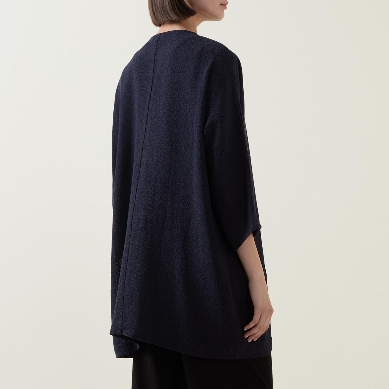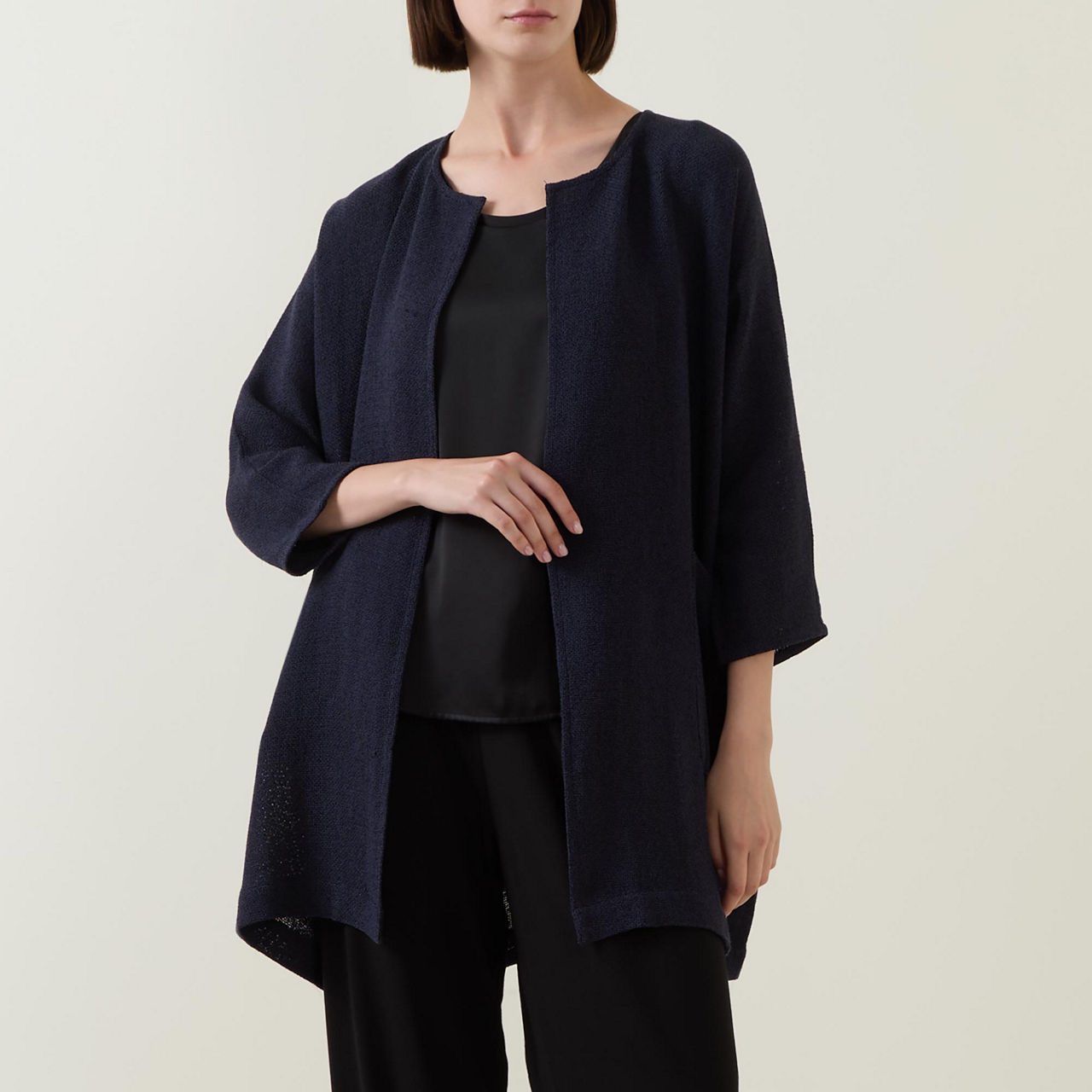 - Open-style, draped design, rounded shoulders, three-quarter length sleeves, two front patch pockets, straight hem, bouclé textured finish