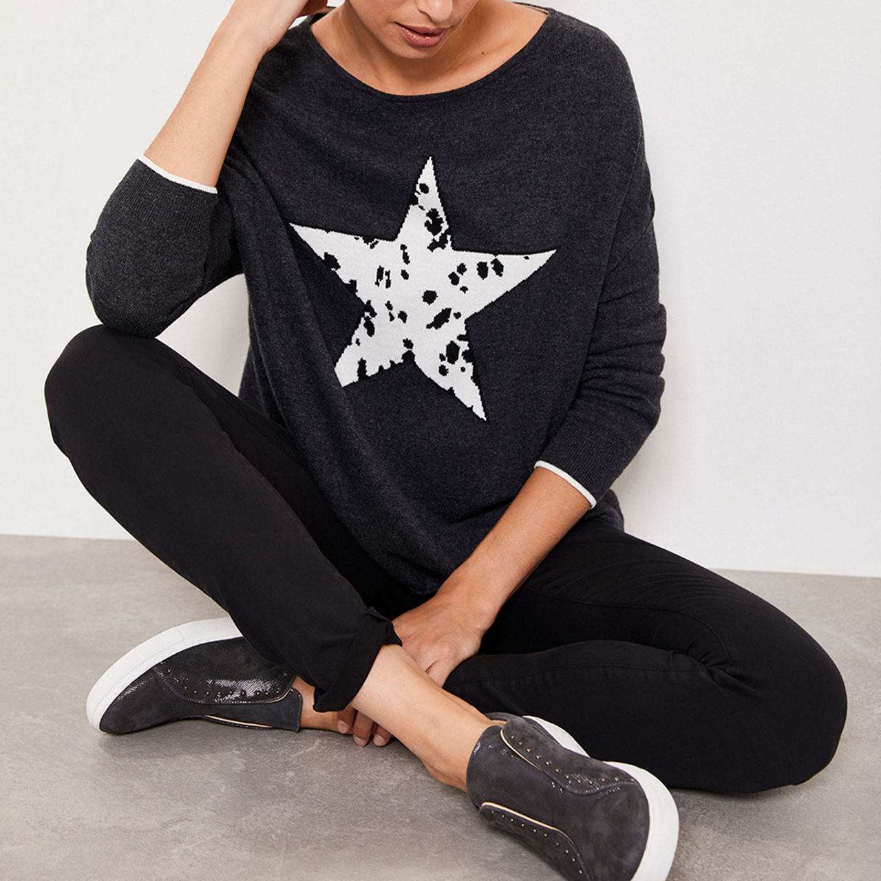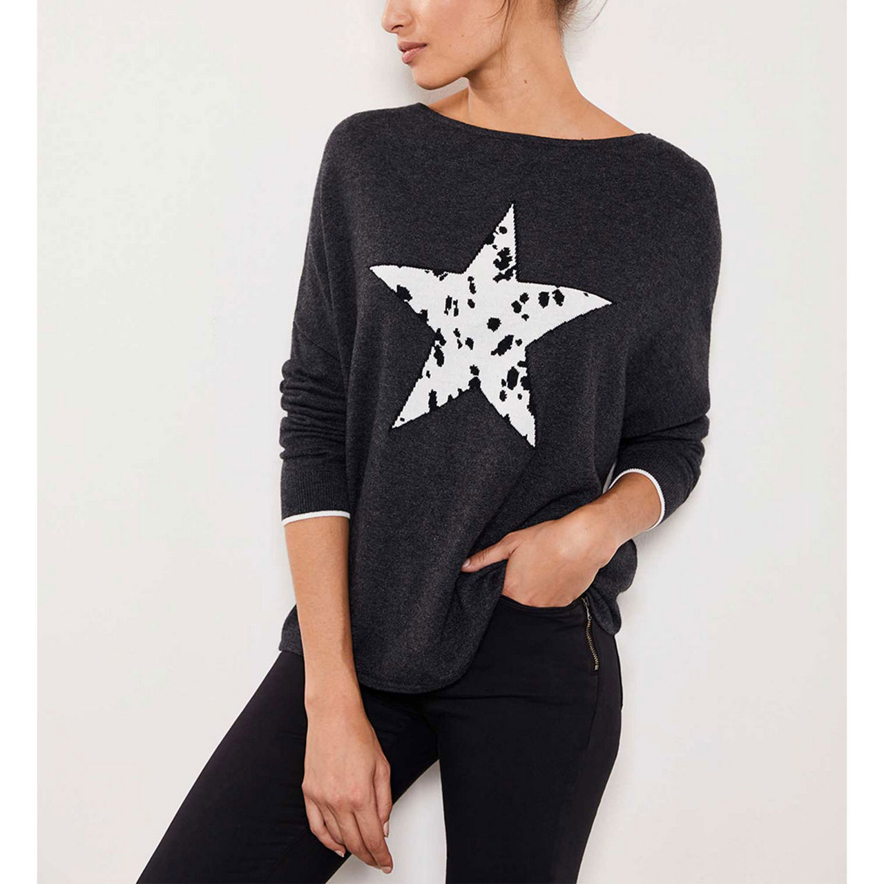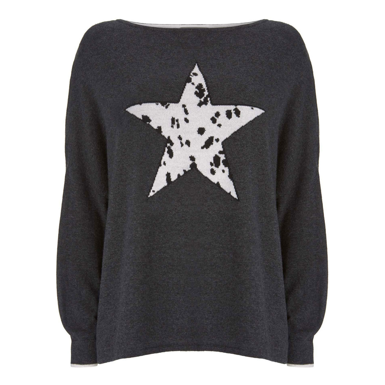 Spun with a touch of cashmere for softness, this long-sleeved charcoal jumper is designed in a relaxed silhouette that's perfect for every day. It's framed by a wide neckline and features a black and white star motif on its front - it's knitted in a Dalmatian pattern for a fresh take on the animal trend.