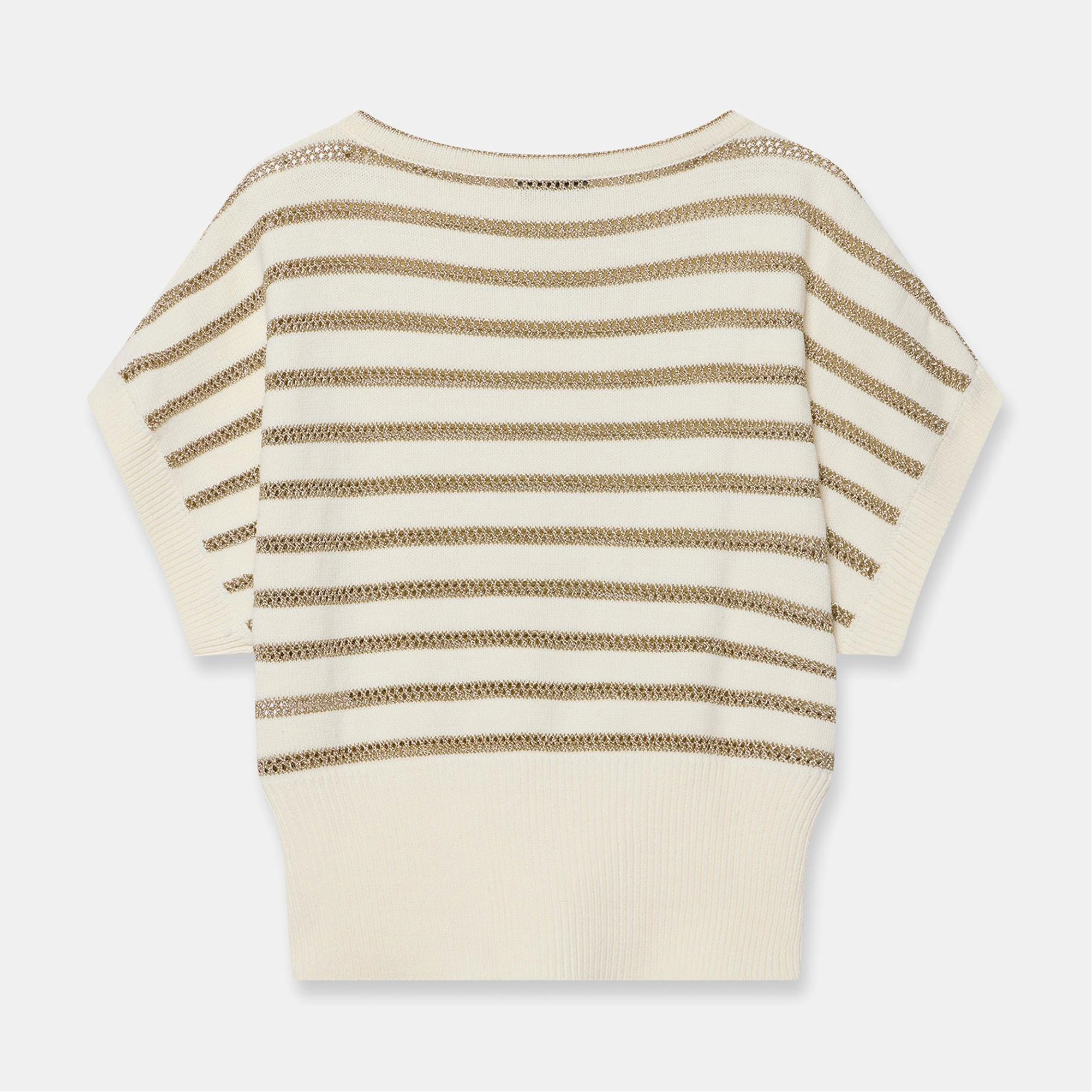 - Slash neckline, short sleeves, wide waistband, striped design, metallic finish