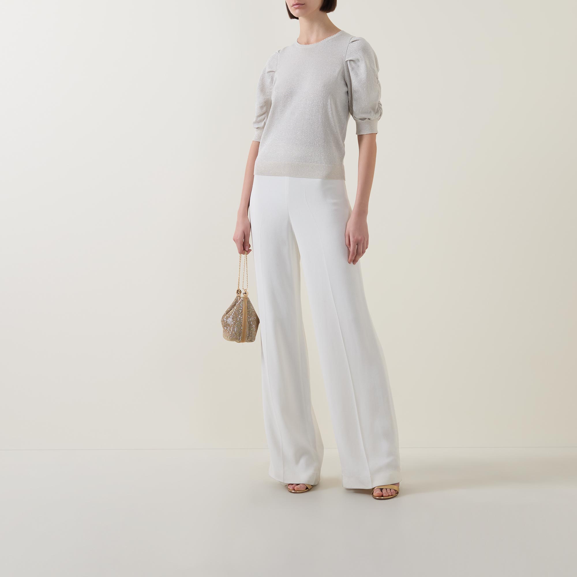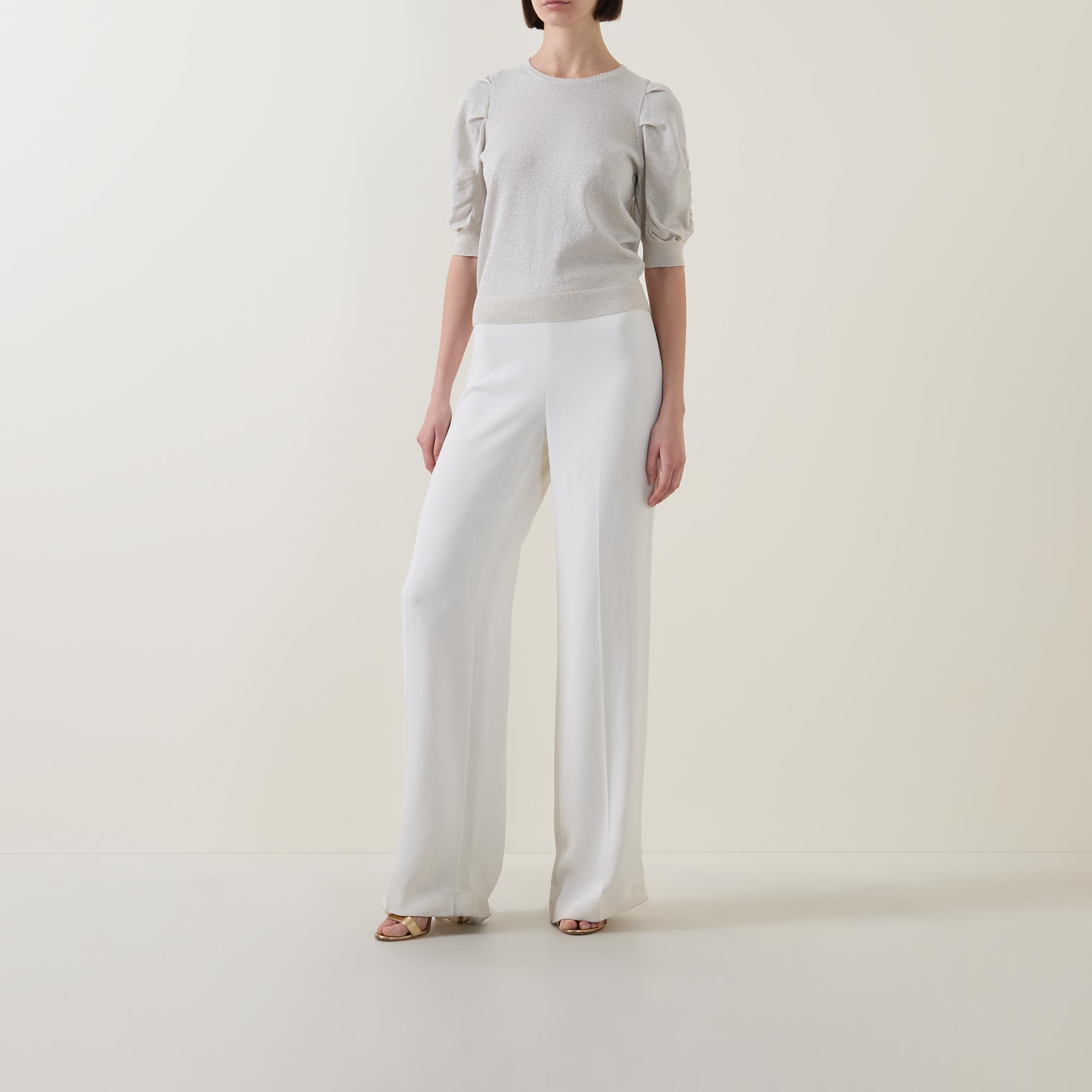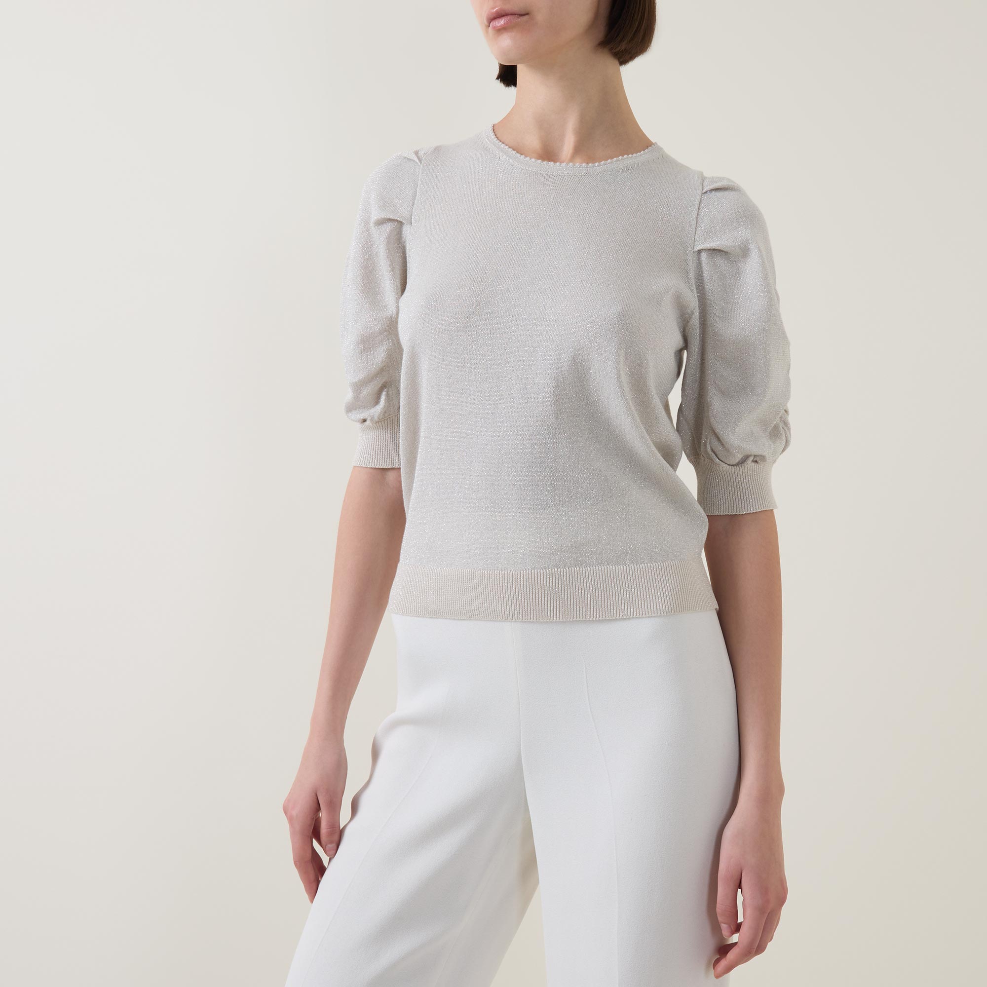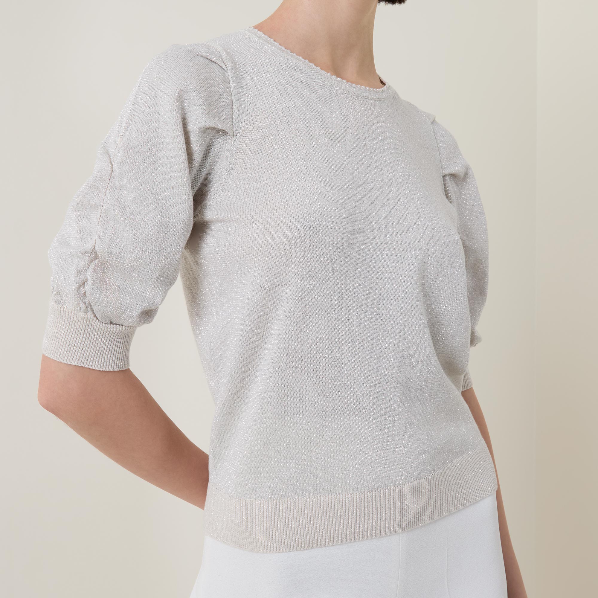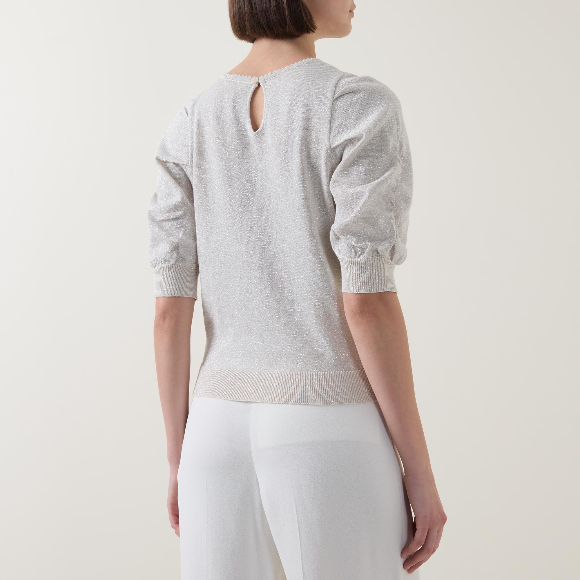 • Crew neck, rear keyhole and button fastening, half length ruched sleeves, straight hem, ribbed trims, metallic thread detailing