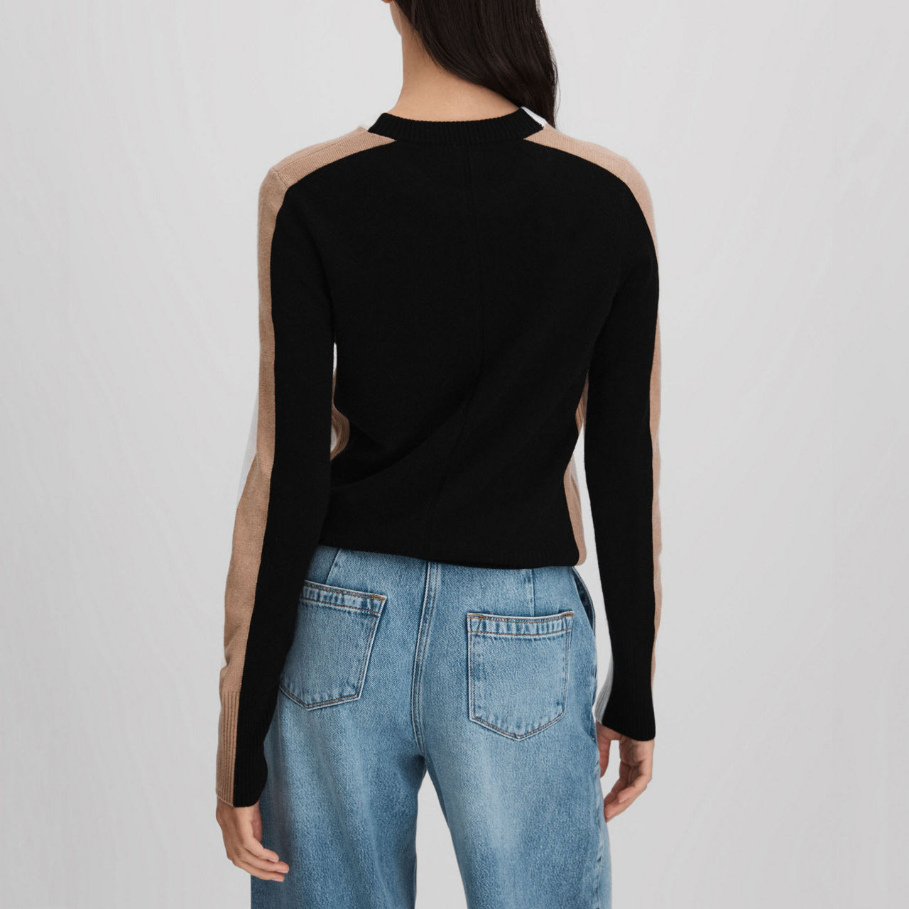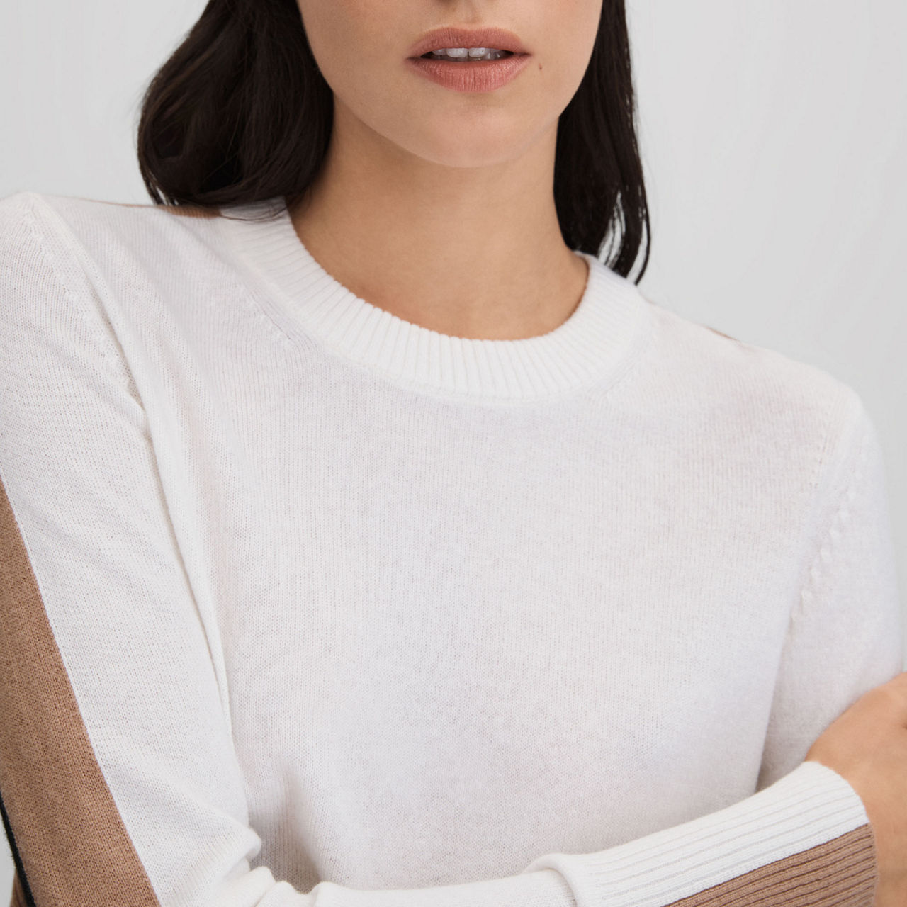 - Crew neckline, colour block design, ribbed trims, striped details, soft knit finish, long sleeves