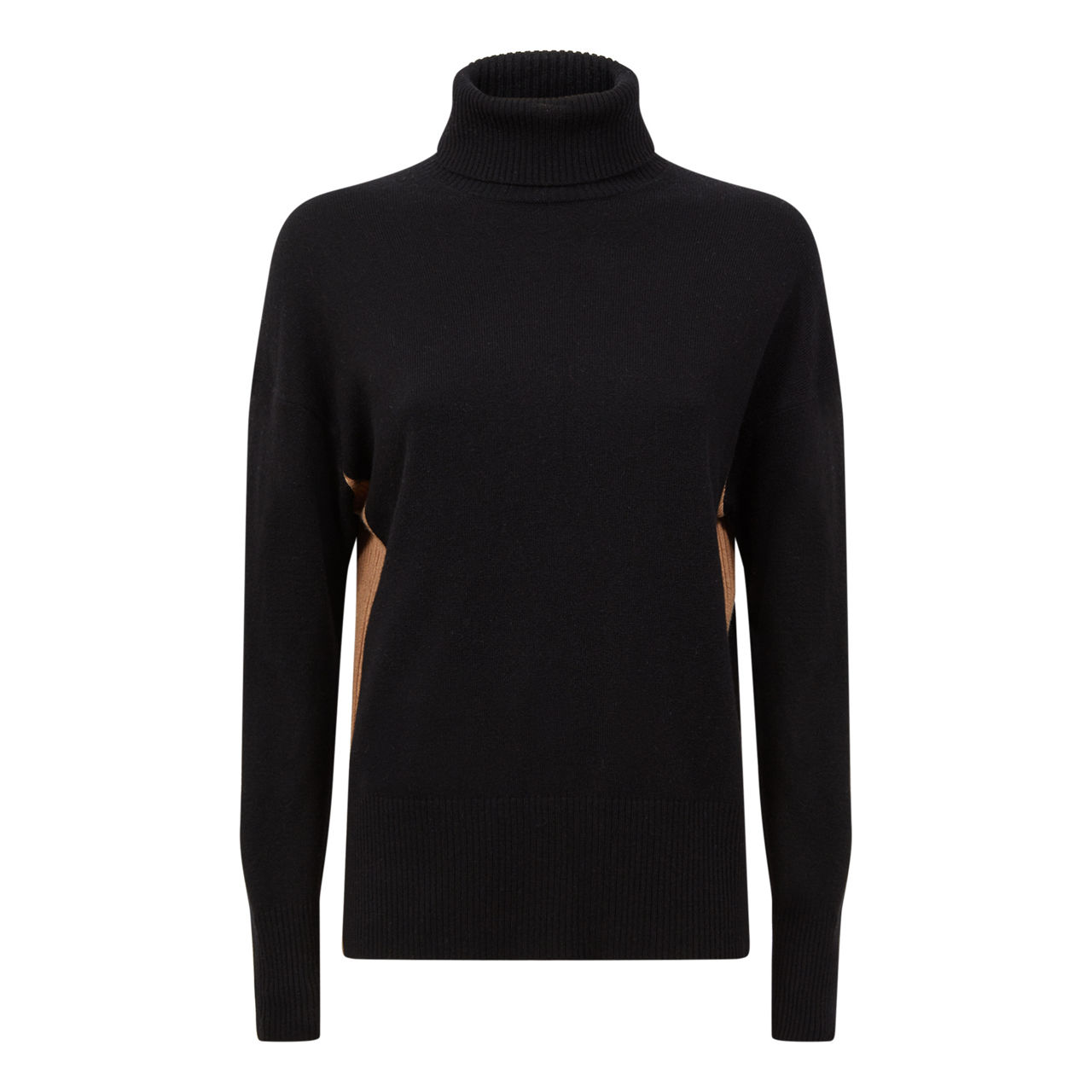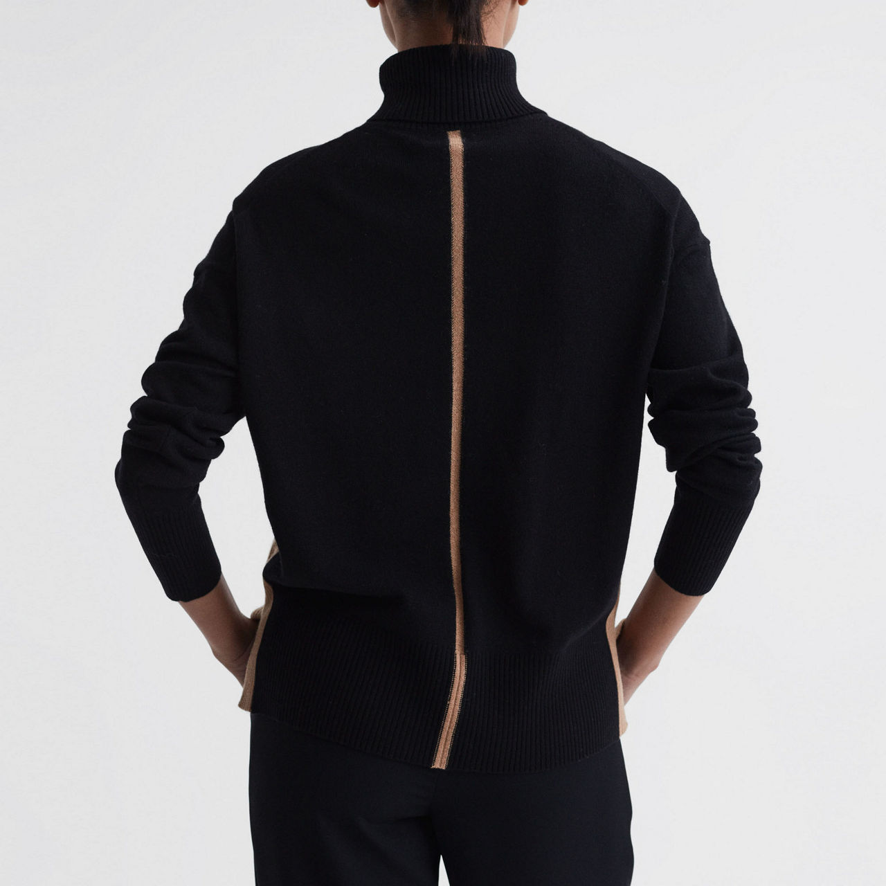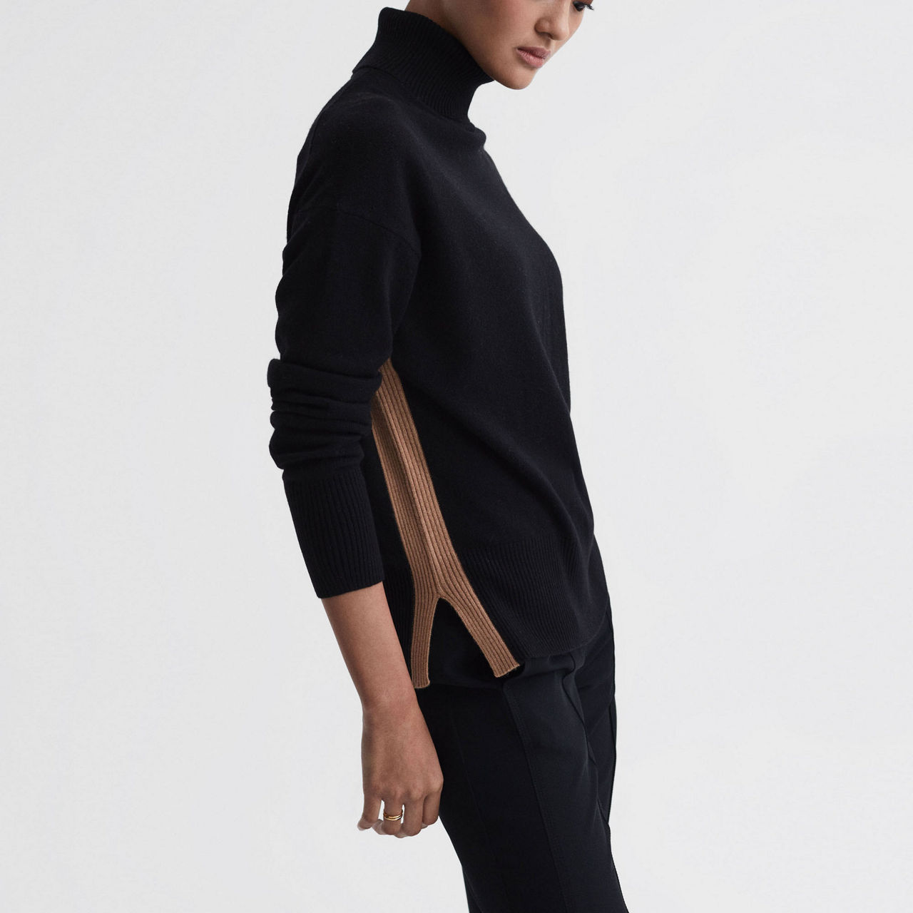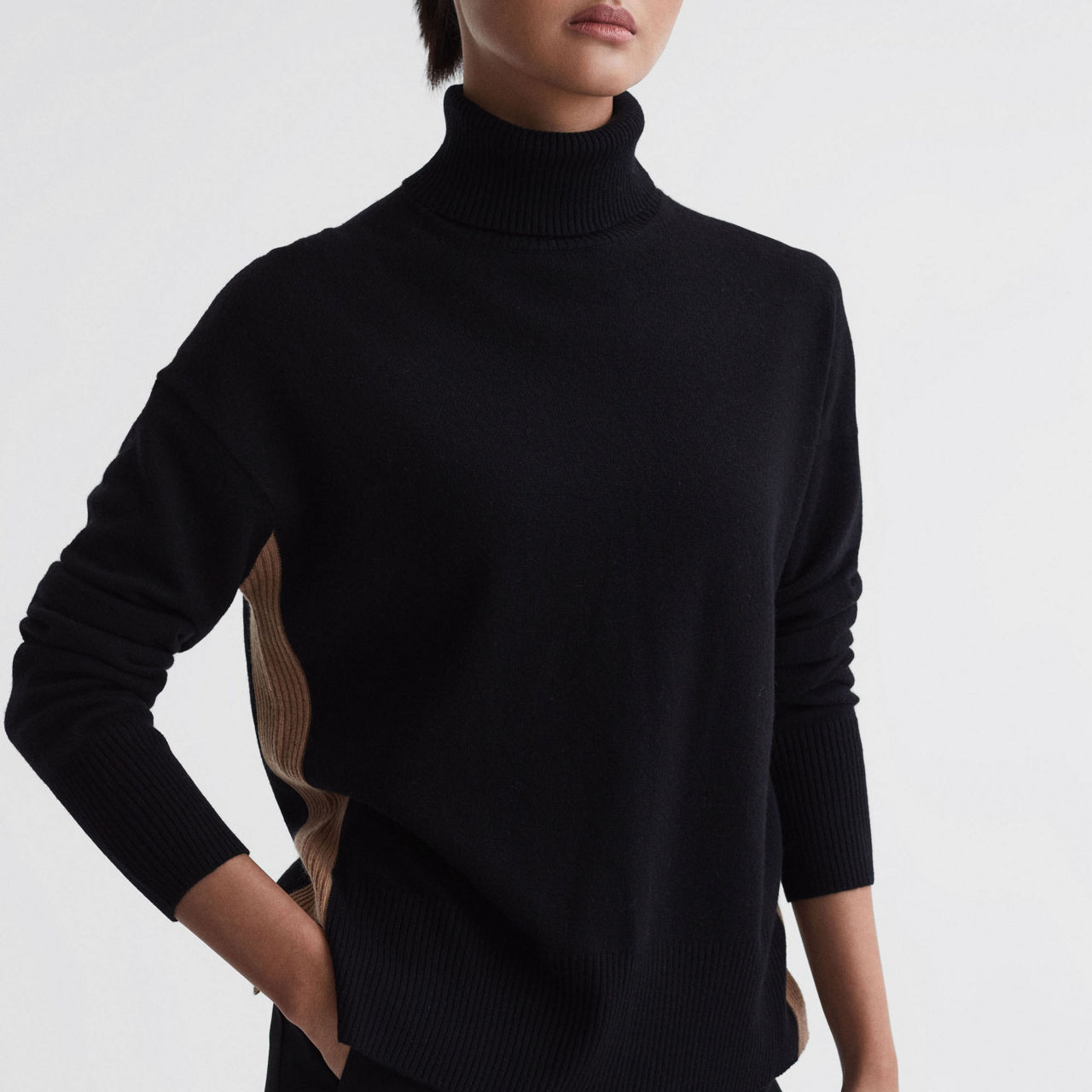 - Cashmere-wool blend, colourblock design, funnel neckline, long sleeves, ribbed trims